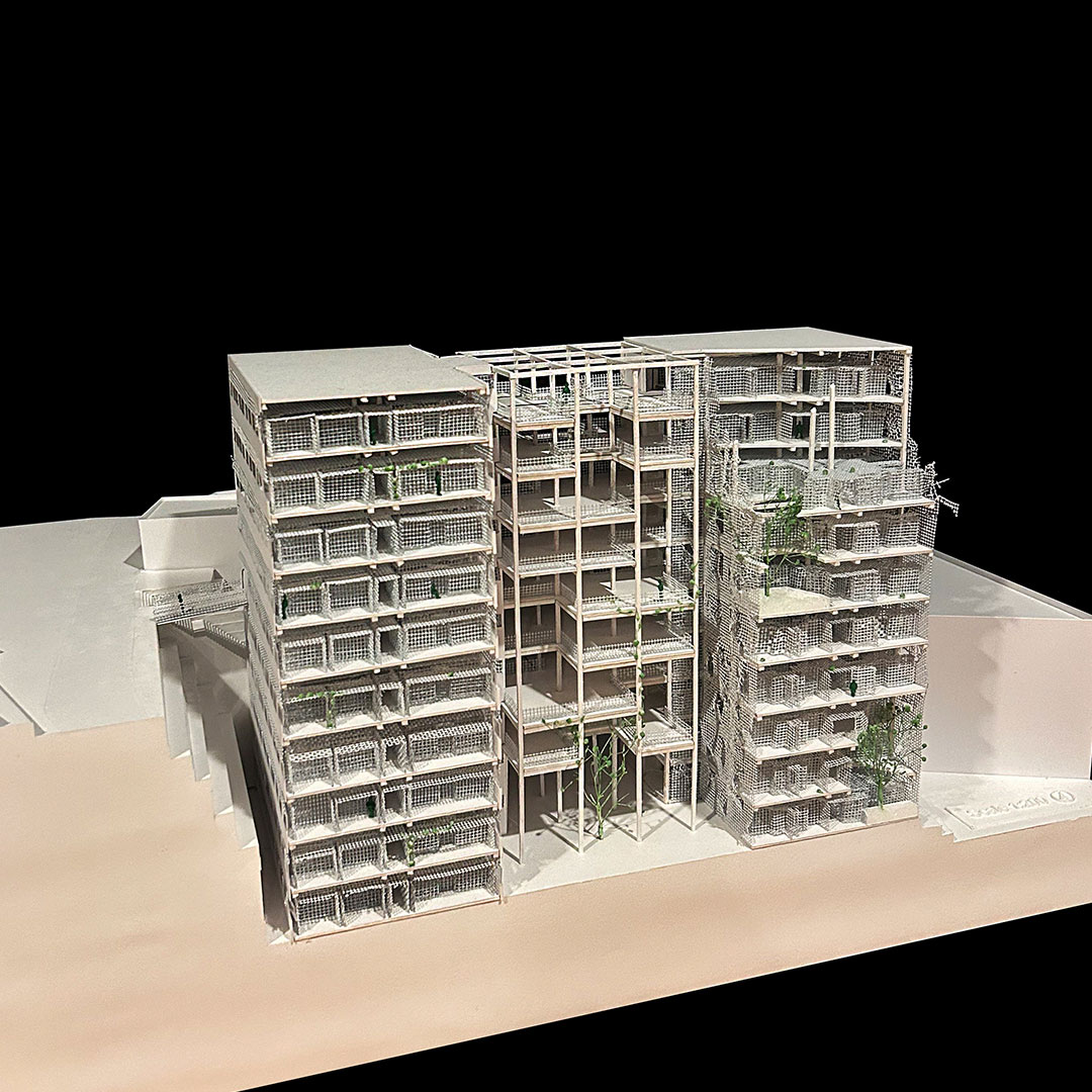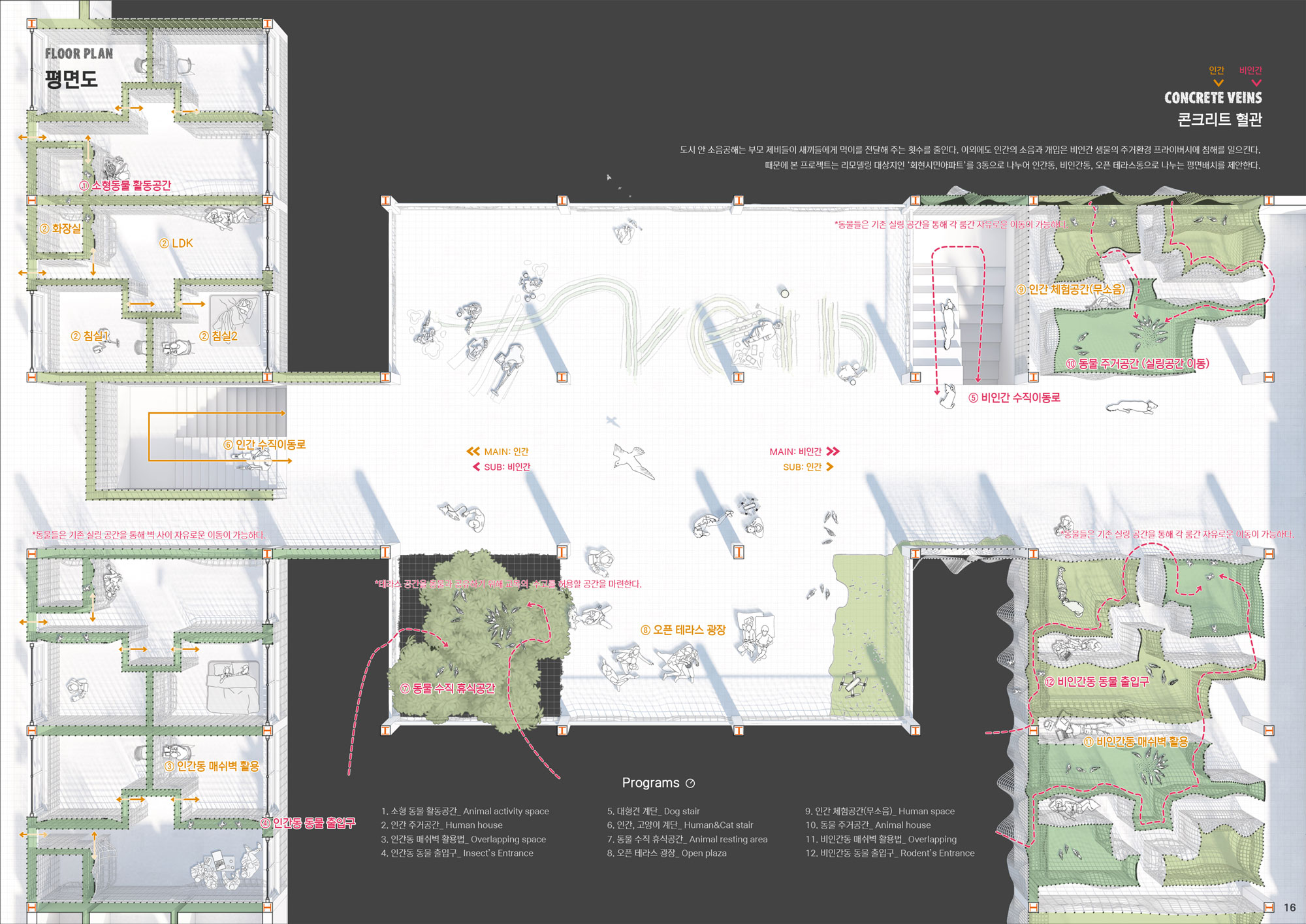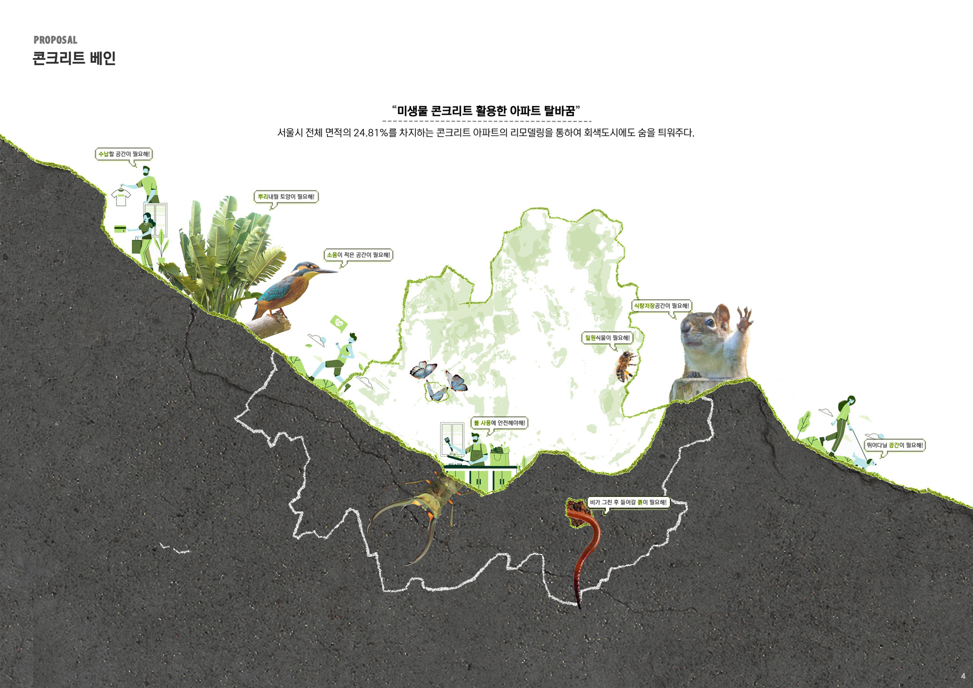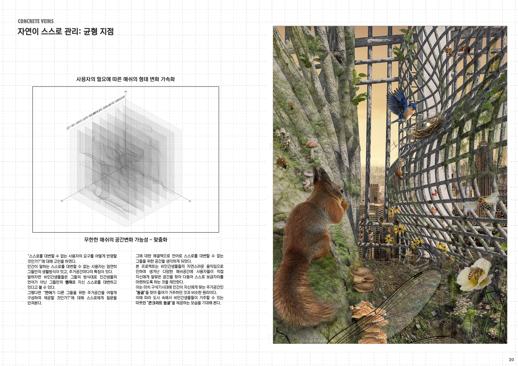‘콘크리트 베인즈’ 프로젝트는 도시의 파편화된 녹지 문제를 콘크리트 아파트로 보고, 이를 시간이 흐름에 따라 자연의 모습을 갖추는 미래의 비인간과 인간의 공존 주거 프로토타입을 제안한다.