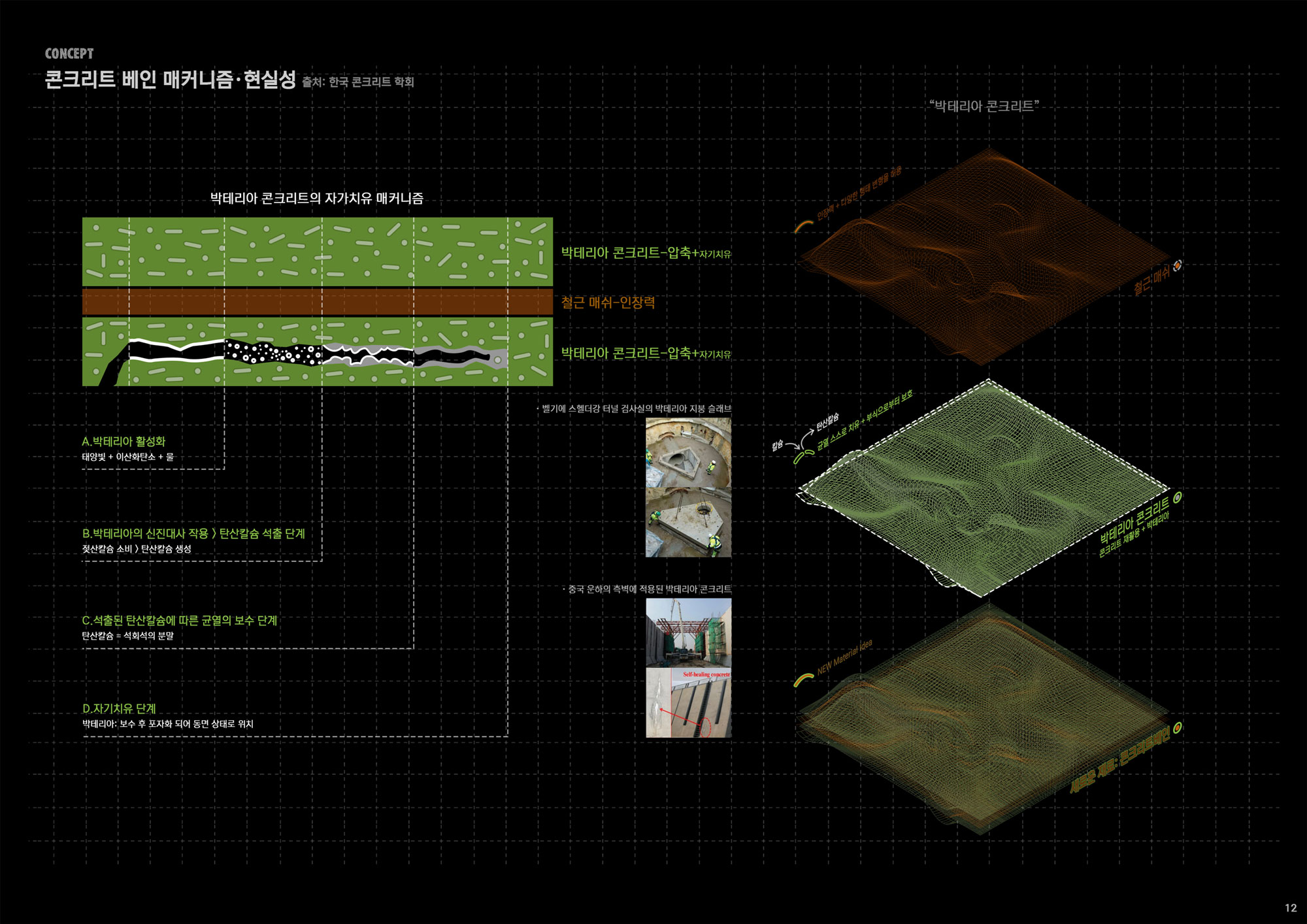 콘크리트베인즈  박테리아 콘크리트는 기존의 콘크리트 안에 박테리아를 첨가한 새로운 유형의 콘크리트이다. 콘크리트에 있던 박테리아가 광합성을 하게 되면 신진대사를 통해 석회 분말인 탄산칼슘을 형성한다. 그래서 균열이 일어났을 때 박테리아가 만들어낸 석회 분말이 균열을 메꾸는 방식이다. 메시는 기존 건물의 구조와 슬라브는 유지한 채 새로 설치된다. 인간이 1차 시공자로서 메시를 제공하면, 이후에 동물이 오랜 시간에 걸쳐 망을 변형하여 저마다의 공간을 만들어간다는 개념이다.