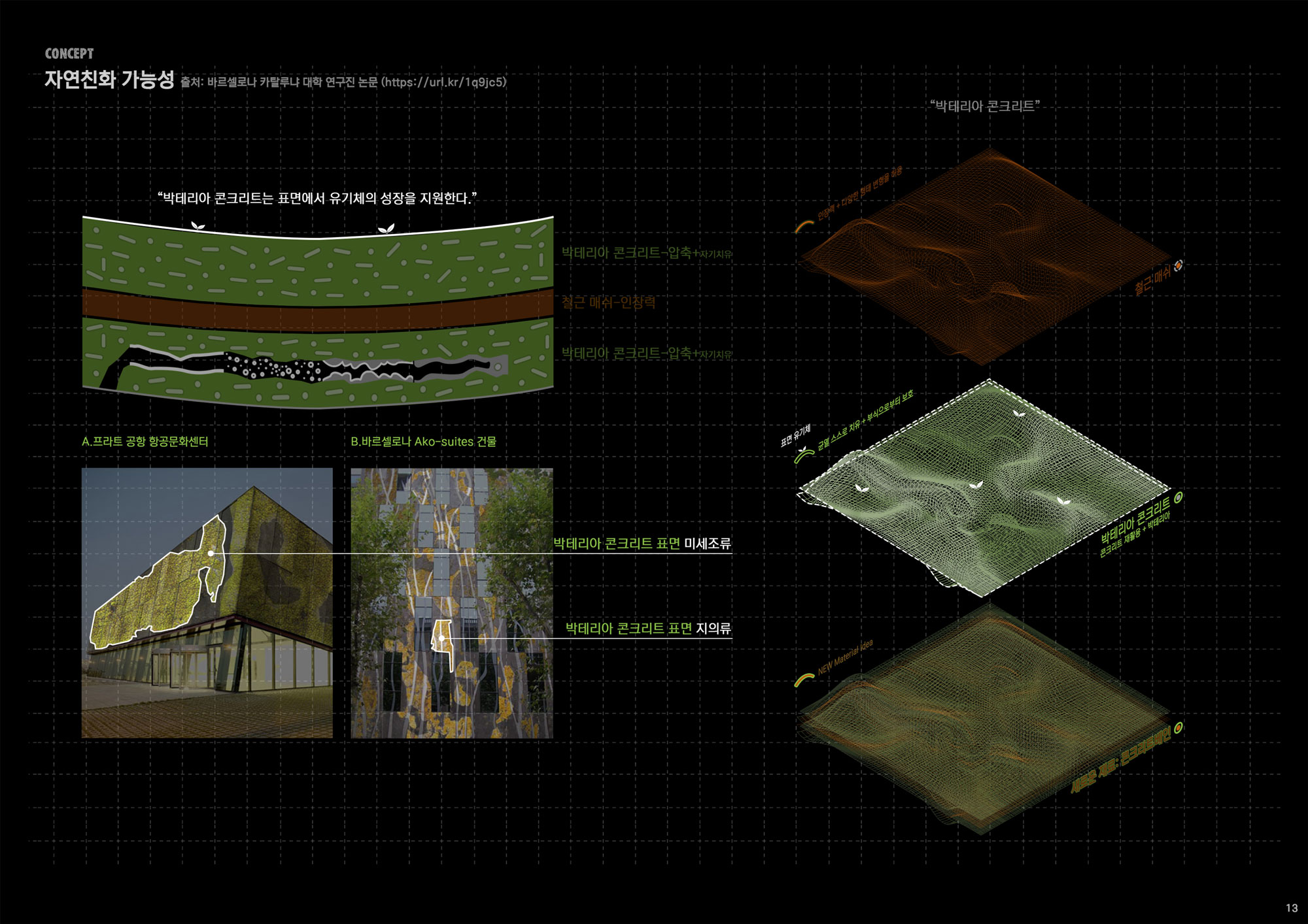본 프로젝트에서 제안하는 콘크리트 메시(mesh)는 내부 철망을 활용해 피로 하중에 대한 변형을 용인하며, 변형에 따른 외부 콘크리트의 미세한 균열을 콘크리트 속 박테리아가 치유하게 되면서 새로운 생태계의 시발점을 제공한다. 즉, 본 재료는 표면에서 유기체의 성장을 지원하기 때문에, 비인간 거주민들이 생활하게 될 긍정적 자연환경을 마련할 수 있는 장점이 있으며 비인간과의 공존에서 비인간이 접근할 수 있는 계기를 제공한다.