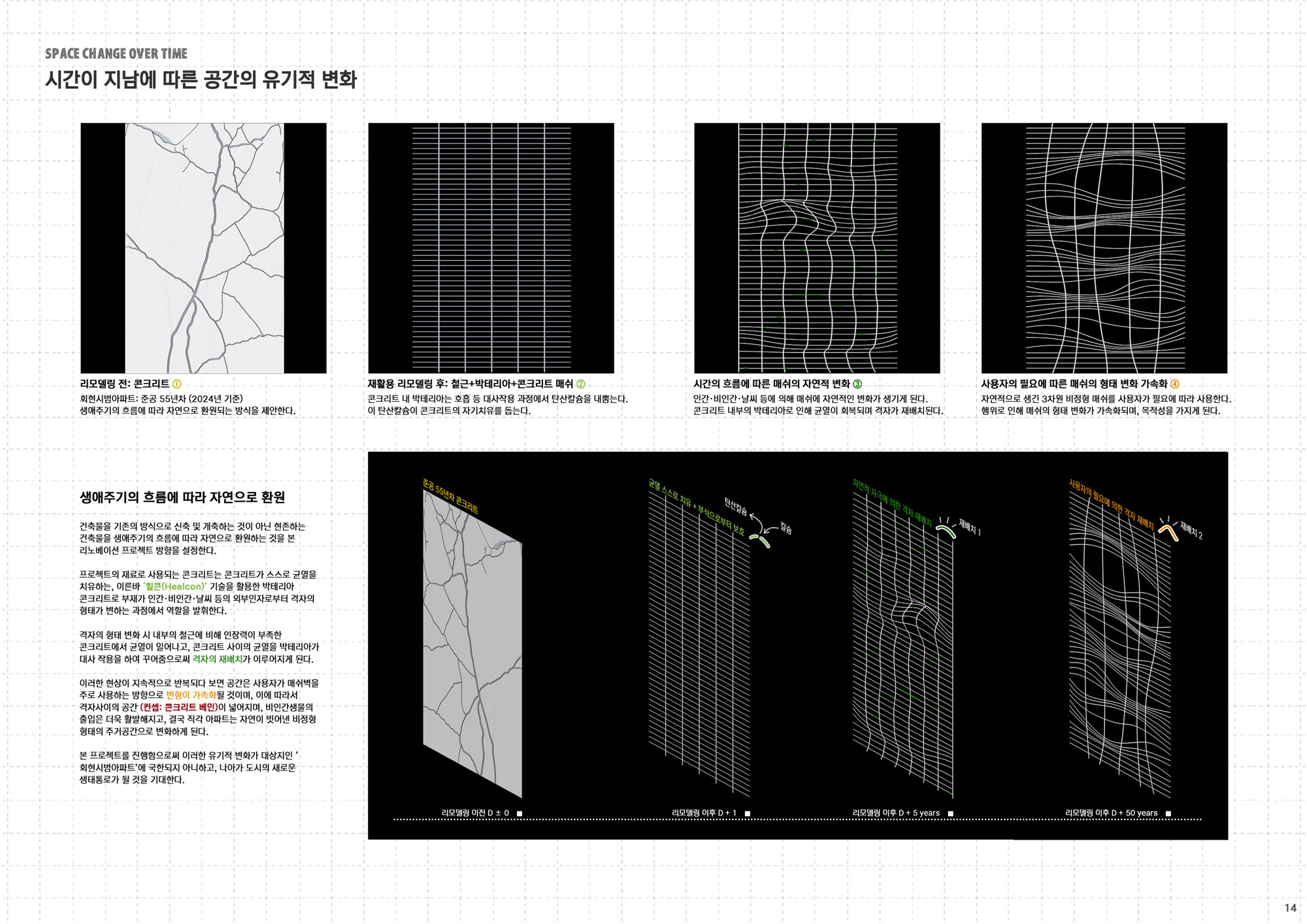 김정임  콘크리트는 시간의 흐름에 따라 자연스럽게 균열이 생기고 풍화가 될 텐데, 이 프로젝트에서는 박테리아가 콘크리트의 균열을 메꿔주고 더 단단하게 만든다. 거기에 추가적인 자재인 메시를 덧입히는 것인데, 이것이 콘크리트 베인과 무슨 관계인가?