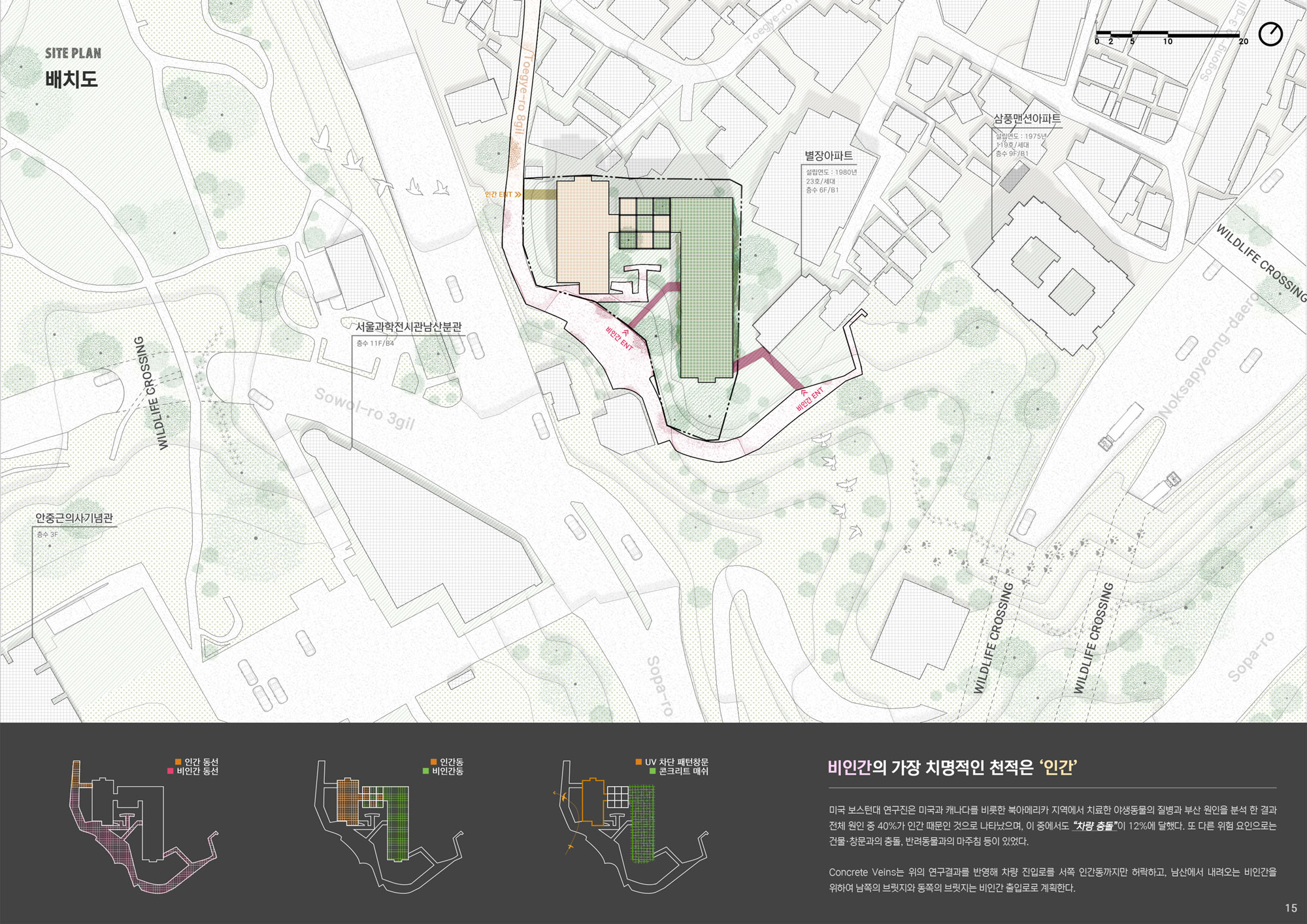 최진우  기술적인 아이디어는 충분히 이해가 가고 공감이 된다. 그런데 개발 압력이 높은 서울 한복판에서 야생동물에게도 아파트를 분양하겠다는 아이디어를 펼치게 된 계기가 궁금하다. 또 다른 지역까지 이런 상상을 펼쳐 가보자고 제안하게 된 입장에 대해서도 알고 싶다.
