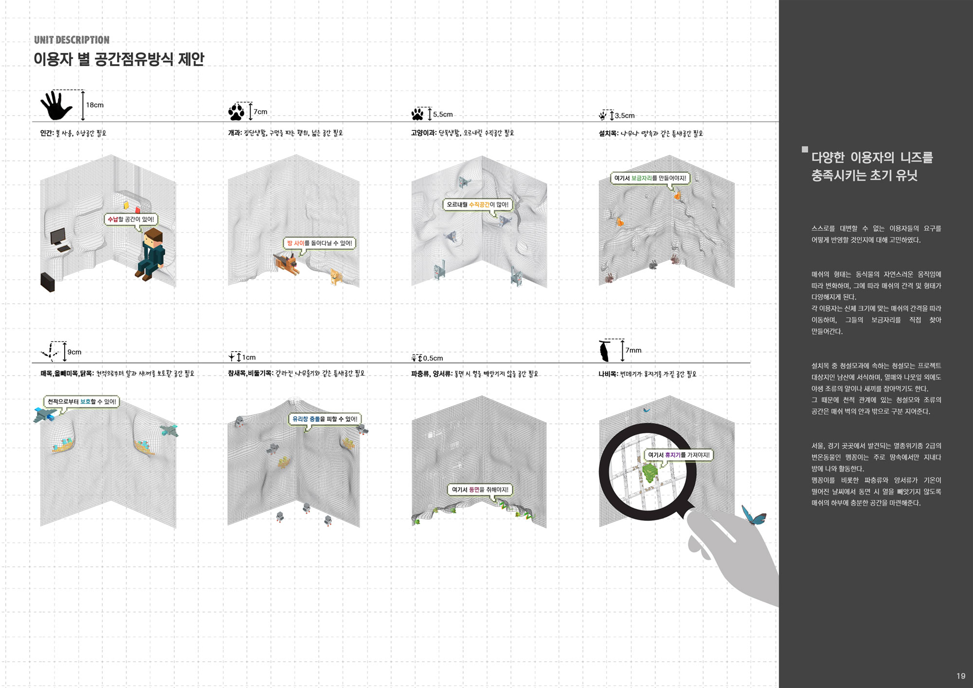 대표적으로 인간 주거동의 유닛은 메시를 인간에게 필요한 수납 및 소형가구로 대체하여 생활하는데 이는 내벽 속의 식물과 함께 생활할 수 있는 리와일딩된 주거 공간의 가능성을 가진다. 비인간 주거유닛은 가변형 메시를 통해 개인 맞춤화된 주거 공간을 형성함으로써 천적으로부터 보호받을 수 있는 공간(안식처)이 된다. 또한 실링 사이의 공간은 비인간이 자유롭게 이동할 수 있어 비인간 동의 모든 공간에 대한 접근이 가능하며 이는 비인간이 거주뿐만 아니라 다양한 활동을 할 수 있음을 강조한다.
