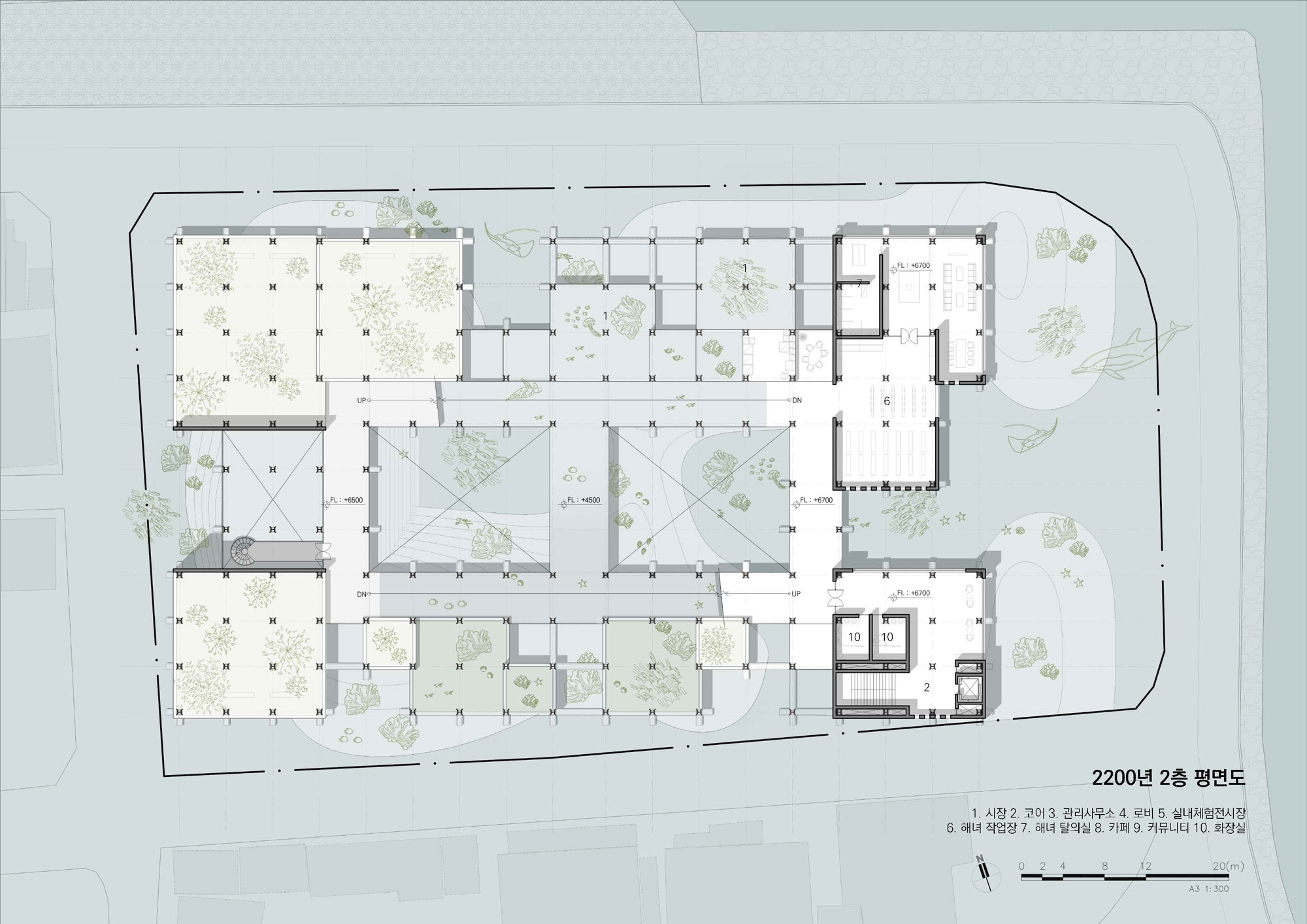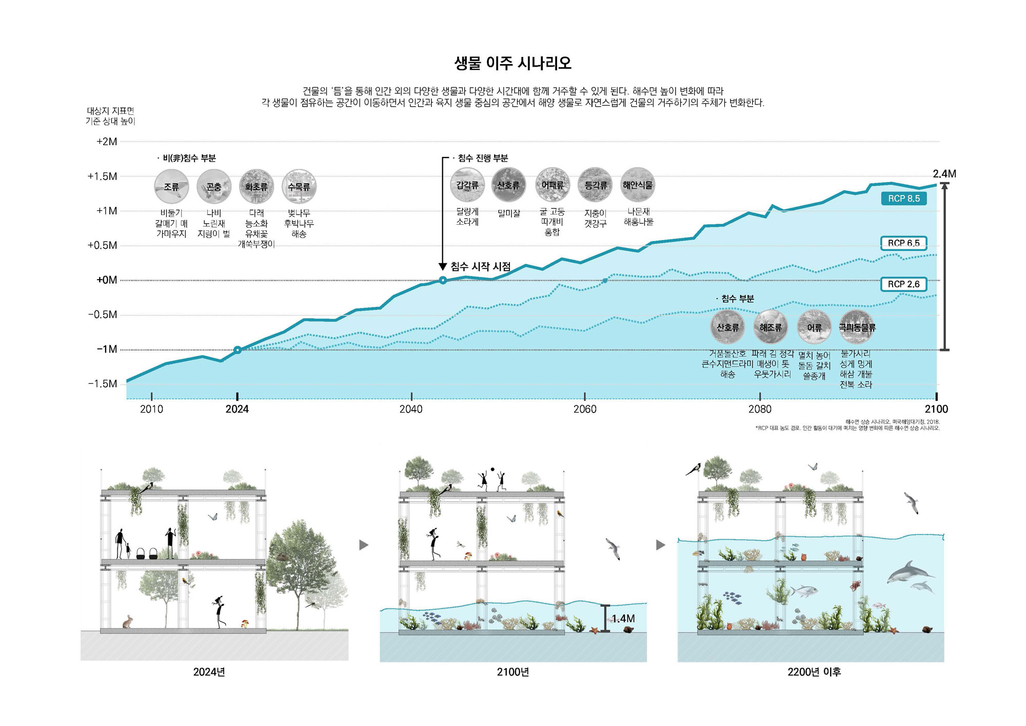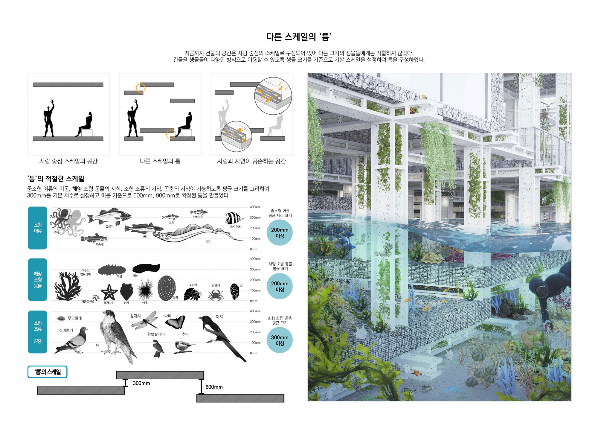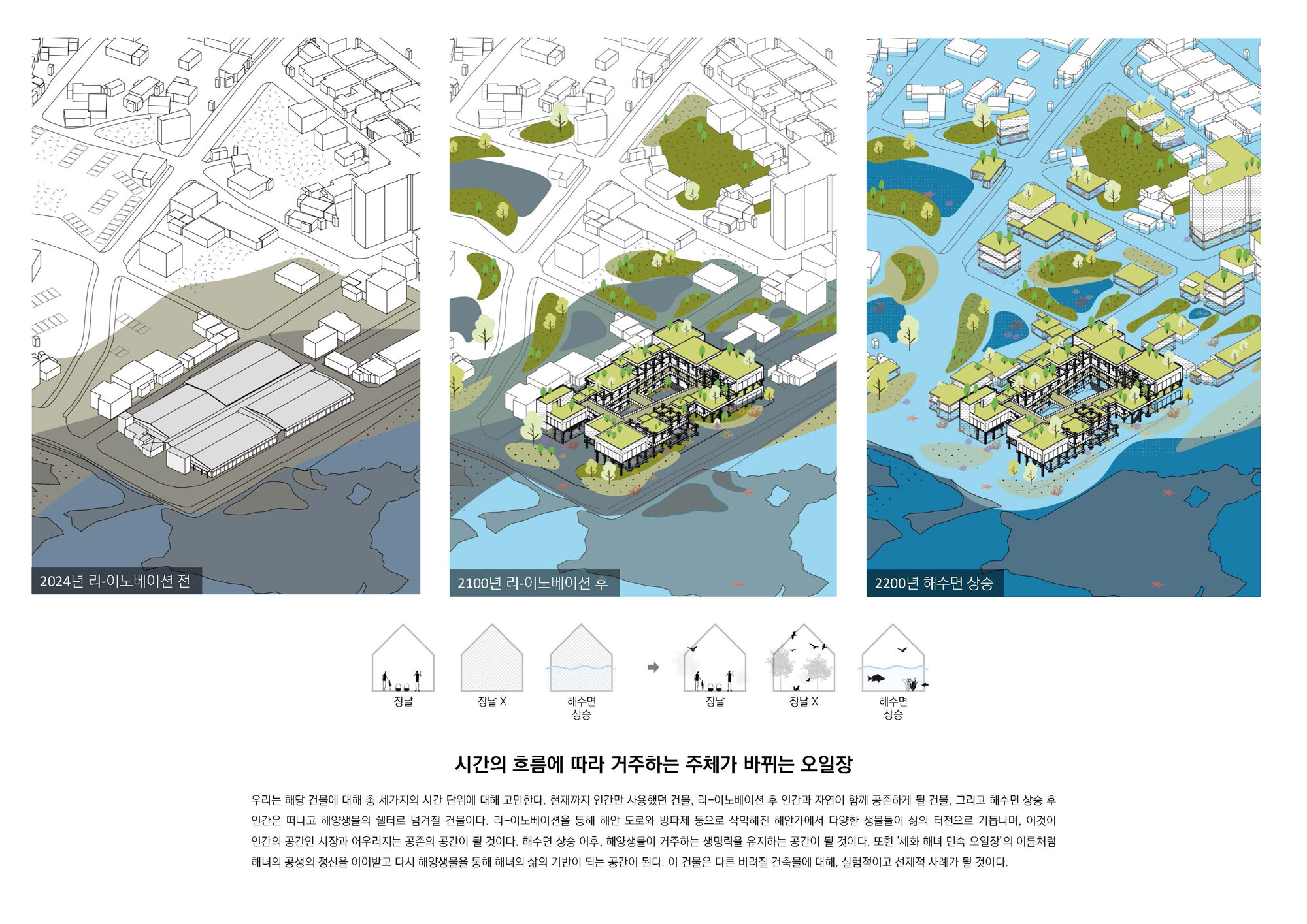 장날에는 사람들이 공간을 채우고 이용할 것이며 해녀의 쉼터와 해초건조장은 자연과 함께하는 생산의 공간으로 작동할 것이고, 생물들은 틈에서 각자 다양한 방식으로 거주하게 된다. 이를 통해 건물은 방치되지 않고 새로운 삶의 터전이 된다. 해수면 상승에 따라 인간을 포함한 각 생물이 점유하는 공간이 자연스럽게 이동하게 되고, 결과적으로 건물에 거주하는 주체가 변하게 된다. 소라가 죽어도 여전히 소라게의 안식처인 소라껍데기처럼, 다른 생명체가 거주할 수 있는 가능성을 품은 세화해녀민속오일장은 해수면 상승 이후에도 여전히 생명력을 유지하고 있을 것이다.