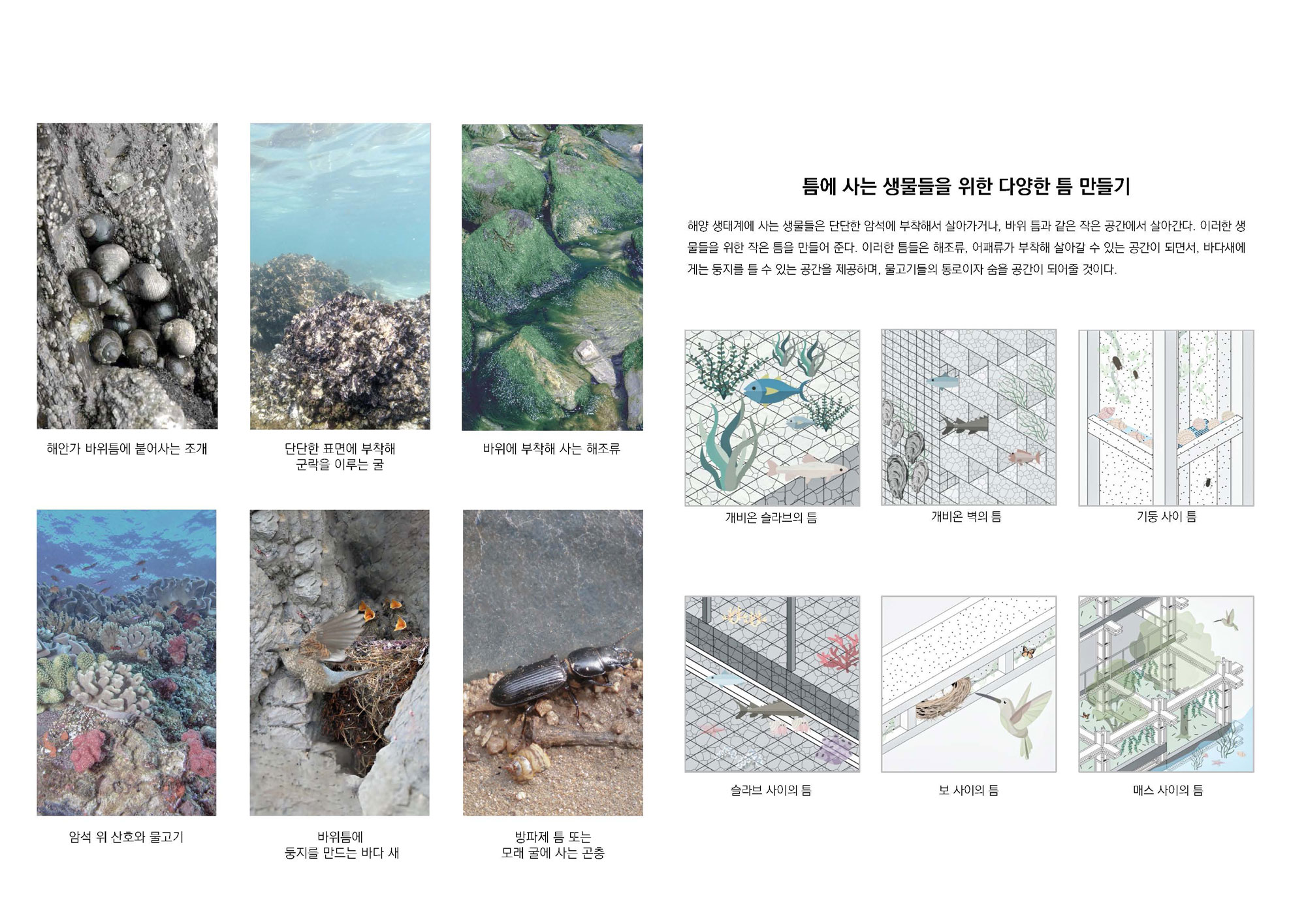 물속의우리 해안 생태계에 대한 문헌조사를 통해 많은 생물이 암반에 붙어 생활한다는 점을 확인했다. 대상지에 암반과 모래가 충분했기에 다른 곳보다 대상지로서 적합했다. 그리고 포장이 잘 된 콘크리트 건물에서 해양생물에게 안 좋은 탄산 칼슘이 방출된다는 것을 연구를 통해 확인했다. 그래서 오일장 건물에 개비온을 활용하거나 틈, 거친 표면을 형성하여 해양생물이 더 원활하게 활용할 수 있는 쉘터가 되도록 설계했다.