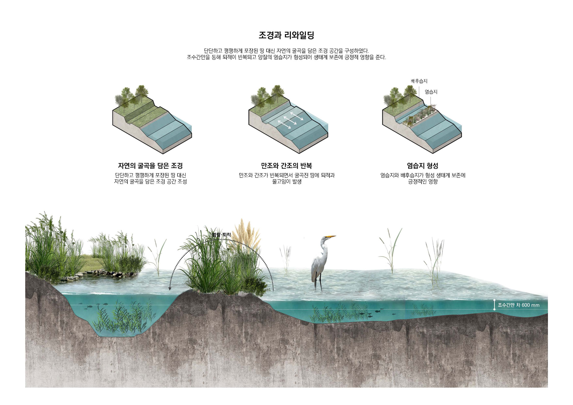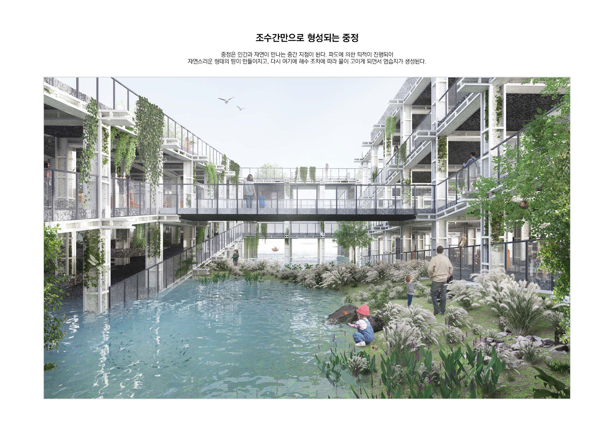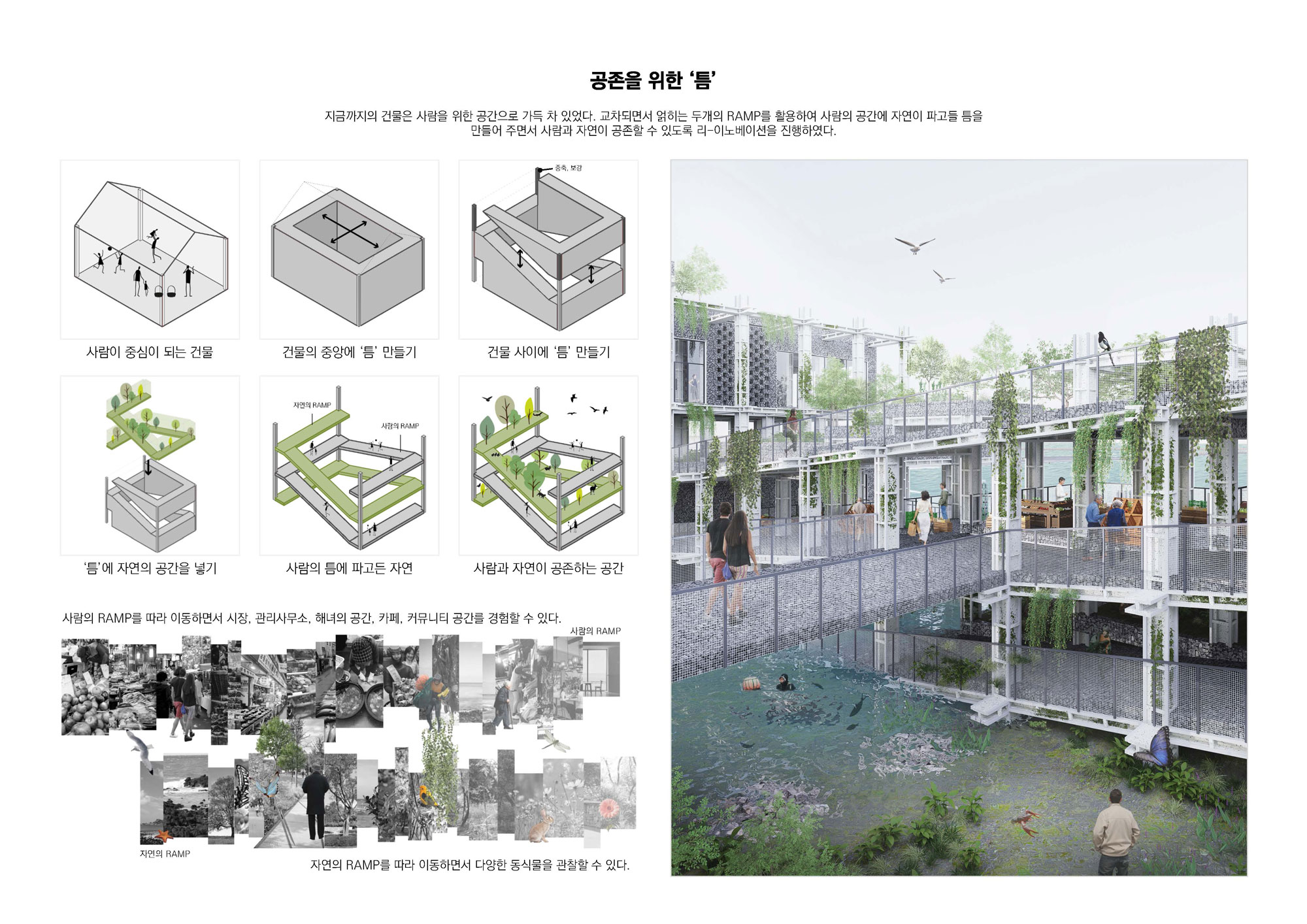 사람만 존재하던 기존 건물 전체에 틈을 만들고 두 개의 교차되는 램프를 설치하였다. 하나는 사람이 시장으로 사용하는 공간을 잇고, 하나는 자연의 공간들을 잇는다. 두 램프를 사용하여 자연과 사람이 서로의 생활환경을 위협하지 않으면서 공존할 수 있다. 중정은 인공 구조물로 채우는 대신 굴곡진 조경공간으로 구성하여 자연 해안선을 만든다. 이는 만조와 간조가 반복되면서 범람 퇴적 과정이 발생하고, 결과적으로 염습지가 형성되어 생태계에 긍정적인 영향을 줄 것이다.