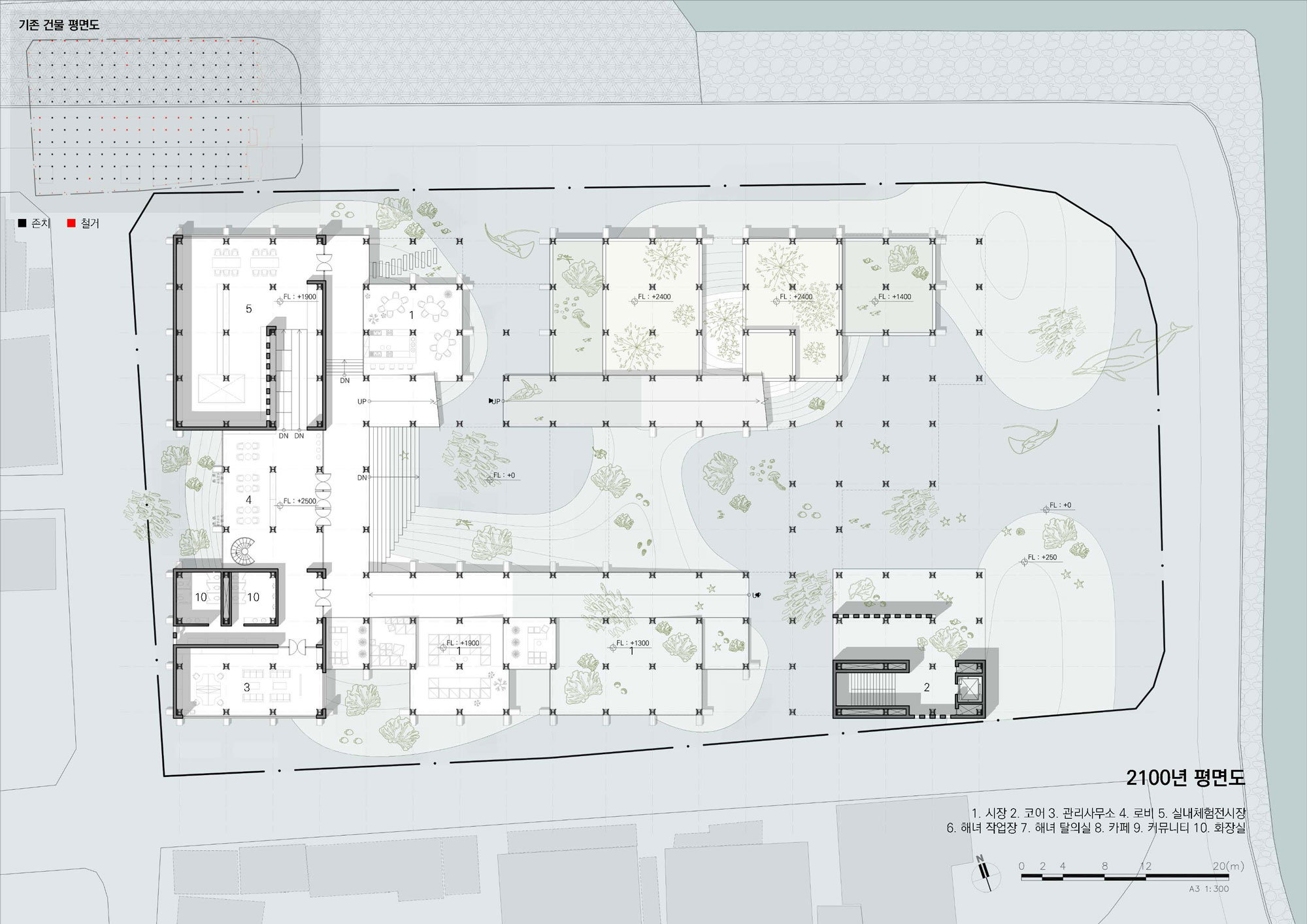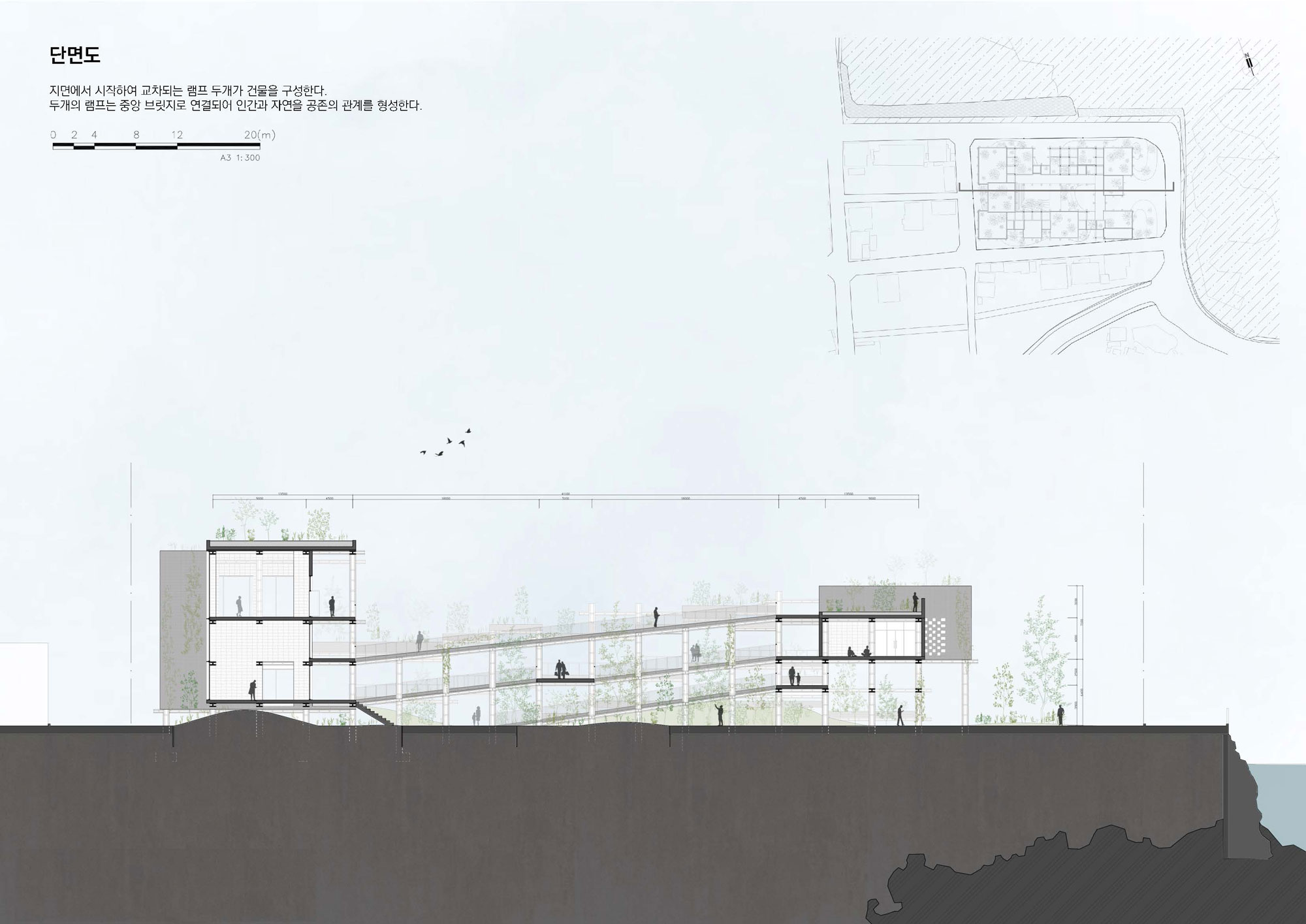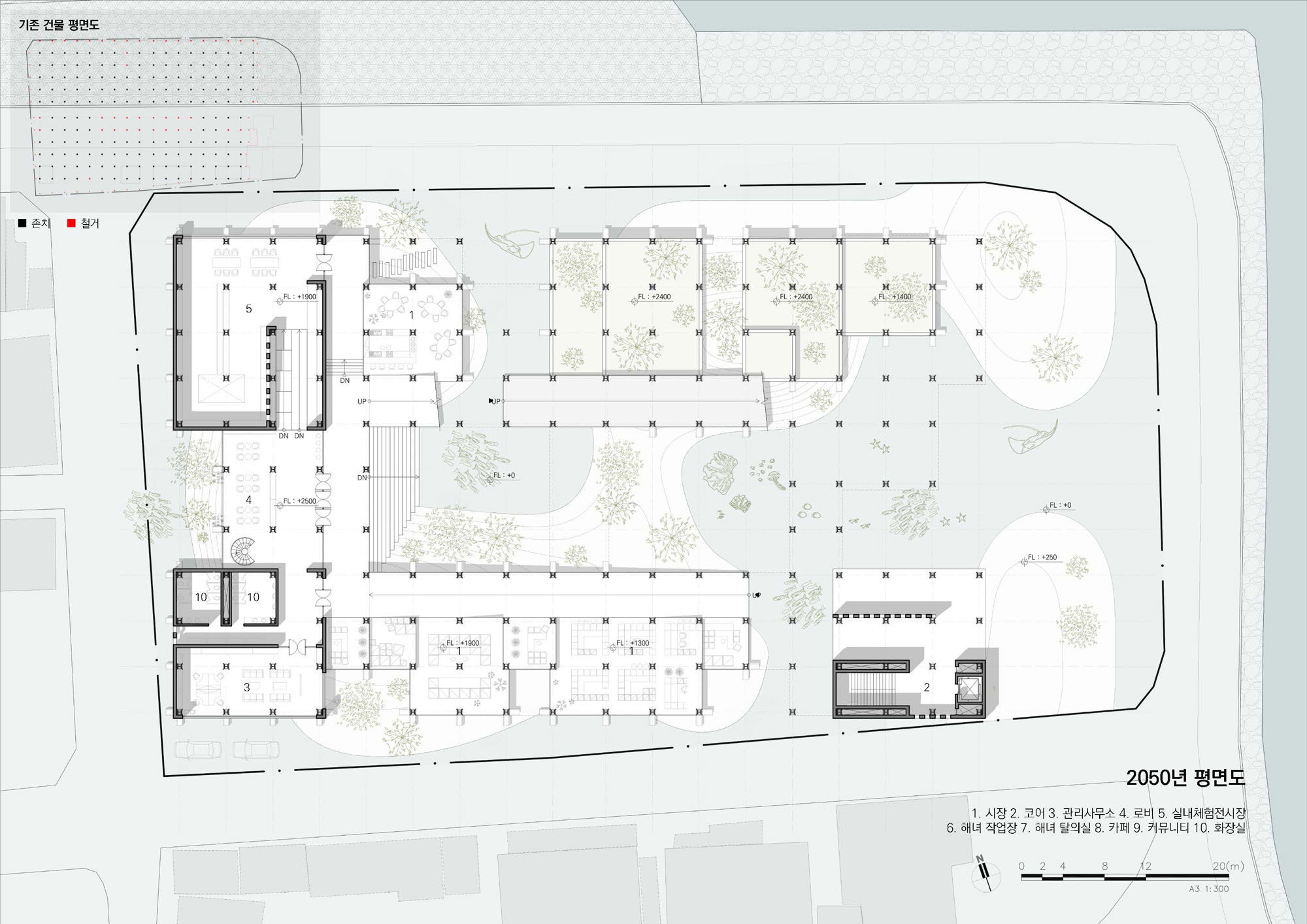 사람만 존재하던 기존 건물 전체에 틈을 만들고 두 개의 교차되는 램프를 설치하였다. 하나는 사람이 시장으로 사용하는 공간을 잇고, 하나는 자연의 공간들을 잇는다. 두 램프를 사용하여 자연과 사람이 서로의 생활환경을 위협하지 않으면서 공존할 수 있다. 중정은 인공 구조물로 채우는 대신 굴곡진 조경공간으로 구성하여 자연 해안선을 만든다. 이는 만조와 간조가 반복되면서 범람 퇴적 과정이 발생하고, 결과적으로 염습지가 형성되어 생태계에 긍정적인 영향을 줄 것이다.
