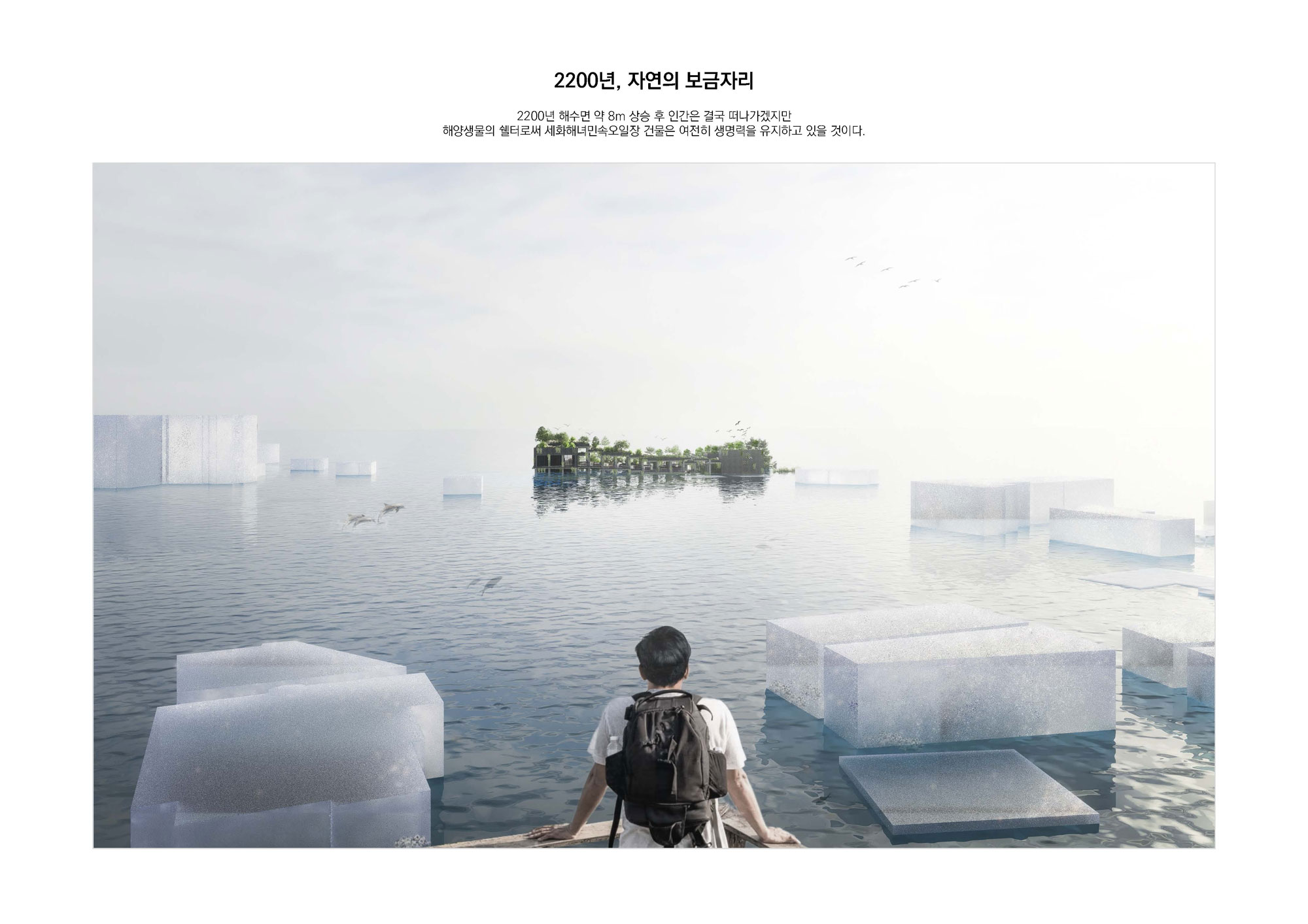 소라껍데기는 소라가 죽어도 여전히 소라게의 안식처가 되어 생명력을 유지한다. 소라껍데기처럼 다른 생명체가 거주할 수 있는 가능성을 열어 둔다면, 건물이 바다속으로 잠기더라도 여전히 다른 생명체들의 쉘터 역할을 할 수 있을 것이다.