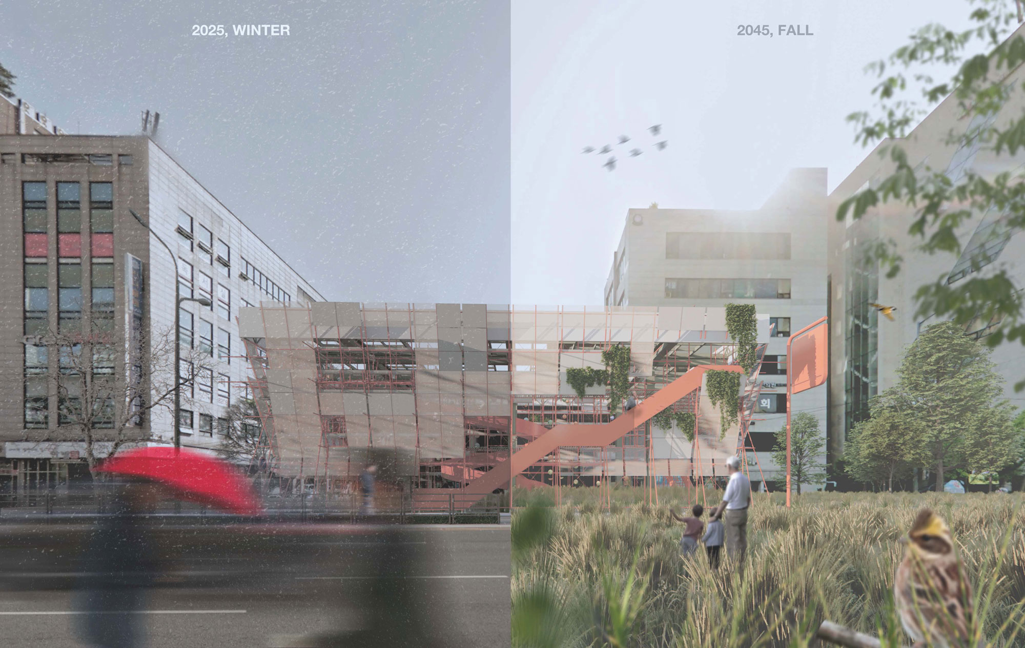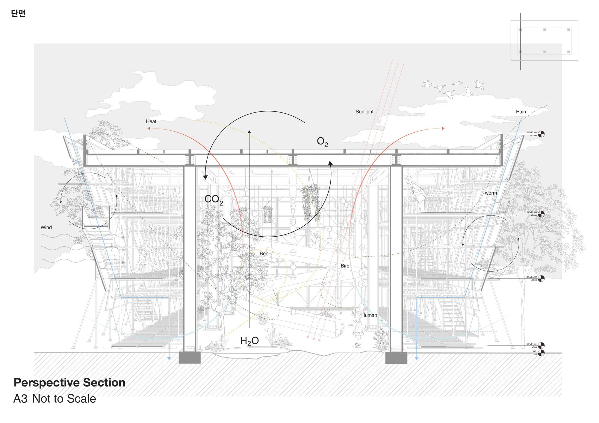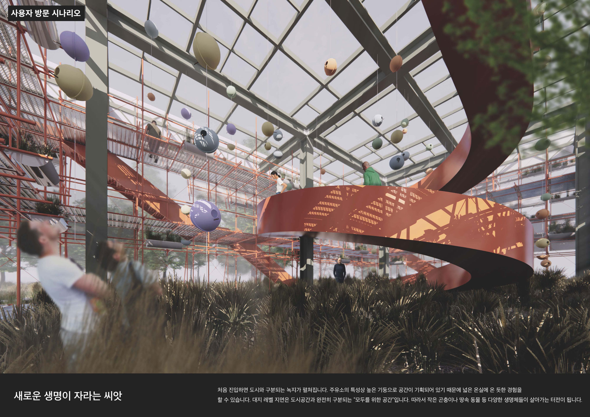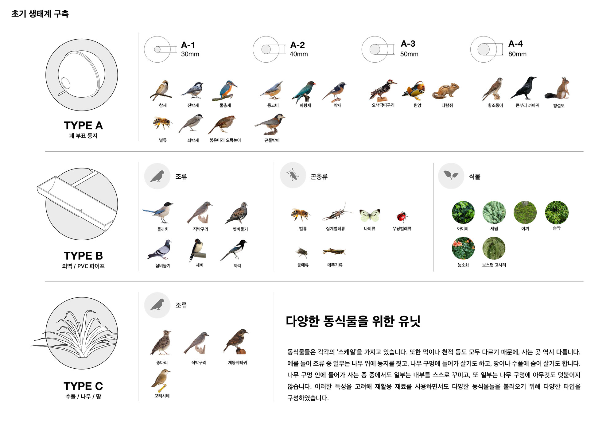 생물 네트워크가 형성되는 충분한 시간을 고려하여, 자연스럽게 찾아오는 동식물들이 내부의 생태계를 이루도록 하였다. 초기에는 소형 비행 생물들이 찾아오다, 먹이를 찾아온 주변 자연환경의 동물들이 모이고, 서로 분리되어 있던 동물들의 활동 권역이 겹치며 거대한 생명 공동체를 만들도록 하였다. 초기에 찾아오는 동식물들을 도시의 위험으로부터 보호하기 위해 도로 분진 차단에 효과적인 곰솔 등의 식재와 폐기물을 활용한 인공 둥지 등을 조성해 두었다가, 점차 인간의 개입이 사라지는 방향으로 계획하였다.
