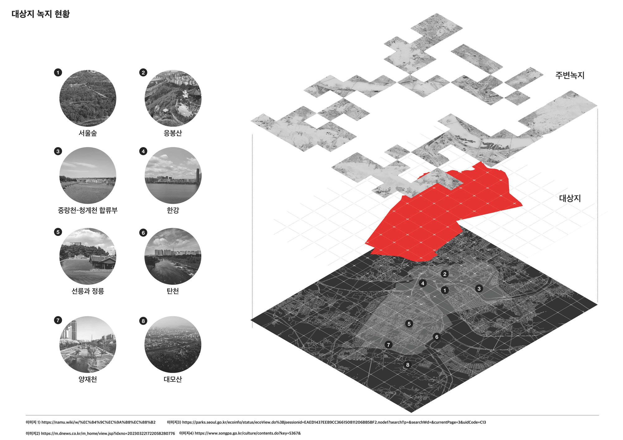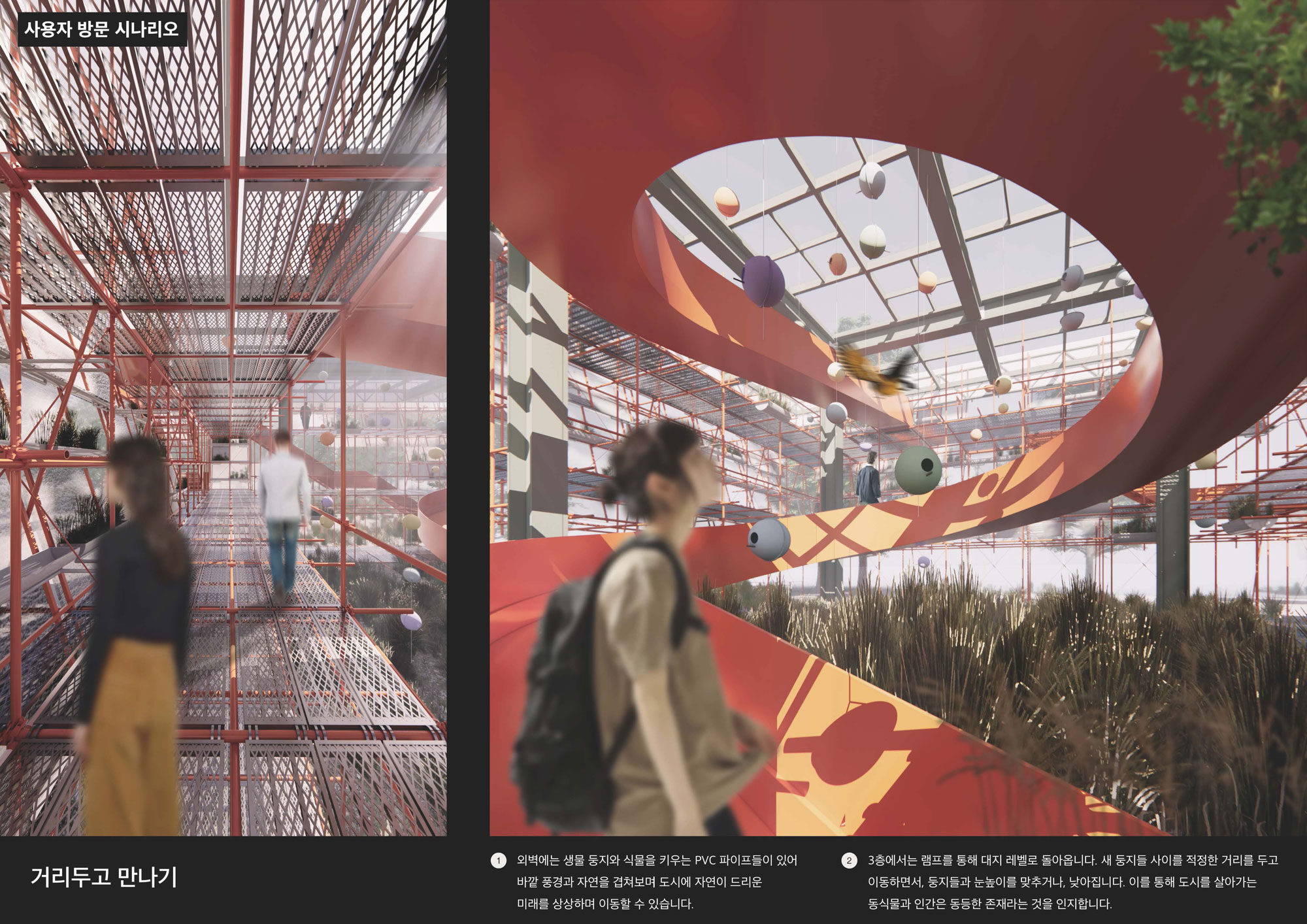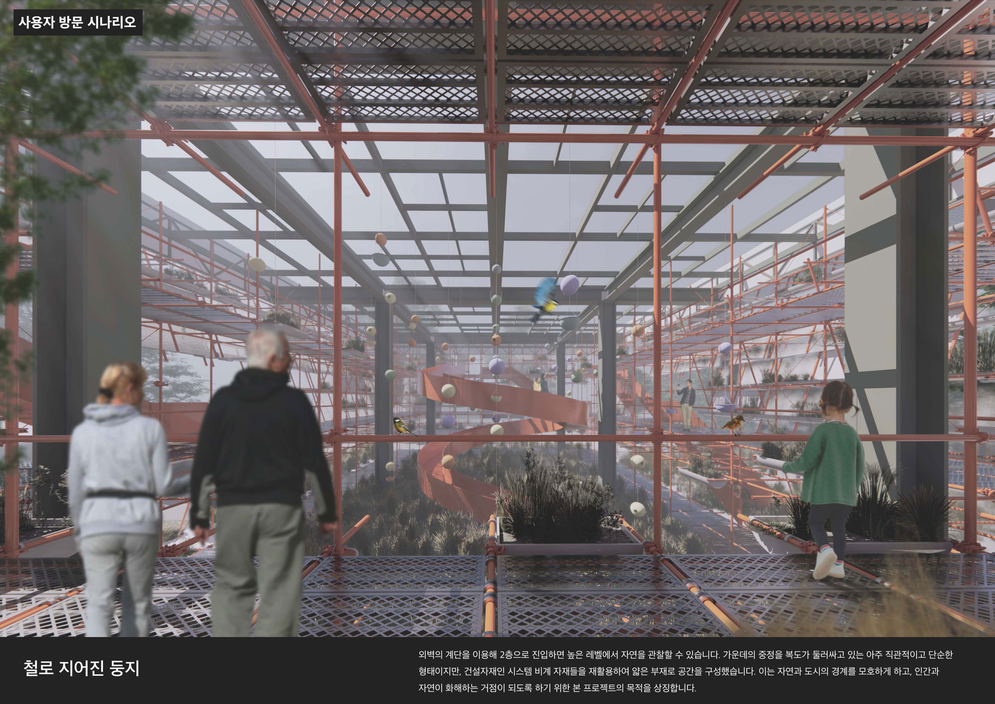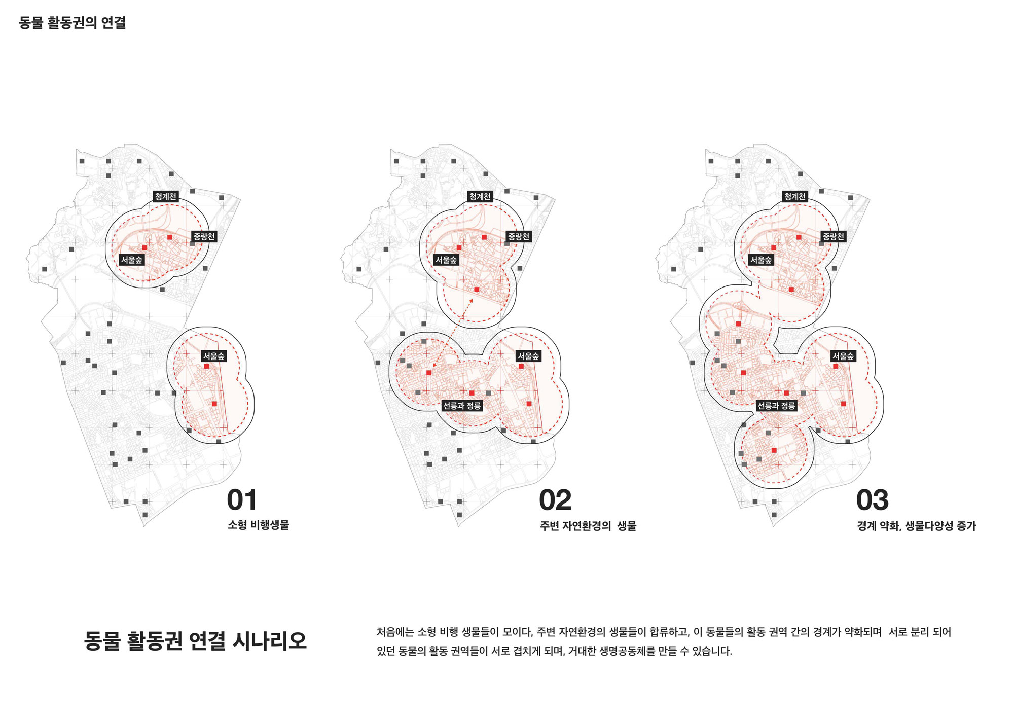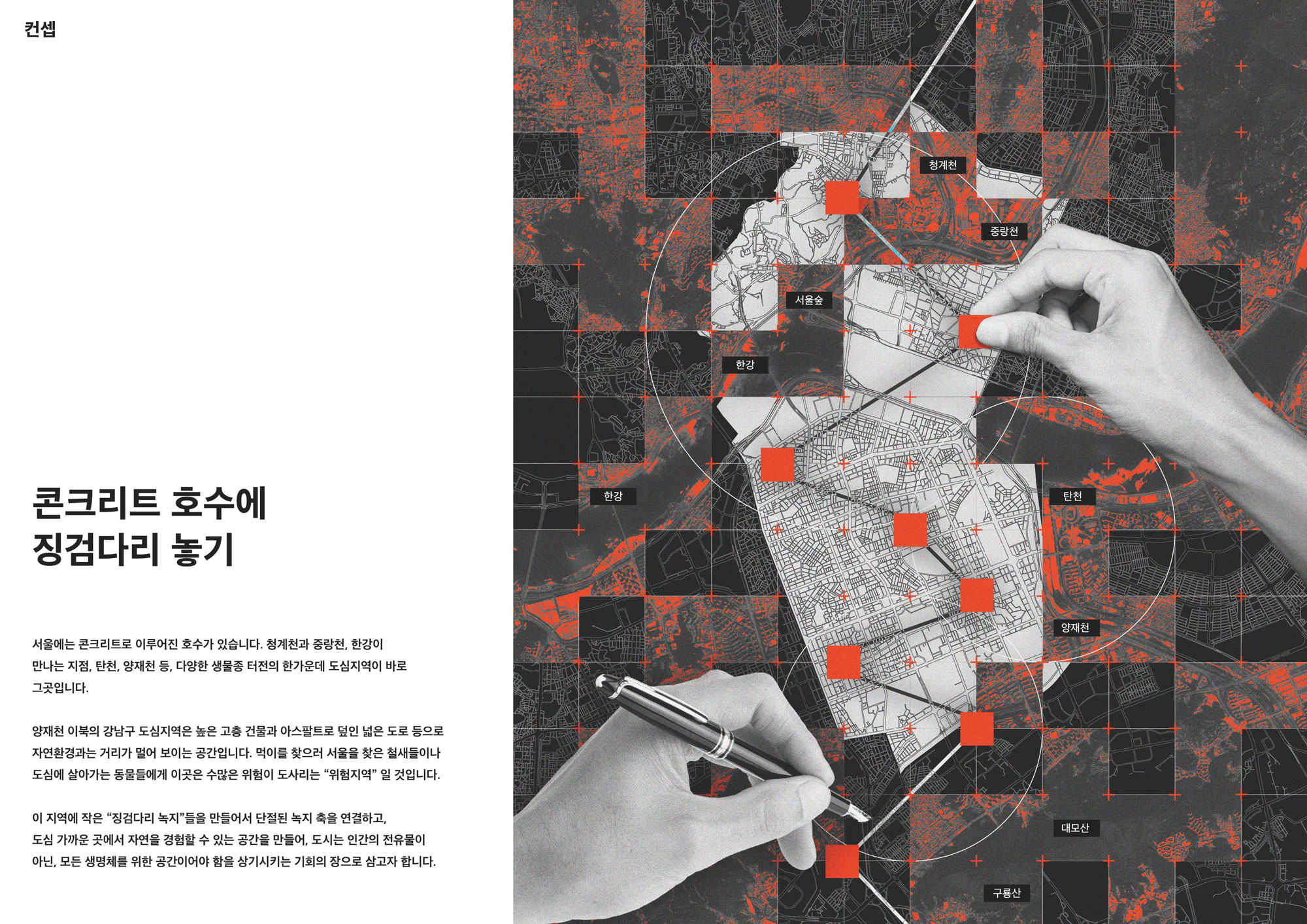 대부분의 건축물은 인간만을 고려하여 설계된다. 서울 강남의 도심지역은 건축물에 대한 개념이 없는 비인간 종 동물들에게 수많은 위험이 도사리는, 건널 수 없는 콘크리트 호수와 같다. 본 프로젝트에서는 양재천, 탄천, 서울숲 등 도심 주변의 다양한 서식지에서 살아가는 비인간 종 동물들이 안전하게 도심지역을 건널 수 있도록, 도심지역에 징검다리 녹지들을 설치하는 것을 목적으로 진행되었다. 작은 녹지들을 도심 내에 고르게 배치하여 단절된 녹지축을 재연결하고, 도심 가까운 곳에서 자연을 경험할 수 있는 공간을 만들어, 도시를 인간의 전유물이 아닌, 모든 생명체를 위한 공간으로 ‘리와일딩’하기 위한 기회의 장으로 삼고자 하였다.