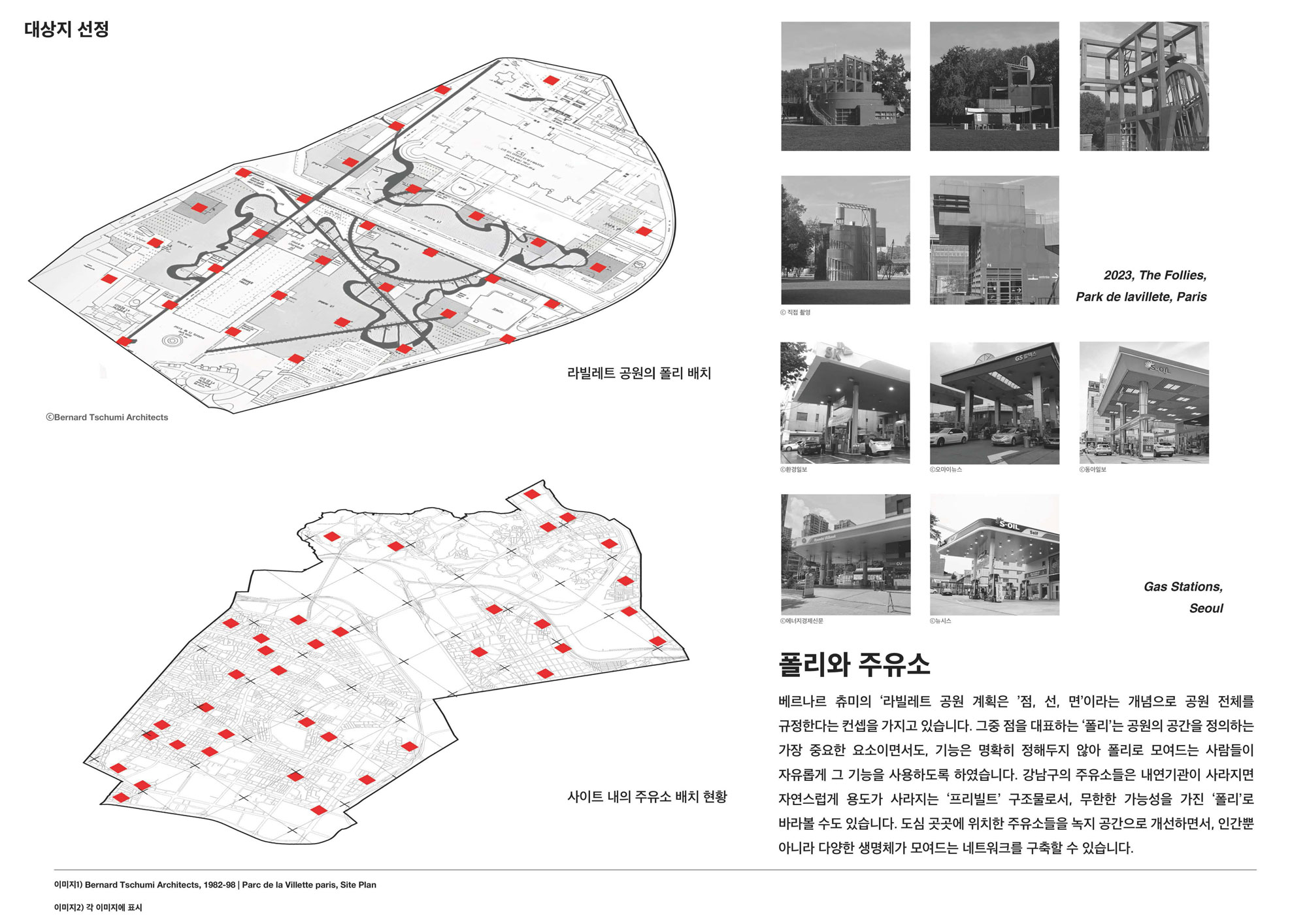 강남 도심지역은 자동차의 보급과 함께 등장했다. 이후 1980~90년대 자가용 시대와 주유소 거리 제한 폐지의 영향으로 주유소는 점점 늘어나다 2010년대 이후 높은 기름값과 친환경 차량의 증가로 점점 사라지고 있다. 주유소는 도로망을 따라 균일하게 배치되어 있고, 개방되어 있는 공간이기 때문에 도심 녹지로 전환하기에 아주 좋은 공간이다. 또한 주유소 구조물은 대부분 유사한 공간적 특징을 가지기 때문에, 유사한 형태의 ‘폴리’로 바라볼 수 있다.