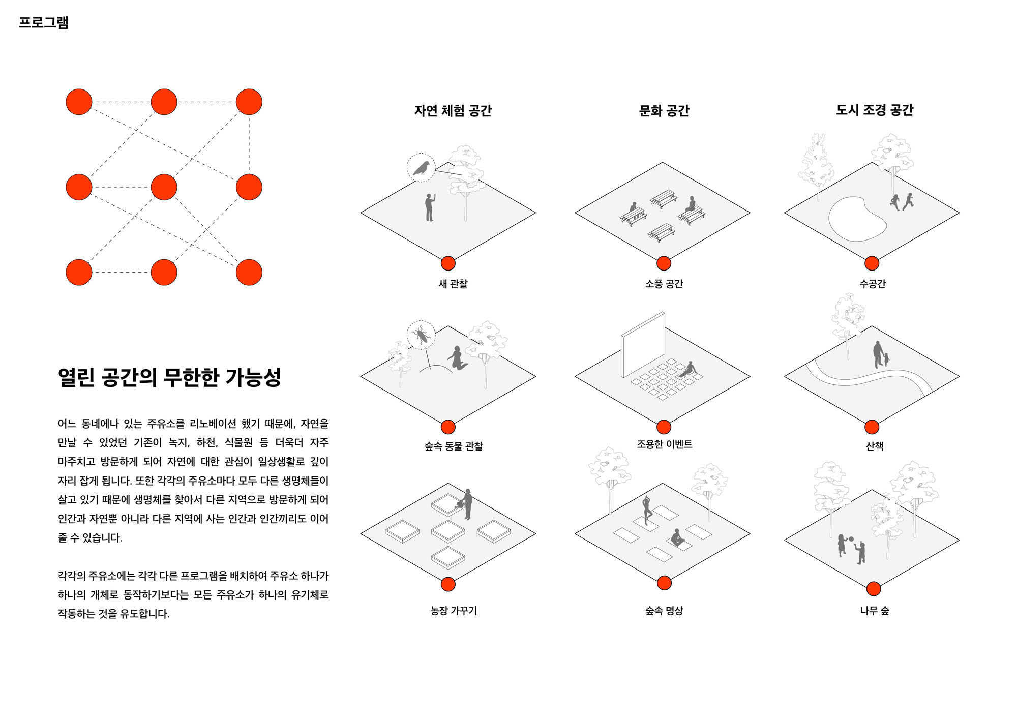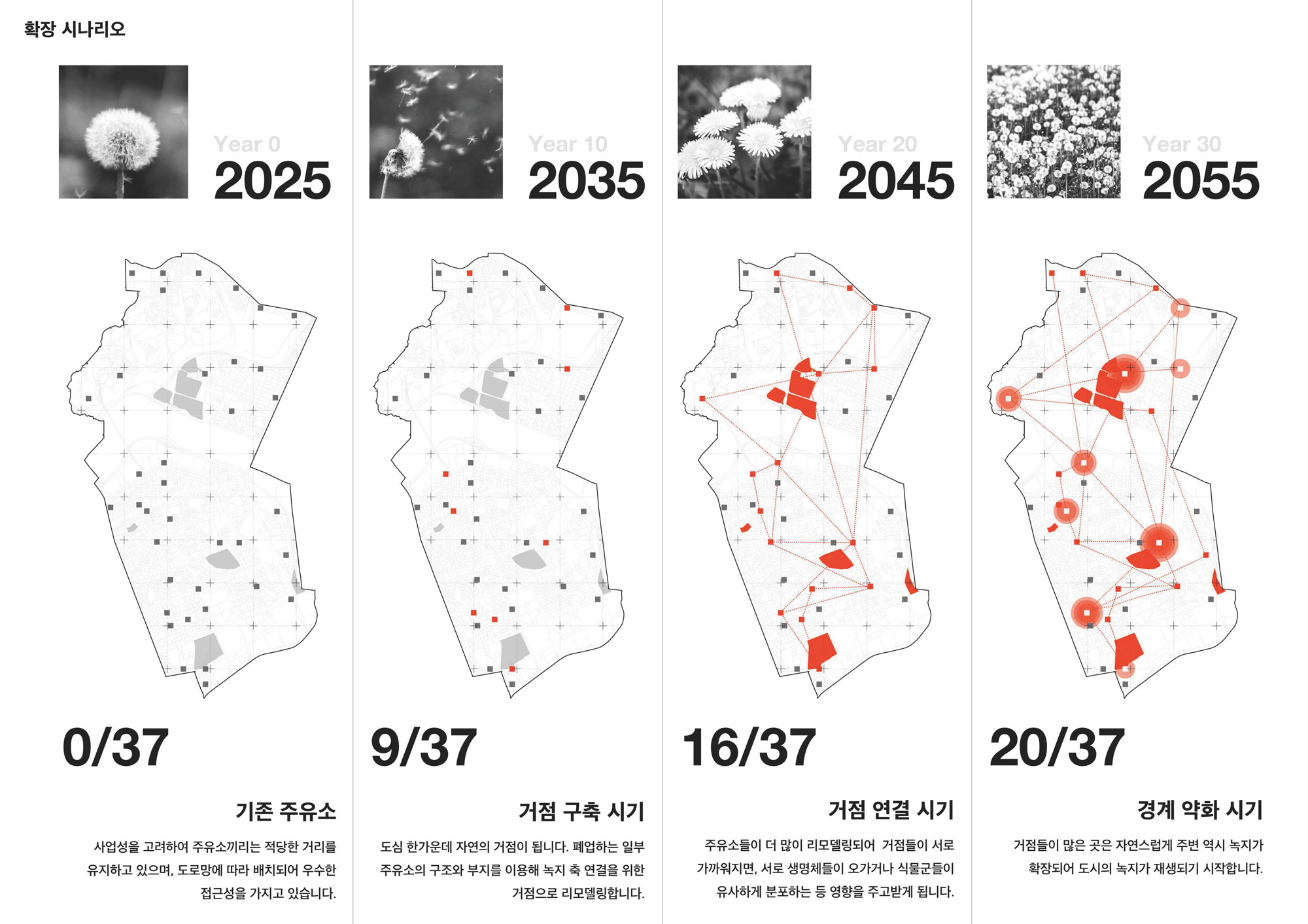 시간이 지남에 따라 녹지로 변화하는 주유소의 수가 늘면, 점점 녹지의 영향권이 겹치고 연결되며 자연스럽게 녹지 네트워크를 형성하게 된다. 또한 우리가 일상적으로 접할 수 있는 ‘집 근처의 공간’을 리노베이션했기 때문에 자연을 더 자주, 일상적으로 접하게 된다. 자연을 나와의 별개의 대상으로 느끼기보다, 나의 일상으로 받아들이면서, 자연스럽게 환경 문제에 관심을 두도록 한다.