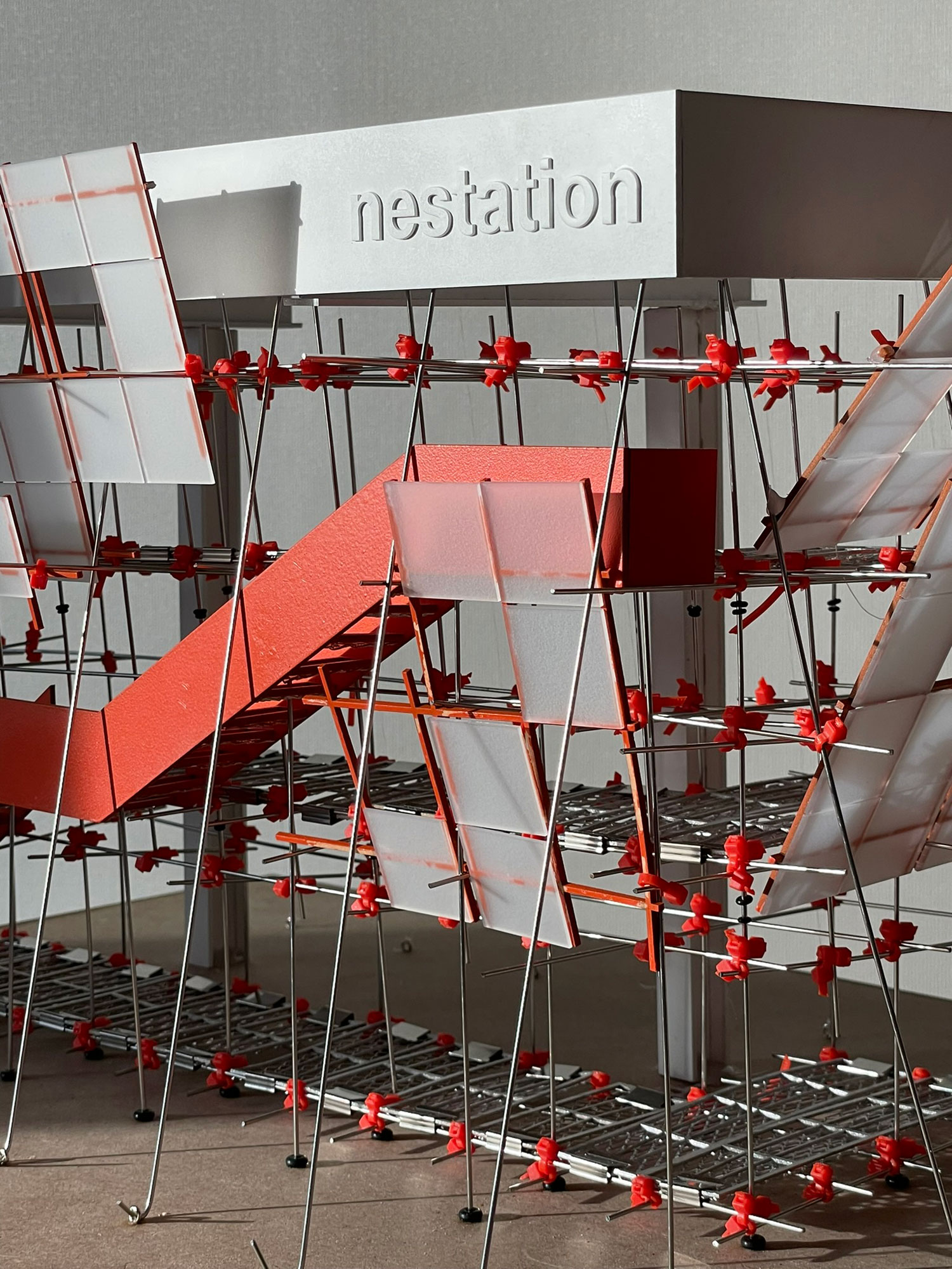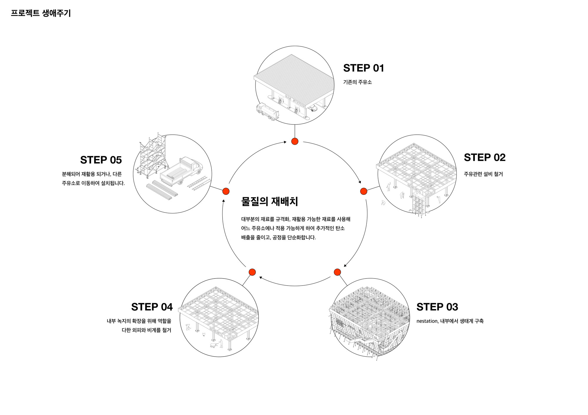 새는 훌륭한 건축가이다. 둥지를 짓고자 하는 공간에 크기에 맞추어 주변 재료를 사용해 집을 짓고, 집이 쓸모를 다하면, 재료는 다시 자연으로 돌아간다. 주유소는 각각 다른 크기를 가지고 있기 때문에, 각 주유소에 맞게 리노베이션하는 과정에서 새로운 공간을 만들면 또다른 탄소 배출이 발생할 수 있다. 따라서 마치 새들처럼, 쉽게 구할 수 있는 재료를 조합해 다양한 형태와 크기로 설치했다가 분해해서 재사용 할 수 있도록 하였다.