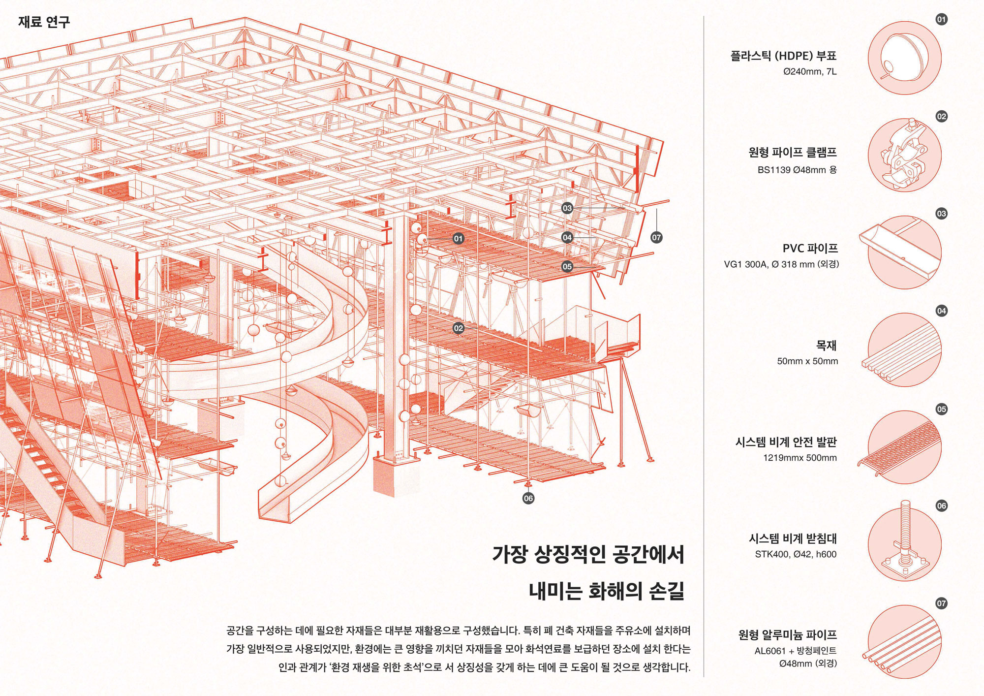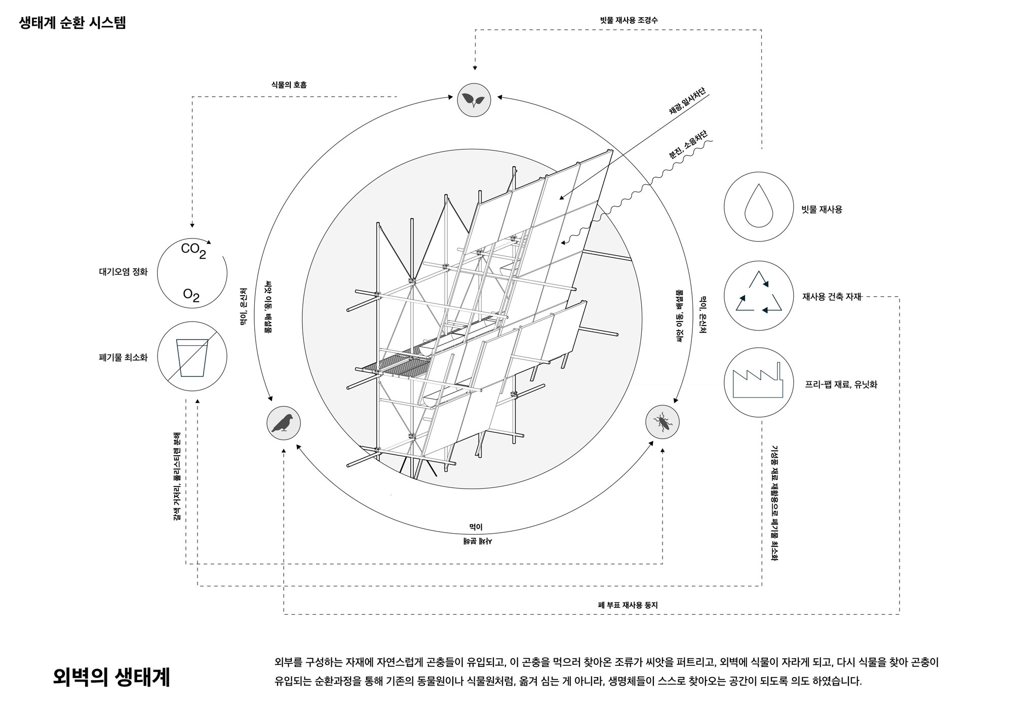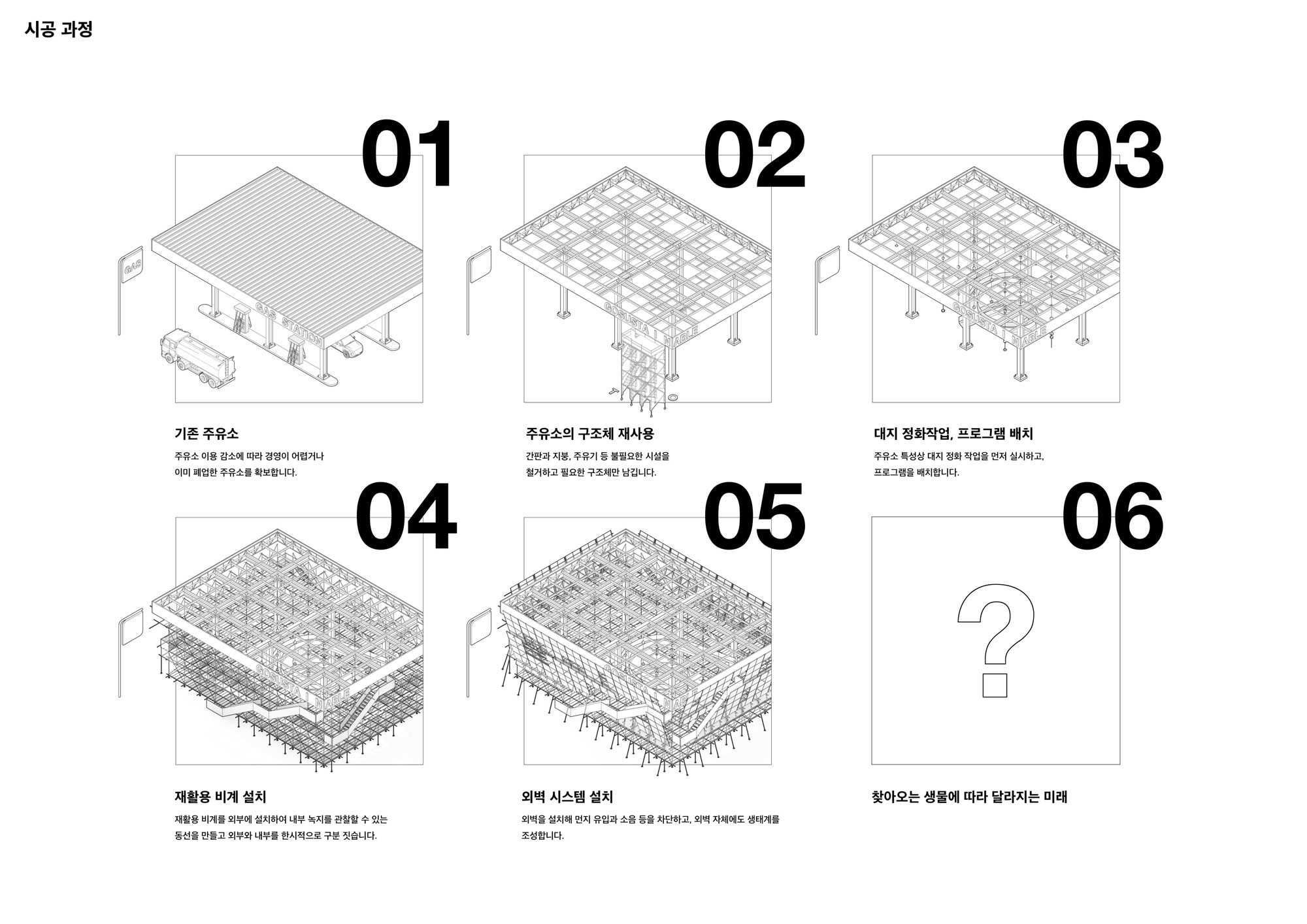 기존 주유소에서 주유 관련 설비를 철거하고, 내부의 생물을 보호하기 위해 임시로 설치되었다가, 궁극적으로는 철거되어 완전한 녹지로 되돌리는 것이 본 프로젝트에서 건축물의 역할이다. 재료는 이미 구하기 쉽고, 규격화된 재료인 시스템 비계와 pvc 파이프 등을 사용해 추가적인 건축 자재 생산이 필요하지 않은, 재활용 재료만을 활용한 건축을 지향하였다. 구조체 바깥에는 도로변의 분진과 소음 등을 차단하는 외벽을 설치하였다.