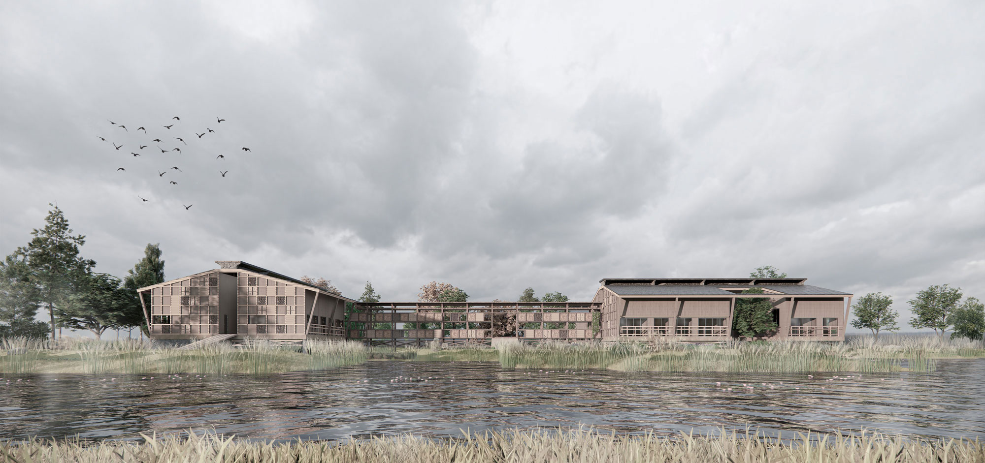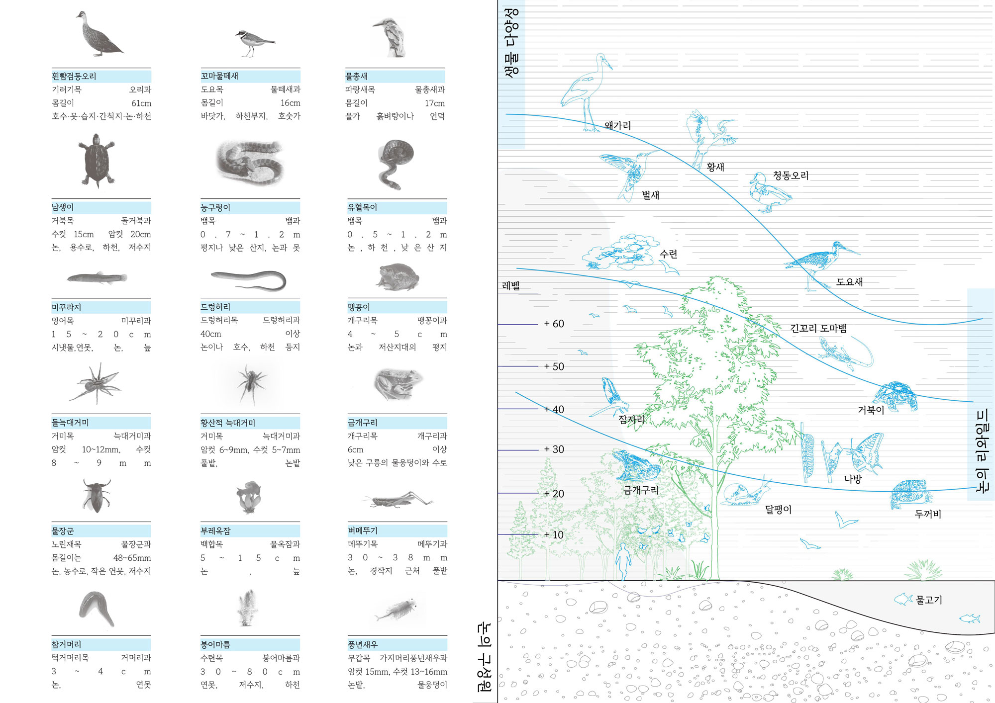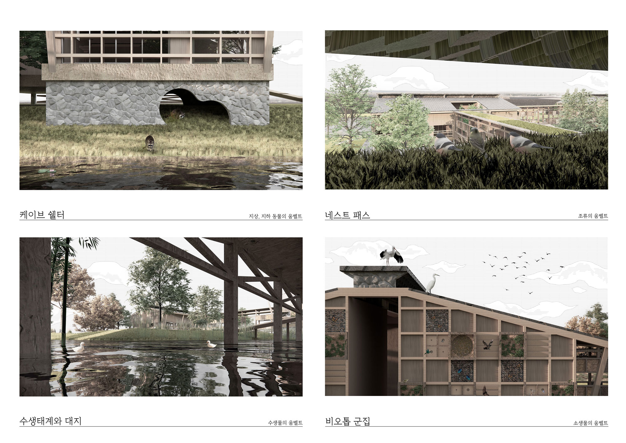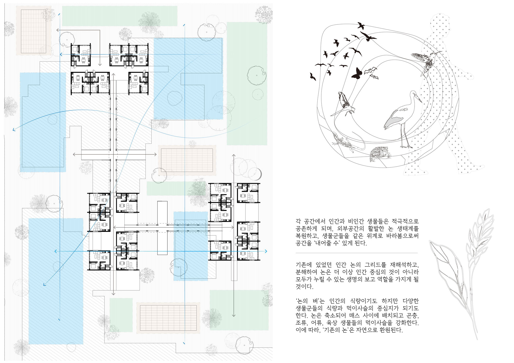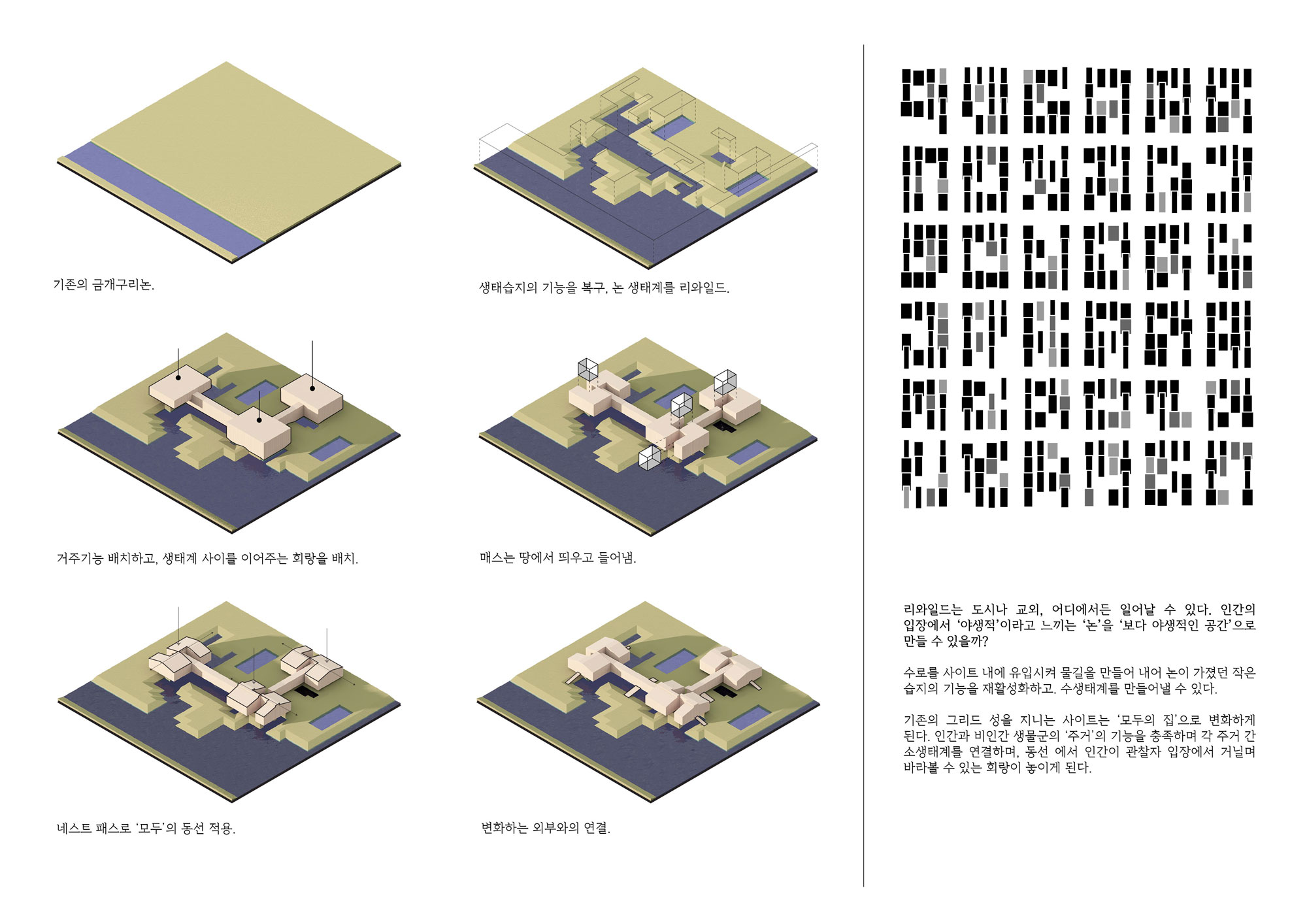 논가 기존 논 개발이 아파트 단지조성을 위한 방식으로 진행되어 왔다면, 이제는 성토시키고 공항부지의 확장으로 위기에 처한 논의 생태 습지 기능을 복구 시키고자 한다. 논은 수상과 지상 그리고 습지의 특성을 모두 갖고 있기 때문에 여러 가지 생태의 노드 기능을 복구 시켜 인간과 비인간이 함께 거주할 수 있는 새로운 프로토타입의 주거를 계획했다.
