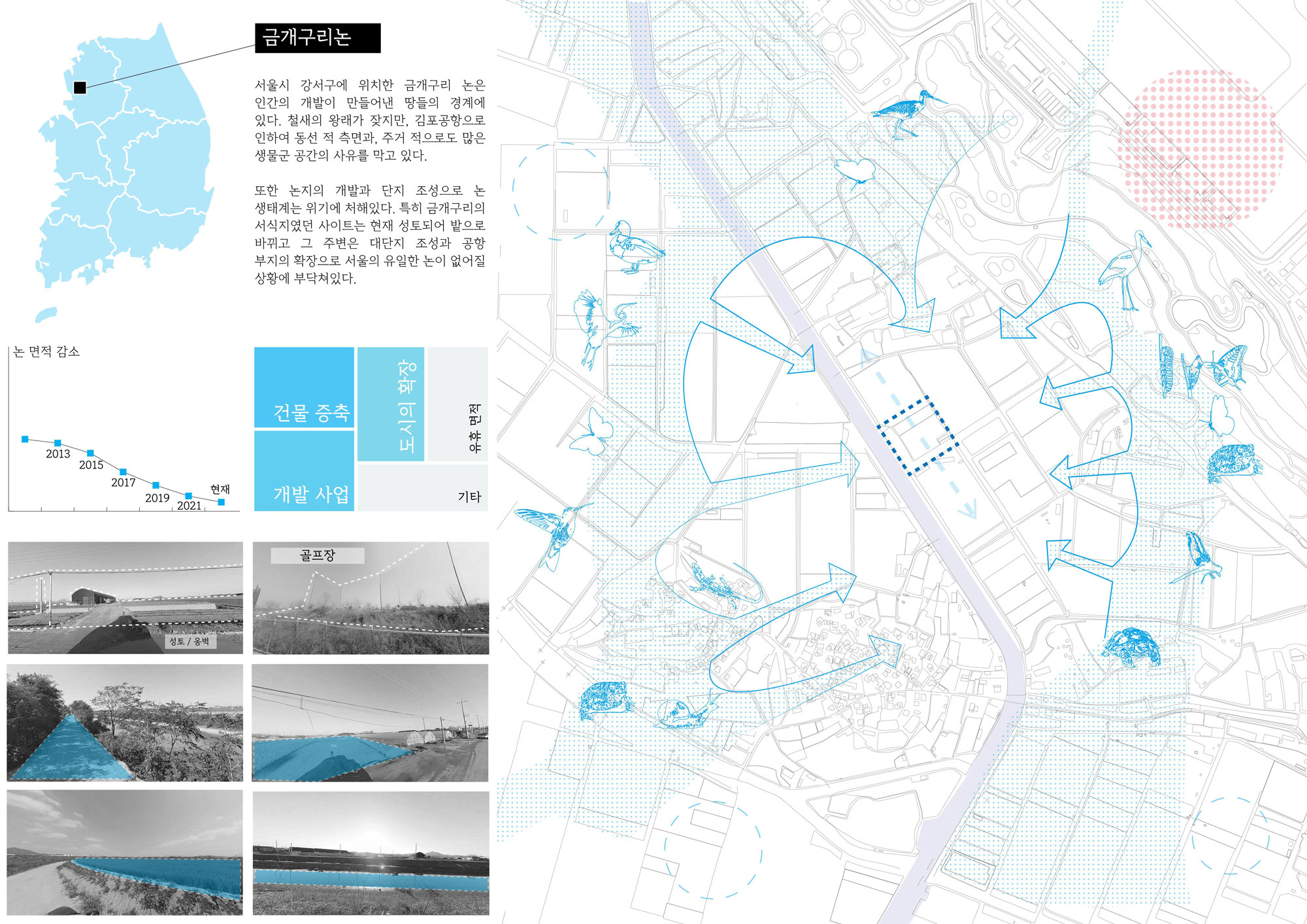 논은 논을 돌보는 인간의 거주지를 비롯하여 다양한 생물종의 주거지를 포용할 잠재력이 있으므로, 생물 다양성 측면에서 인간의 지배적인 지위를 내려놓고 ‘모두’를 위한 공간으로서 동등한 지위를 가지기에 정말 매력적인 공간이라고 생각하였습니다. 이에 서울 강서구에 위치한 금개구리 논을 선정하여 논의 그리드를 재구성하고, 모두와 함께 공간을 점유하는 방식을 다시 생각해 보려고 합니다. 최종적으로는 생물의 보고이자, 다양한 비인간 생물군들의 중요한 생태계적 노드의 기능을 복구하는 것을 목표로 합니다.