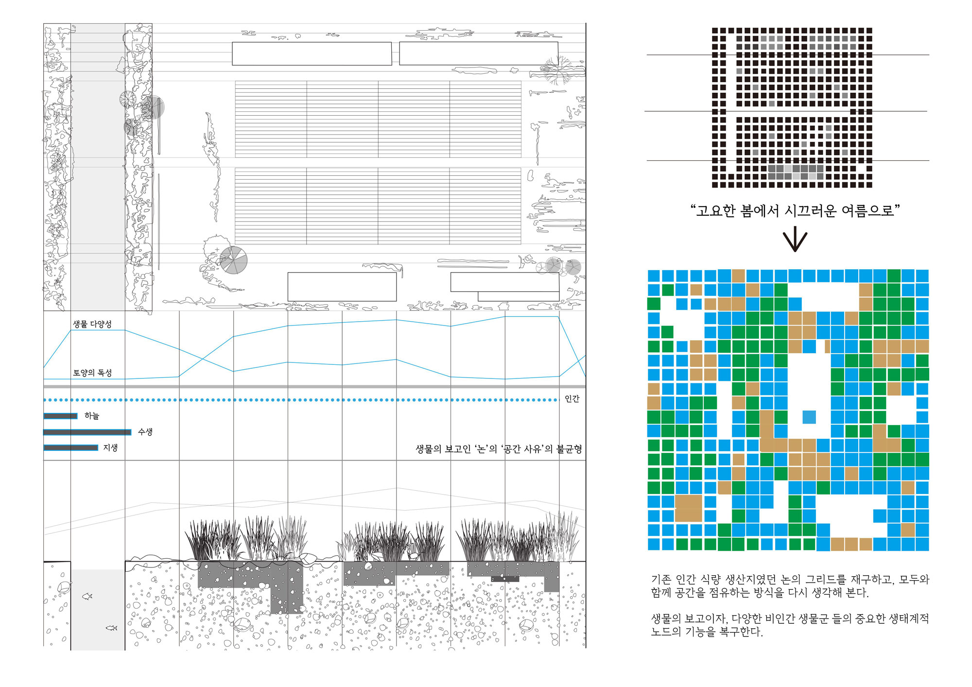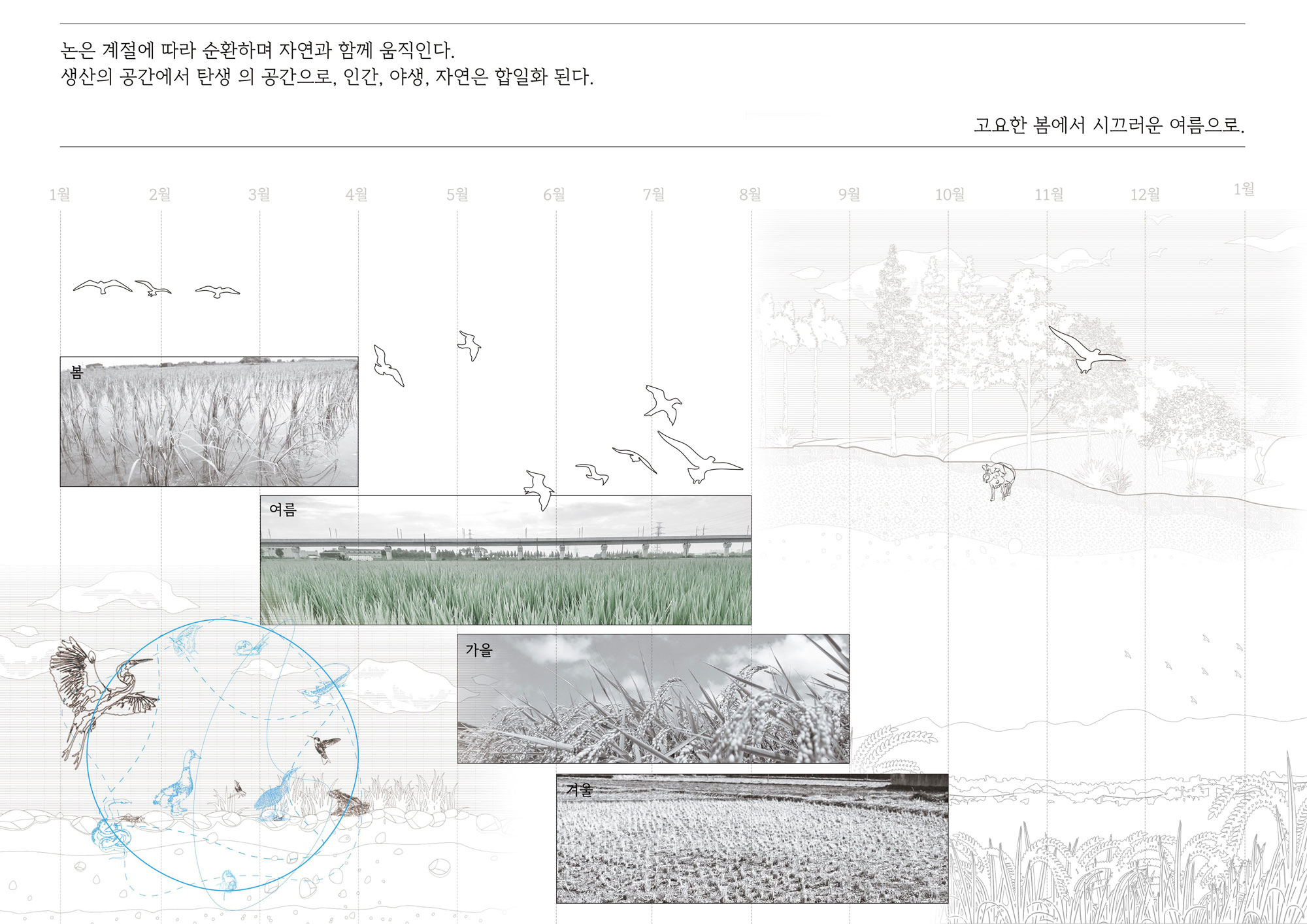 과거부터 인간 식량 생산지였던 논에 대한 그리드를 인간 중심이 아닌 모두가 누릴 수 있도록 재해석하고 생물군들을 같은 위계로 바라봄으로써 공간을 내어주고 비로써 이들은 공존할 수 있게 됩니다. 논은 계절에 따라 순환하며 자연과 함께 움직입니다. 기존 생산의 공간에서 탄생과 공존의 공간으로 바뀌며 인간, 자연은 합일화됩니다.