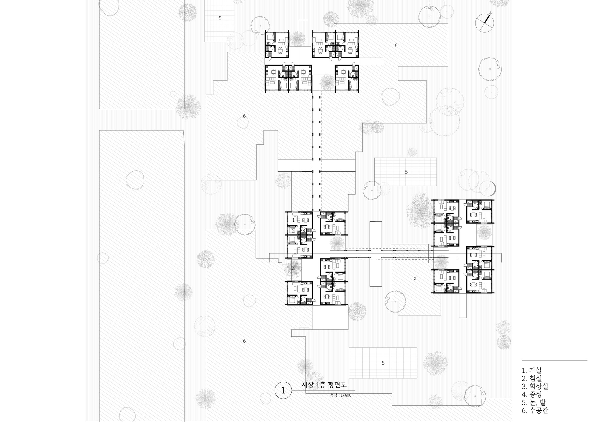 주거 사이를 이어주는 모두의 길은 시간에 따라 변화하는 논을 인간이 관조자로서 존재하며 시선에 따라 역동적으로 변화하는 자연을 목격할 수 있게 해줍니다. 기존의 길은 모두의 길이 되고 회랑 자체는 모두의 휴식처로 사용됩니다.