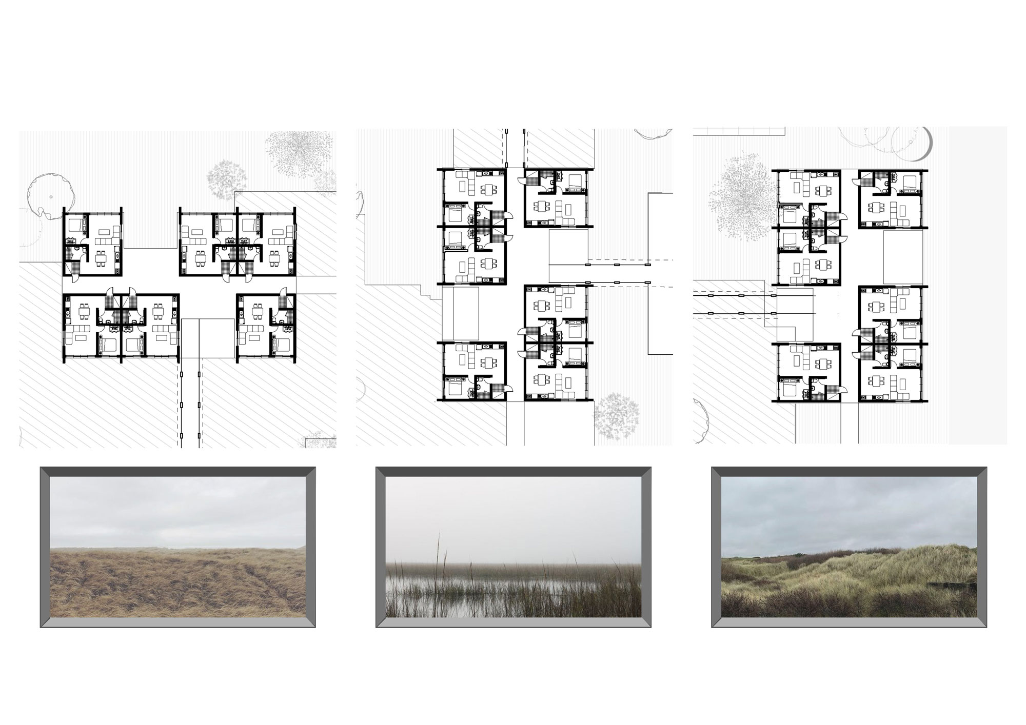 설계안의 배치도를 보시면, 작은 논밭과 야외에서 인간과 비인간 생물이 함께 쉴 수 있는 다양한 습지 등이 있습니다. 특히 적극적인 공존의 방법으로서 비인간 생물의 공간뿐만 아니라 인간 주거 기능도 만족하여야 하므로 주거 모듈을 활용성 있게 구성하도록 노력하였습니다.