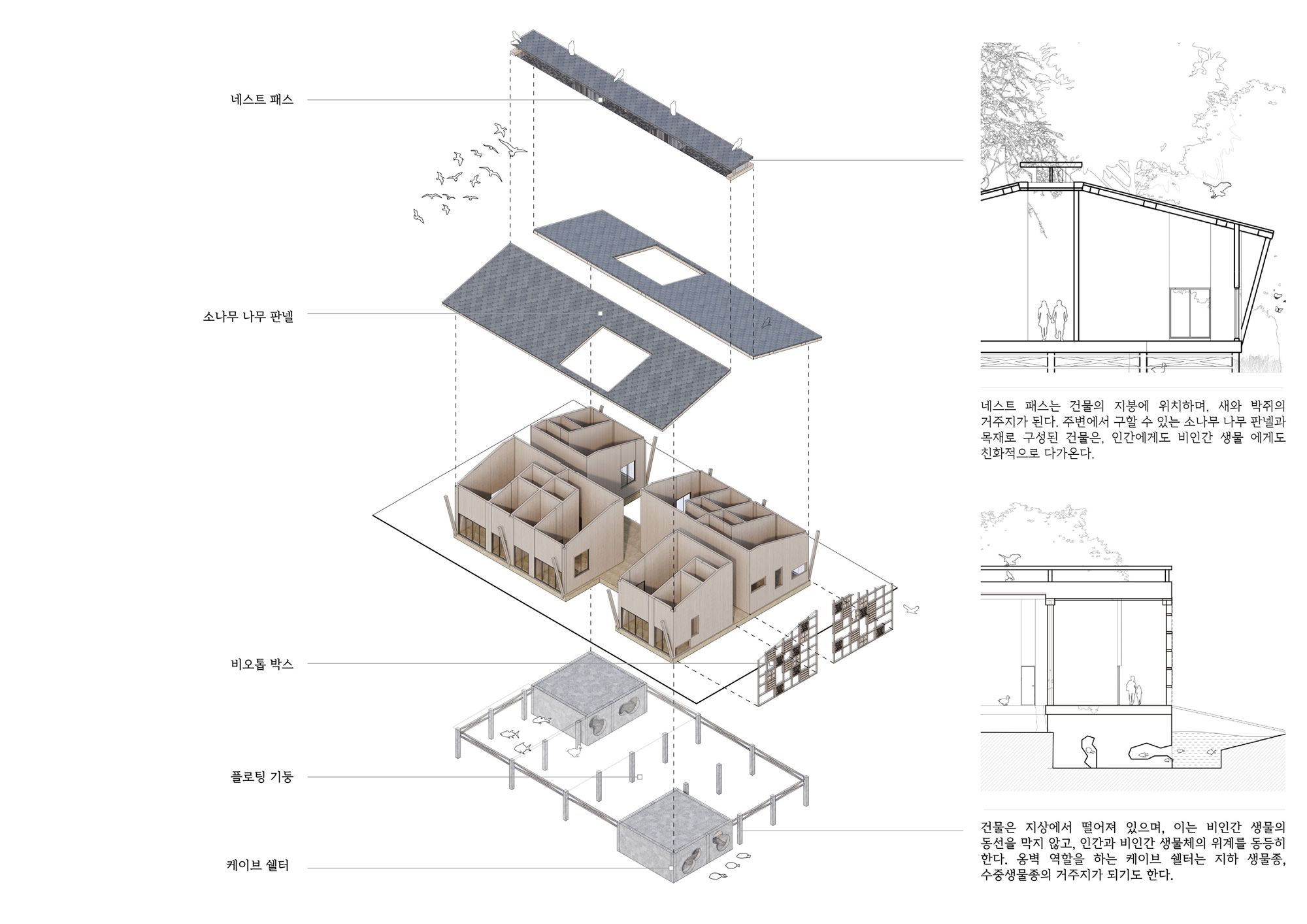 인간 주거 유닛의 특징은 다른 종들과 적극적인 공존 방법을 고민했습니다. 천장에는 네스트 패스라는 새를 위한 모듈이 삽입되고, 입면에는 논의 다양한 생물군의 주거를 만족시킬 수 있는 비오톱 박스 유닛이 삽입됩니다. 덩어리는 땅에서 들어내 지상 생물들을 막지 않고, 그렇게 들어낸 덩어리 하부는 다른 동물들의 주거지가 될 수 있습니다. 특히 전체 단면을 보면 우리의 길이 미생물군의 길이 됩니다. 서로의 움벨트를 존중하며 하부와 상부에 인간과 비인간 생물이 모두 함께 거주하는 모습을 볼 수 있습니다.