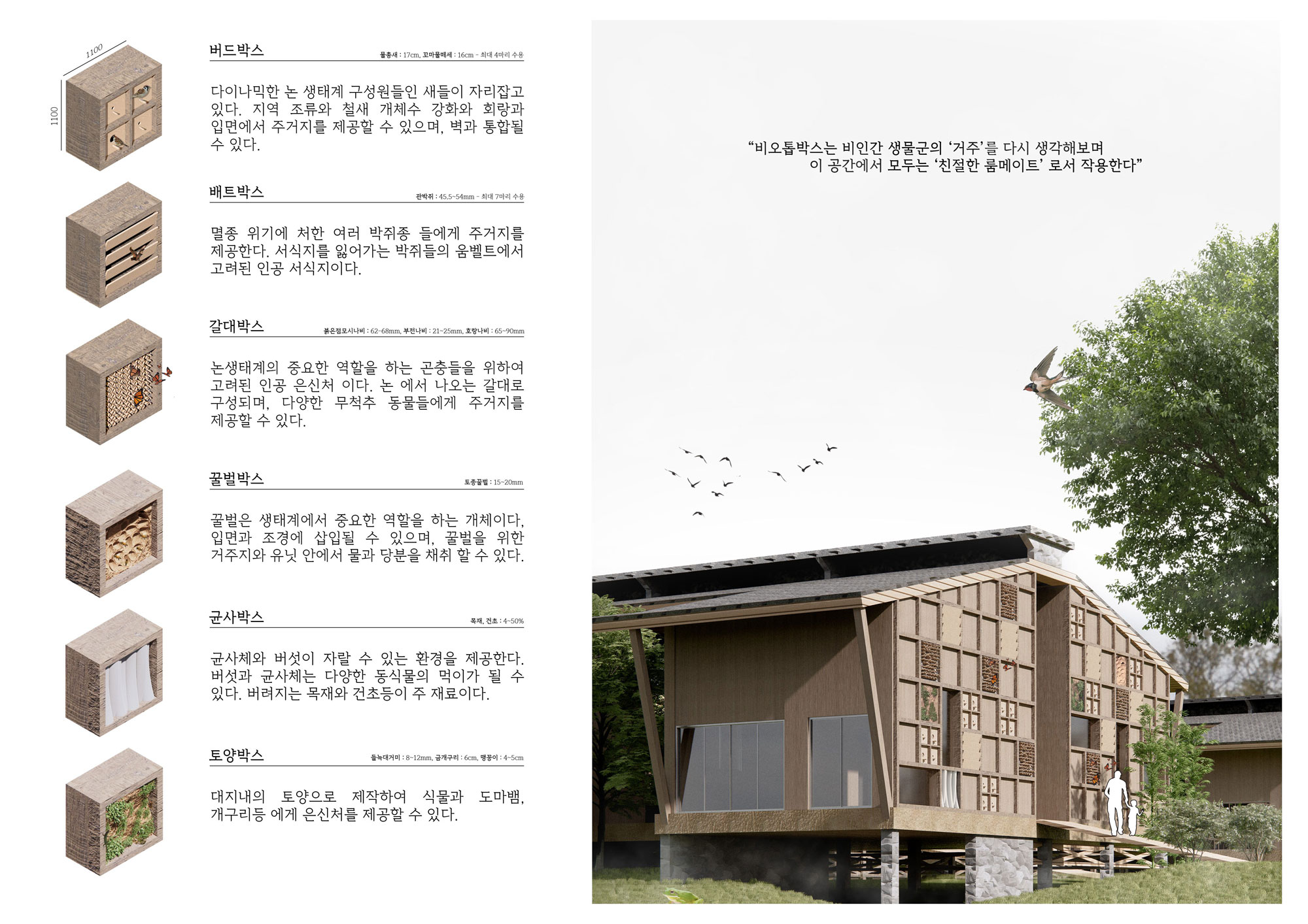 버드 박스, 배트 박스, 갈대 박스 등은 주변 논가 생태계에서 직접 자재를 구해 만들었으며 지역 조류와 철새, 박쥐들, 무척추 동물들의 움벨트를 고려하여 새로운 서식지를 제공하고 있습니다. 이런 비오톱 박스들은 이 공간에서 서로의 영역을 침해하지 않은 친절한 룸메이트로서 작용하게 합니다.