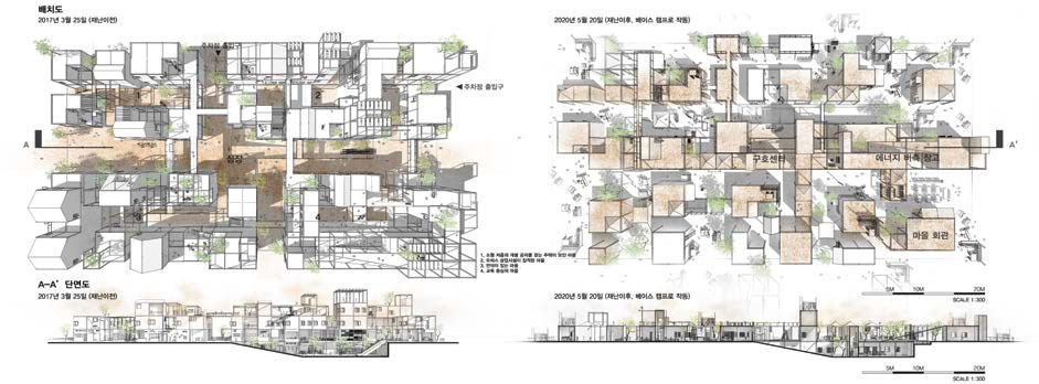 1. 시스템적으로 안전한 배치구조를 띄어야 한다. 재난은 파국을 뜻하는 영어 ‘catastrophe’는 ‘아래가 뒤집히는’상황, 즉 ‘기대하고 있던 서사가 갑자기 뒤집히는 순간’을 의미한다. (『파국의 지형학』, 문강형준 지음, 자음과모음, 2011) 재난의 시점에서 이는 형태언어로 은유 된다. 보통마을은 파국을 상황을 극복하는 과정에서, 공지와 필지의 형상이 뒤집히고 또 다시 역전되면서 일상으로 복귀한다. 우리는 ‘경관건축’을 제안한다. 이는 단순히 INVERSION되는 형태의 서사를 의미하지 않는다. 이는 재난이전의 일상과 재난 이후의 극단적 상황에서 공동성 회복의 역할을 하는 OPEN CLOUD 공유 시스템과 경량목구조의 WOOD NET 구축 시스템 그리고 공지(심장)을 통한 구체적 계획을 수반하고 있다.