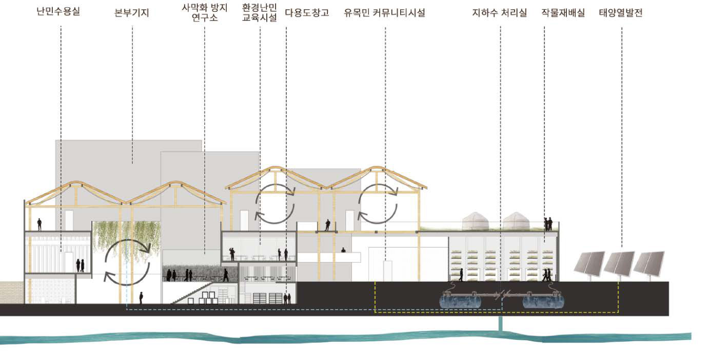사암벽돌의 단점은 가루가 묻는 것이다. 이를 개비온 형태로 만들어 구조와 외장의 모래폭풍을 막기 위한 재료로 사용할 것을 제안한다. 이로써 재난의 상징이었던 모래가 난민들의 삶을 위한 건축, 사회적 건축으로 재생될 가능성을 모색해보고자 한다.