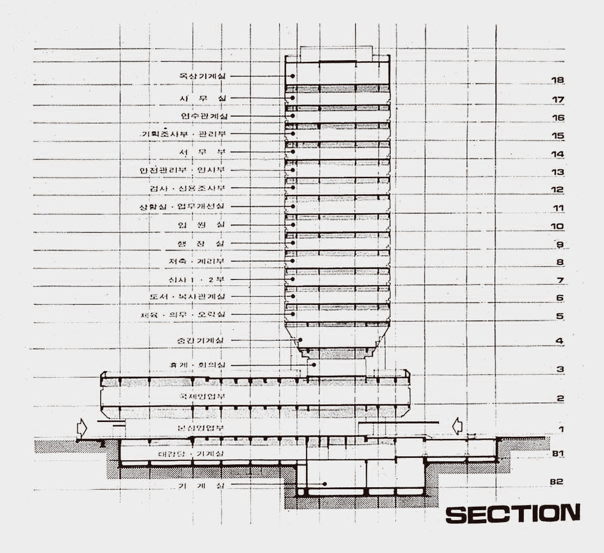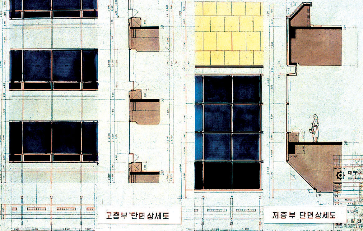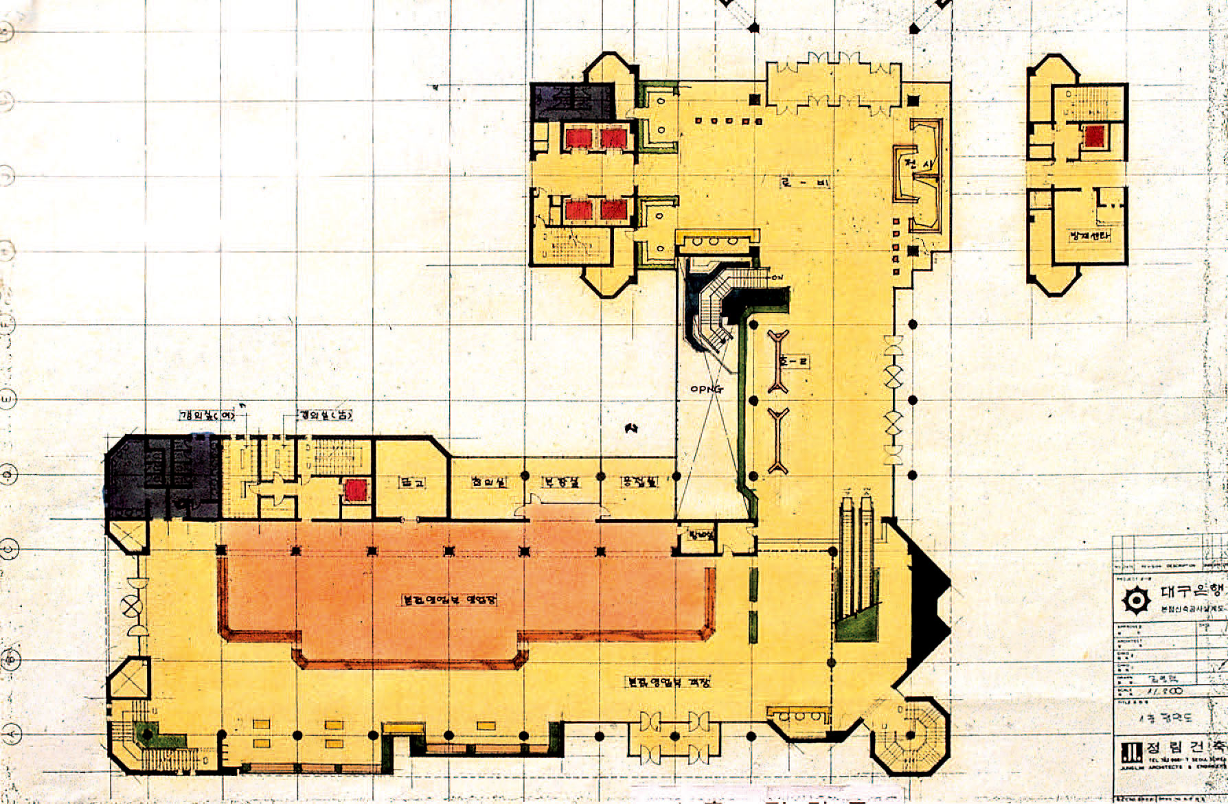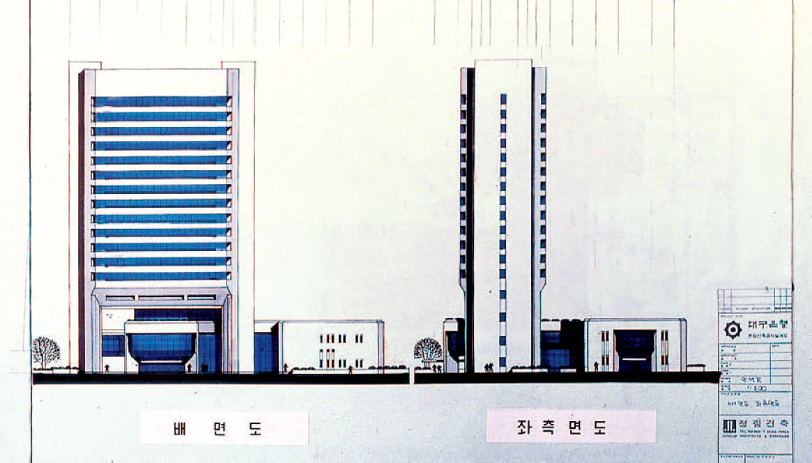 대구시의 새로 계획된 간선도로에 면하고 있으며, 지역 금융과 장소성의 의미를 갖도록 고층화시켜 랜드마크로서 도시 공간의 공공성을 제공토록 했다. 건축 공간에 담겨진 제 활동을 사적, 반사적, 공공적 성격으로 구분하여 내·외부 공간을 구성했으며, 이들은 상호 관입되고 교호되어 공간의 흐름을 적극 표출한다. 대지 내에 적극적인 공공 공간을 확보하고 저층부와 고층부 사이에는 선큰 가든을 두어 대지의 포용력에 순응하는 계획으로 땅과의 밀착성을 높였다. 투명성과 솔리드, 포디엄과 타워의 대비적 요소와 구조 방식과 연결되는 조형은 복합적 구성을 통한 다의적 표현을 추구하고 있다.