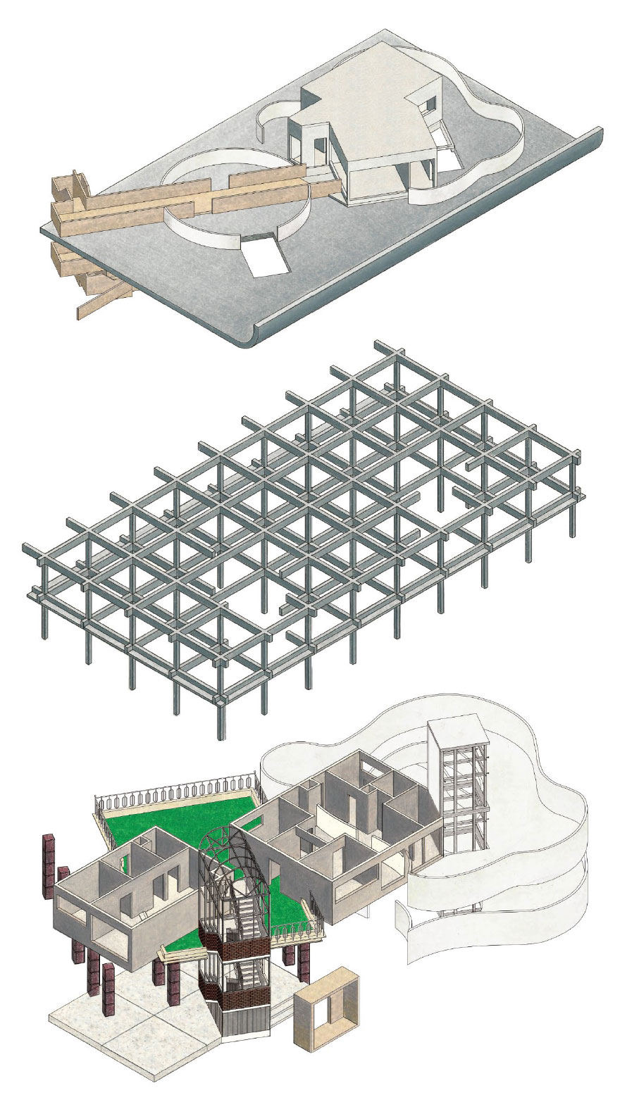 이석주 최인학 조휘준 국내 도시 경관에서 쉽게 찾을 수 있는 건축 요소를 인위적으로 추출했다고 해도 무방할 정도로 구성 원리를 따와서 만든 것이다. 지도에 각 요소를 연결해둔 것은 그것이 해당 지역에서 특히 많이 보인다고 판단해서 표기한 것이다. 주거 유닛 1과 2는 아파트의 2베이, 3베이 평면을 참고했다. 3베이는 거실을 중심으로 양 옆에 방이 붙는 형식으로, 지난 세기동안 많이 지어졌고 그게 어느 정도 경제적이고 보편성을 띤다고 생각했다.