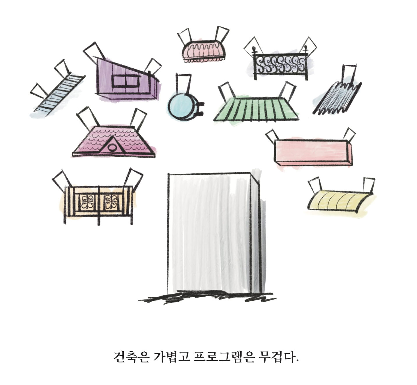 한국의 건축에는 특이점이 왔다. 건물이 사용되기 시작하면 더 이상 건축의 자리는 찾아보기 어렵다. 건물은 주입되는 프로그램에 따라 여러 번 옷을 갈아입는데, 한국성에 따라 그 변화가 쉽고 빠르고 직관적으로 발생한다. 그러면서 소프트웨어인 ‘프로그램’으로 ‘건축’이라는 하드웨어가 포장된다. 건축은 가볍고 프로그램은 무겁다.