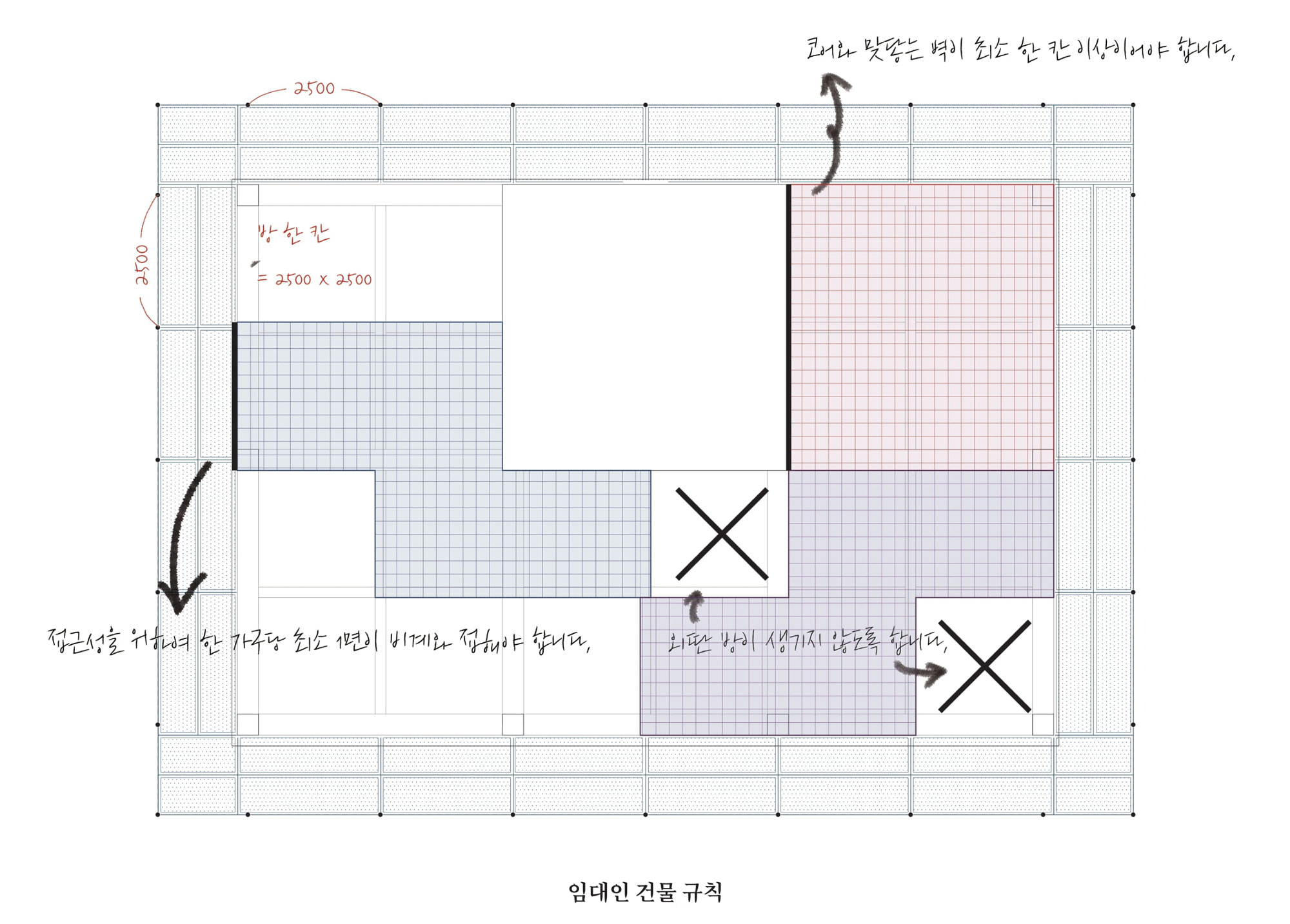 클라이언트는 임대인과 임차인으로 설정해서 한국성의 양면성을 표현한다. 임대인과 임차인이 만들어내는 주택에는 그들의 성격이 부풀려 담기게 된다. 임대인의 건물은 최소한의 필요 요소인 구조와 코어, 그리고 건물을 수정할 수 있는 장치인 비계만이 서 있다.