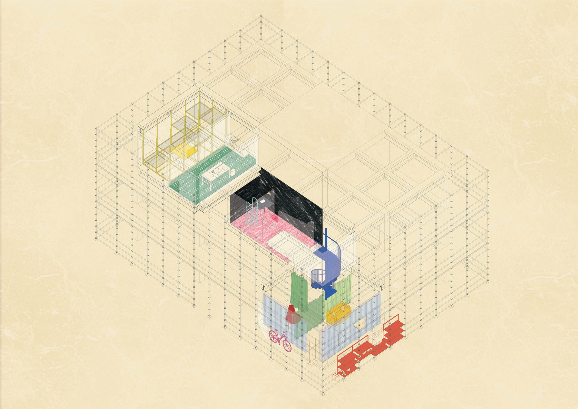 그에 반해 임차인의 공간은 판매를 위해 구획된 방 몇 칸을 차지하여 필요에 맞게 재단된다. 본인에게 맞는 적절한 스케일로 공간을 구성하면서 각 프로그램의 성격이 강조되고 두드러진다. 입주자 스스로 공간을 구획해야 하는 임대 주택은 비계를 이용해 계속해서 공간을 덧댄다.