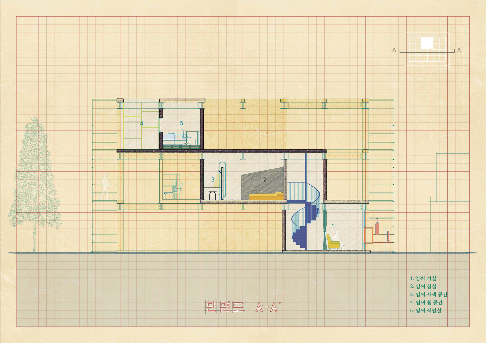 박서현 양유진 최맑은별 처음에는 보통 한국인의 집을 설계하고 싶었는데, 월세나 전세 등 임대차 계약을 맺고 사는 사람보다 단독주택을 소유하는 사람이 훨씬 더 적을 거라는 생각을 했다. 그래서 단독주택보다는 다세대 주택으로 보통의 한국성을 표현하는 것이 우리 의도에 더 맞는다는 생각을 했다.