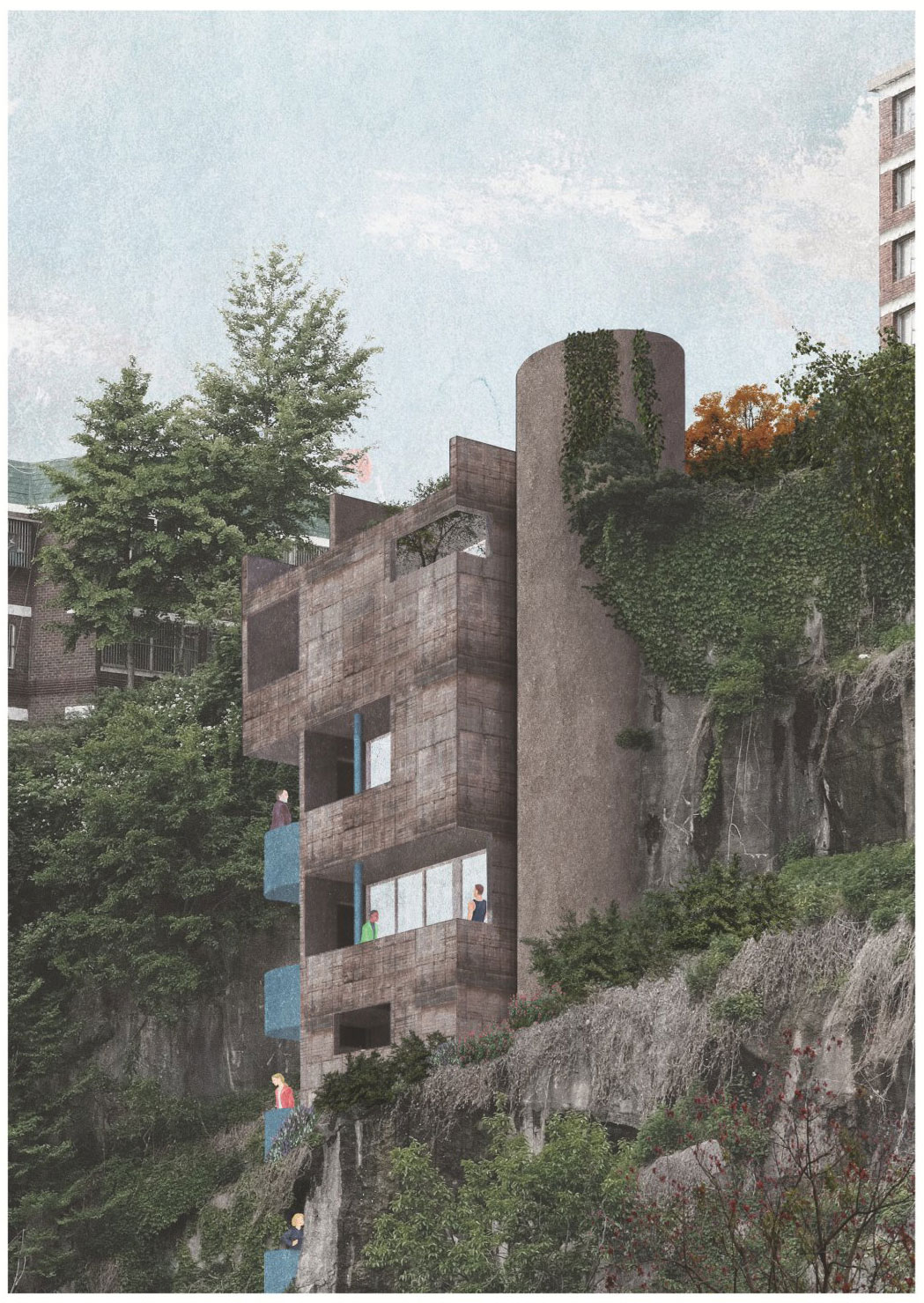 돌산에 걸친 4층짜리 단독주택은 돌산과 일체화된 것처럼 보이며 사용자는 돌산 자체가 구조이자 벽 그리고 옥상이라는 착각이 든다. 돌산 상단 레벨과 동일한 옥상 레벨로 주 진입이 이루어지며 골목길의 건축환경과 동떨어진 옥상의 열린 공간이 마을의 ‘아고라 (Agora)’로 작동한다. 옥상의 출입구를 지나 돌산 내부로 들어가면 주택 출입구와 돌산 아래 골목길까지 이어지는 계단 코어가 나온다. 이때, 돌산 윗마을 아랫마을을 연결해주는 동선 역할인 계단 코어는 층마다 위치한 주택의 베란다와 연결되며, 각기 다른 프로그램과 주민들의 참여가 만나 공동체가 이뤄진다. 전통 건축에서 모호한 경계를 통해 공간의 중첩과 상호 관입이 나타나며 이를 가장 잘 보여주는 마당은 집과 외부를 물리적으로 이어주는 동시에 이웃과의 관계를 맺어 준다. 각 베란다는 이러한 전통 건축의 마당을 ‘오마주 (Homage)’한 공간으로 가족 구성과 주거형식의 변화 및 커뮤니티의 요구라는 사회 양상을 반영하였다.