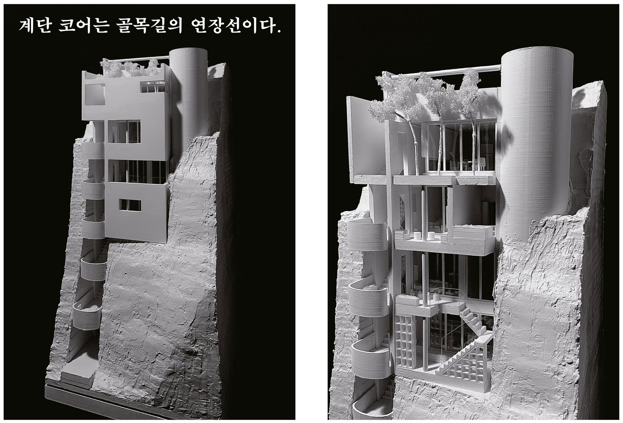 한현수 돌산이 새로운 경험의 주체가 되는 공간이기 때문에 계단 코어도 돌산 내에 종속되는 것이 더 어울린다고 생각해서 결과적으로 감춰진 모양새를 하게 됐다. 그리고 프로그램 배치 아이디어는 아파트의 공용 피난 계단에서 얻었다. 화재시 베란다를 통해 윗집 아랫집이 연결되는데, 사적인 공간이 직접적으로 이어진다. 여기에 착안해서 베란다에 프로그램을 배치했고 방의 성격에 따라 깊숙이 두거나 바깥에 면하게 배치했다.
