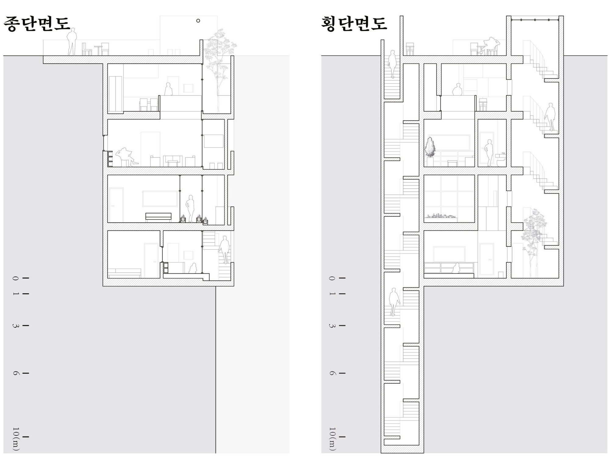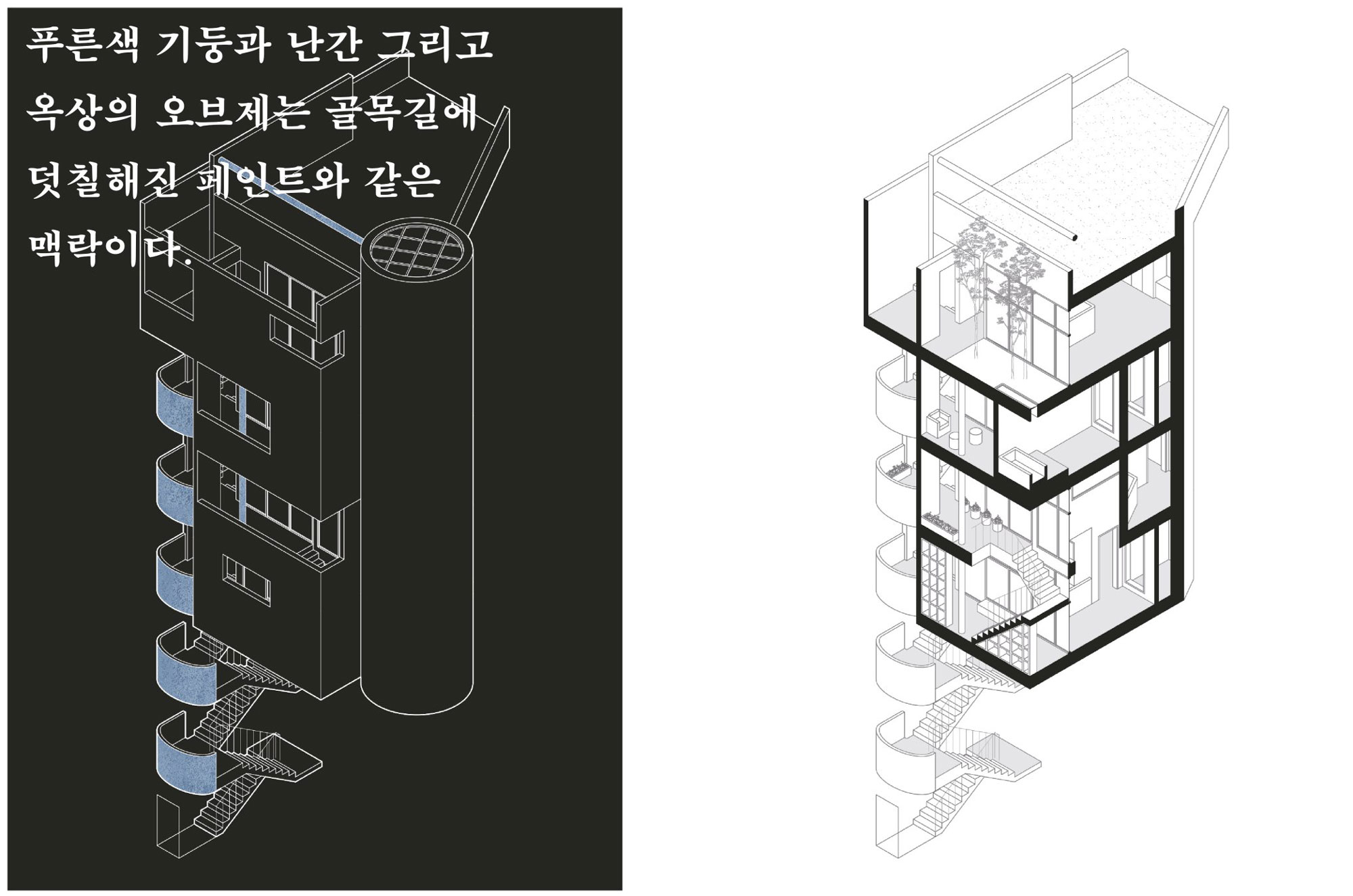 김효영 선정한 사이트 자체가 프로젝트 대부분의 이야기를 만들어 준다. 그럼에도 불구하고 가장 중요한 것은 주택이라는 가장 사적인 공간을 얼마나 공공에게 내주고 접할 수 있느냐의 문제인 것 같다. 평면에서도 느껴지긴 하지만 그것을 어떻게 정리하고 배분했는지 설명해주면 좋겠다. 그리고 공용 계단과 주택 내부로만 연결되는 계단이 중요한 것 같다. 어떤 측면에서는 공용 계단이 시각적으로 드러나야 할 것 같은데, 주택 내부로 이어지는 원형 계단이 상징적으로 부각된다. 그렇게 설정한 이유도 궁금하다.
