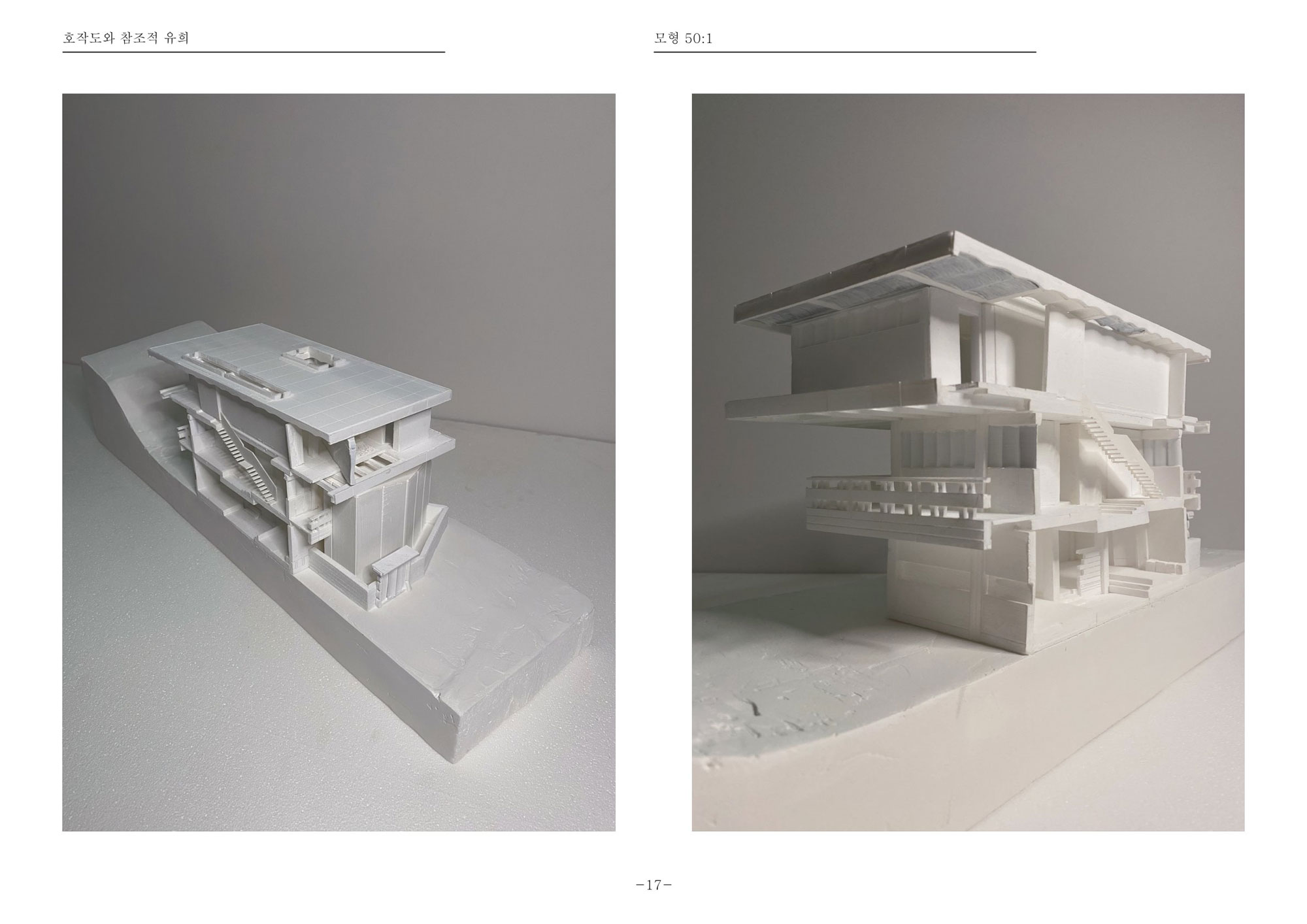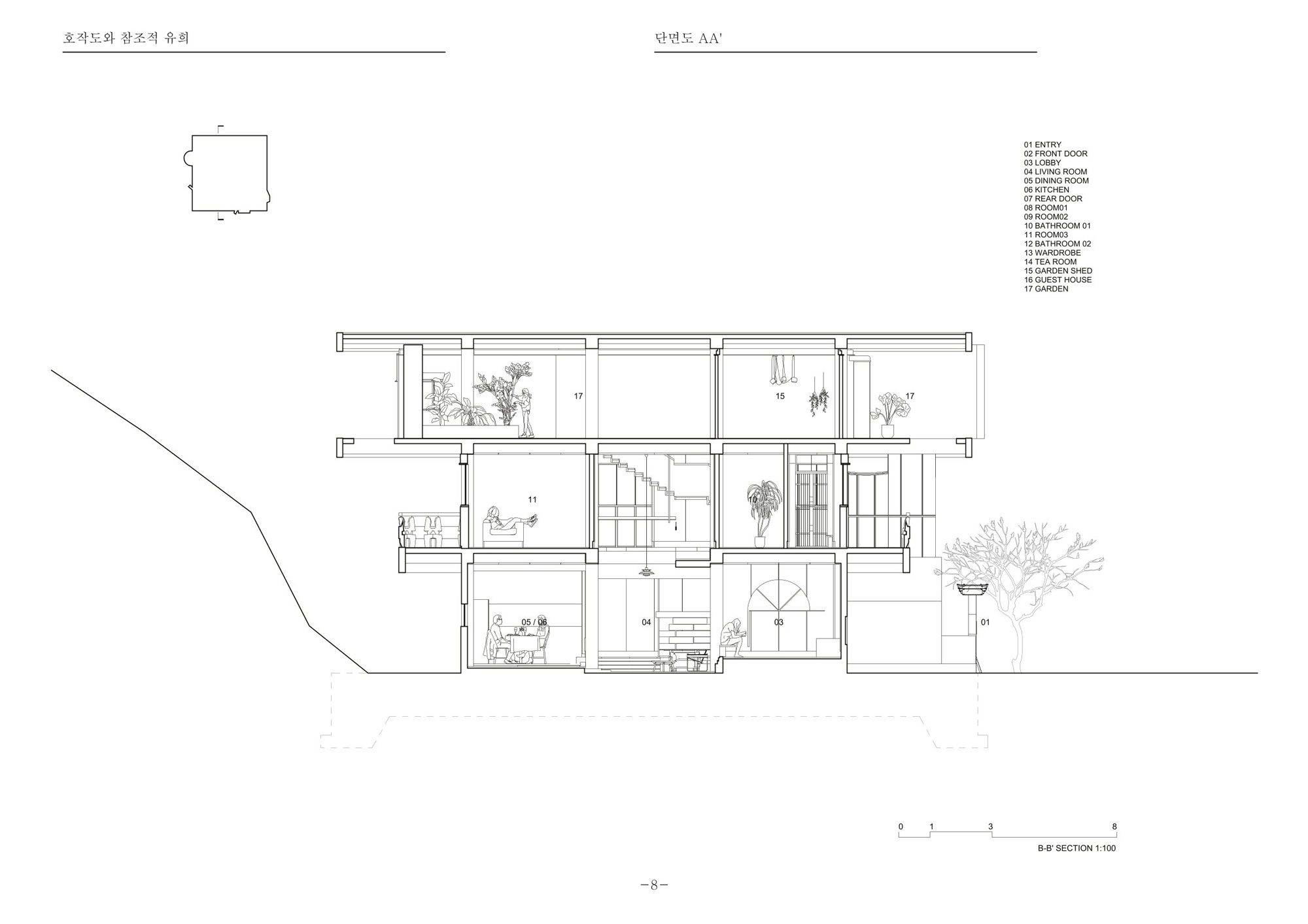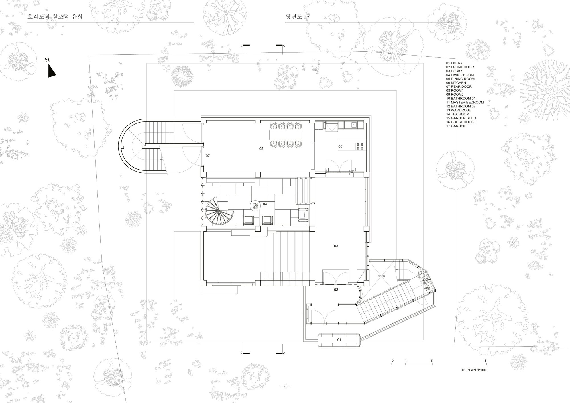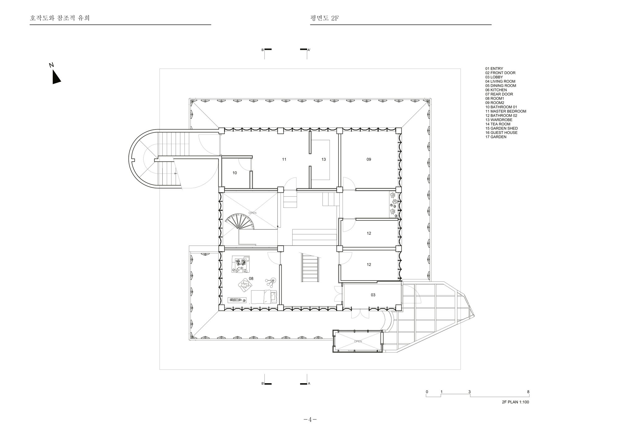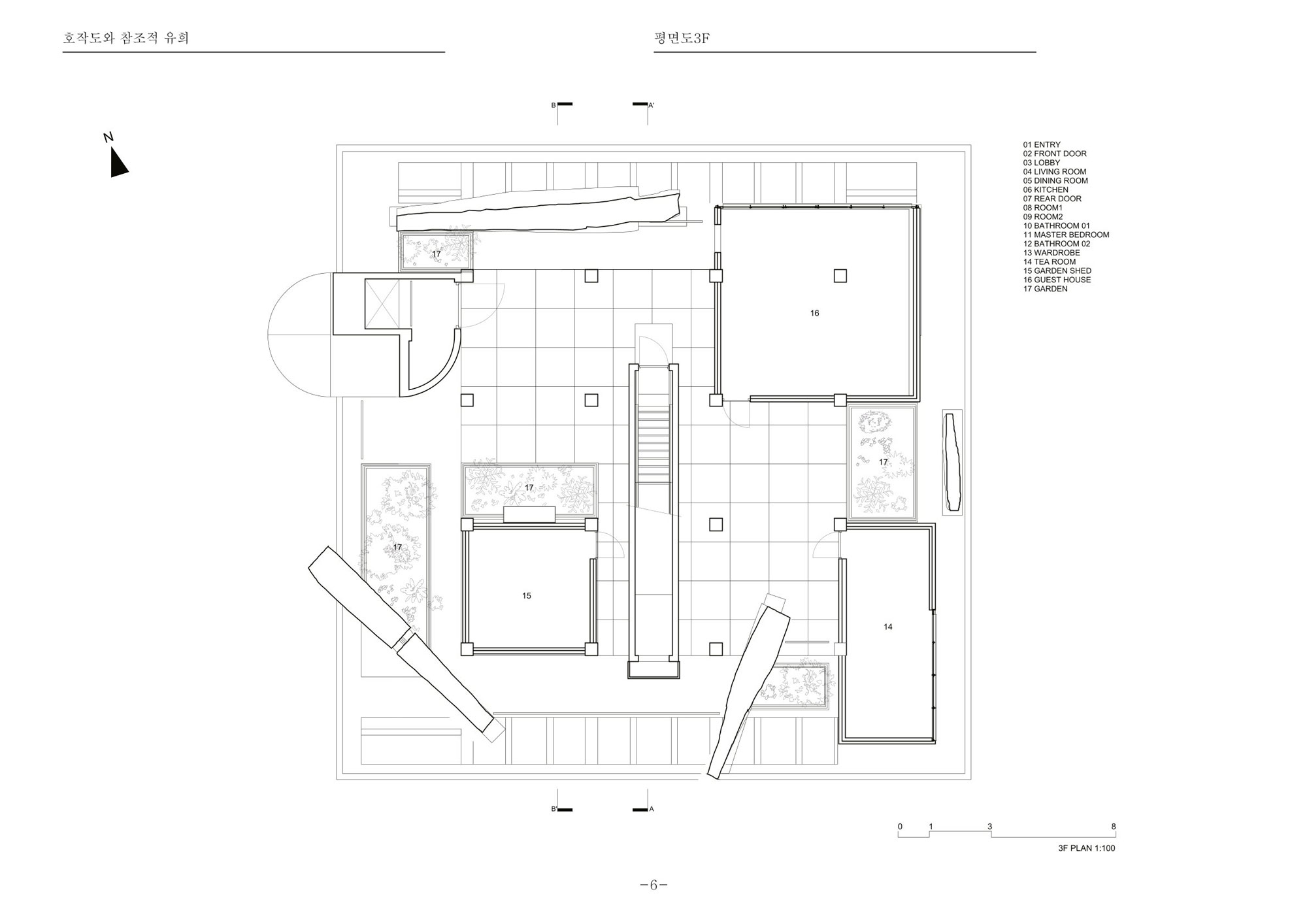 유정민 김승묵 새로운 한국성이기 보다는 발전된 한국성을 이야기하고 싶었다. 우리가 생각한 한국 주거 타이폴로지의 오브제성을 이야기할 때 그 표상이 기표나 기의를 갖고 있지 않았다. 그럼에도 불구하고 미학적으로 아름다워보이고 구성이 매혹적이었다. 그런 참조점이 1층과 2층을 대변하고 있다면 3층에는 그로부터 벗어나서 이상한 것이 들어오기 시작한다. 이런 기이한 오브제가 개입하면서 그 공간을 향유하는 사람들이 그것을 통해 다른 한국적 공간의 양식을 만들 수 있지 않을까 상상했다.