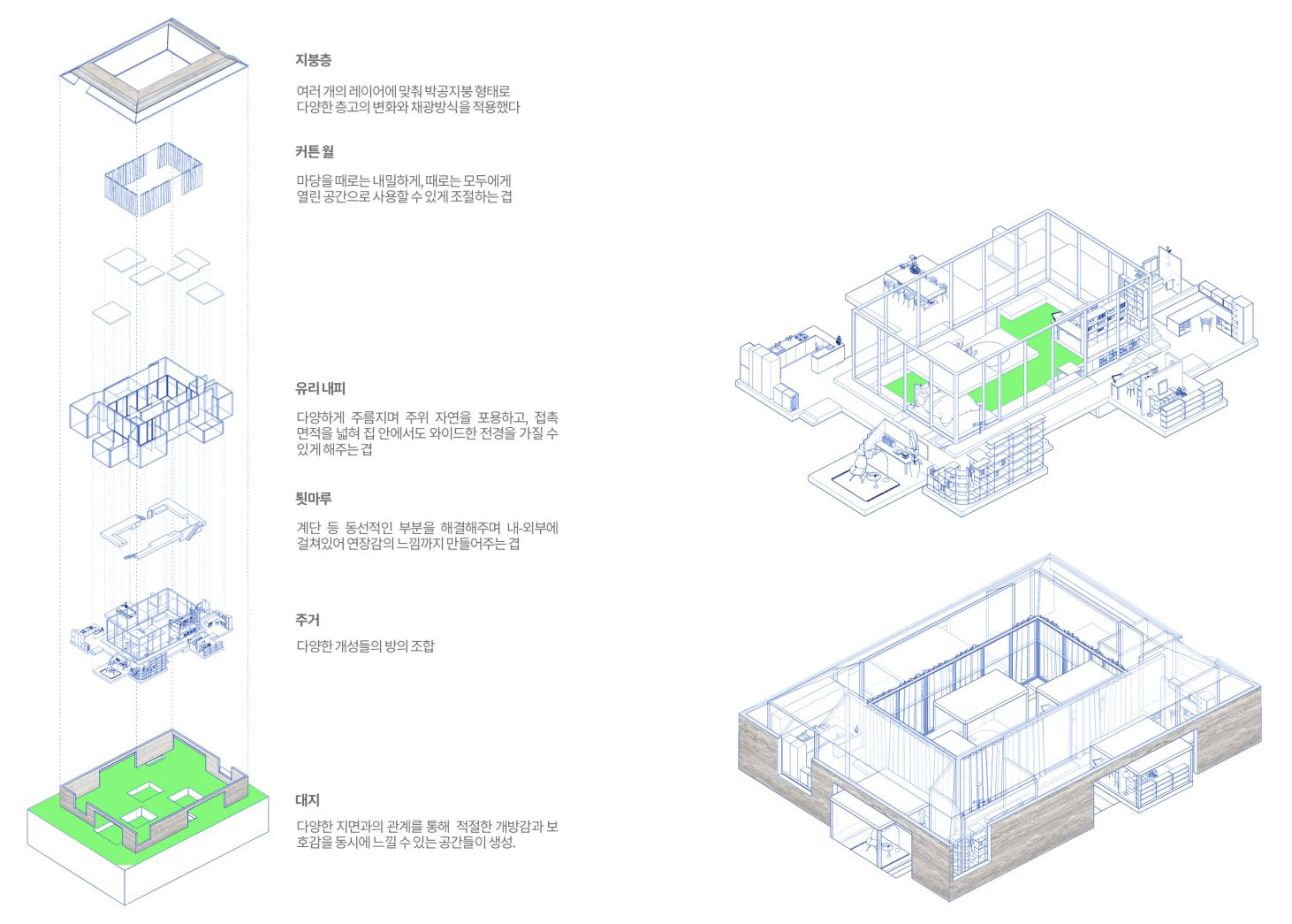 우리를 규정하는 시도보다는 먼저 긍정하려는 시도에서 설계를 시작했고. 현대 한국 사회에서 여러 겹의 내면을 가지면서도 다양한 나를 표출하고 싶은, 여러 얼굴을 하고 살아가는 우리의 모습과 닮은 주택이 나오게 되었다.