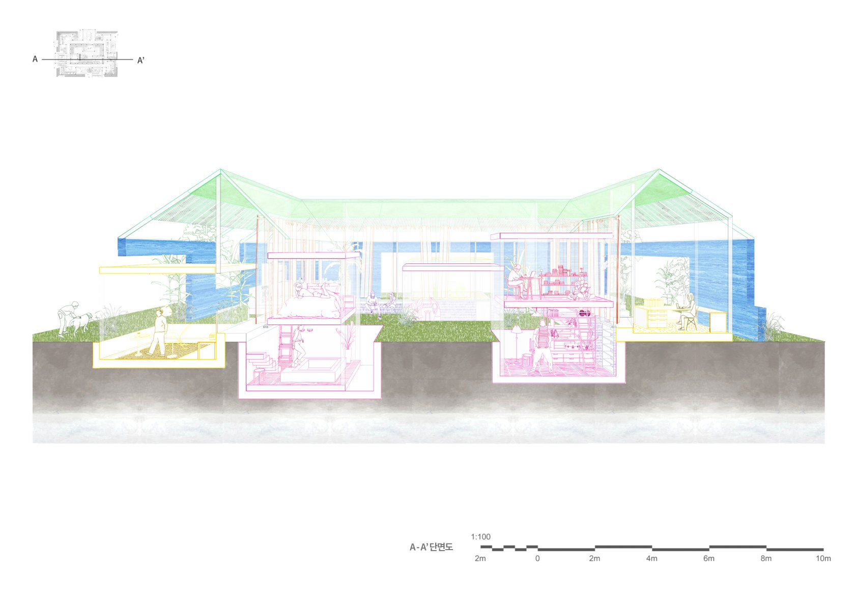 박재용 정유정 조예원 기본적으로 개인적인 시간도 필요하고 생산적인 활동도 하는 사람으로 생각하고 만들었다. 평면에서 그게 가장 잘 드러나는데 다른 사람들과 커뮤니티를 이루기도 하고, 자기가 만든 작업물을 전시하거나 생산활동을 하는 공간도 있고, 사적인 영역에서는 개인적으로 생각을 깊게 할 수 있는, 혼자만의 시간이 필요한, 여러가지 방면으로 에너지를 발산하고 싶은 사람이 살 것이라 생각했다. 가족 구성원이 사는 집이라고 생각하지는 않았다.