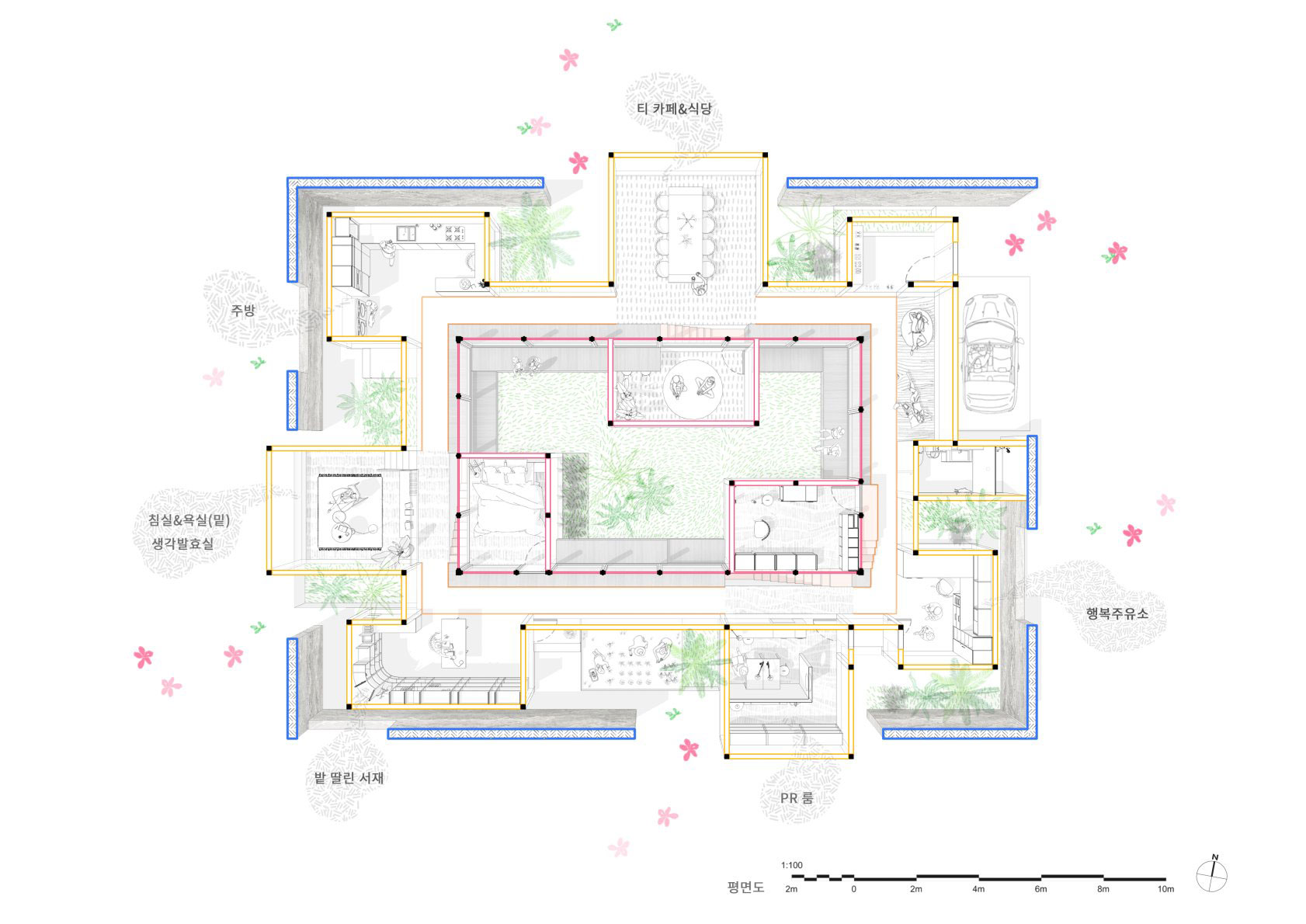 주거도 작은 세상이다. 벽으로 나누는 것이 아니라 주변으로 열린 다양한 높낮이의 공간을 생성하면 제각기 알아서 공간화되고 그것들이 가람을 이루며 하나의 이야기를 만들어 나갈 것이다.