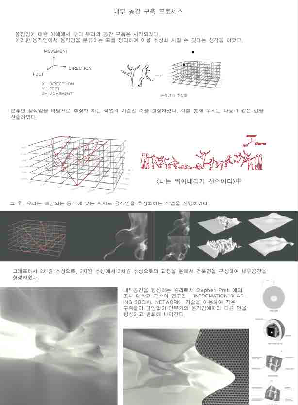 그녀와의 인터뷰를 토대로 그녀는 어떠한 제약에서도 스스로 자유로워지고자 했다. 공간은 그녀의 움직임에 어떠한 선입견도 불어넣지 않으려 공간에 익명성을 부여하고, 공간의 중심을 파악하기 어렵게 하고자 했다. 그리고 공간의 방향성을 제거함으로써 어떠한 공간 전체가 부여하는 방향성이 없도록 하였다. 우리는 무엇보다 안무가의 동작과 대화하는 공간을 구성하기 위하여, 분석된 공간을 구성하기 위하여 분석된 동작을 바탕으로 추상화하는 작업을 통해 건축적으로 표현해야 한다는 생각에 이르렀다. 따라서 그녀의 동작을 2차원 선으로 분석하는 작업을 진행하였다. 2차원으로 추상화된 값을 바탕으로 움직임을 3차원으로 치환하는 과정을 거친다. 이로써 동작을 분석하여 얻은 값으로 익명이었던 벽면에 움직임을 부여하여 안무가 김정수와 공간이 대화하도록 했다. 3D 분석 값의 면들을 가지고 공간을 구성함으로써 안무가의 움직임으로부터 응답하는 공간을 구성하였다. 모든 것이 배제된 무의 공간에서 안무가는 공간이라는 감각과 끊임없이 대화하며 자신의 춤을 춘다. 이 공간을 통하여 안무가 자신이 완전히 공간과 소통하기를 바라며, 춤이 곧 삶이라는 그녀의 이야기대로 춤으로서의 대화에 완전히 몰입하는 공간이 되기를 바란다.