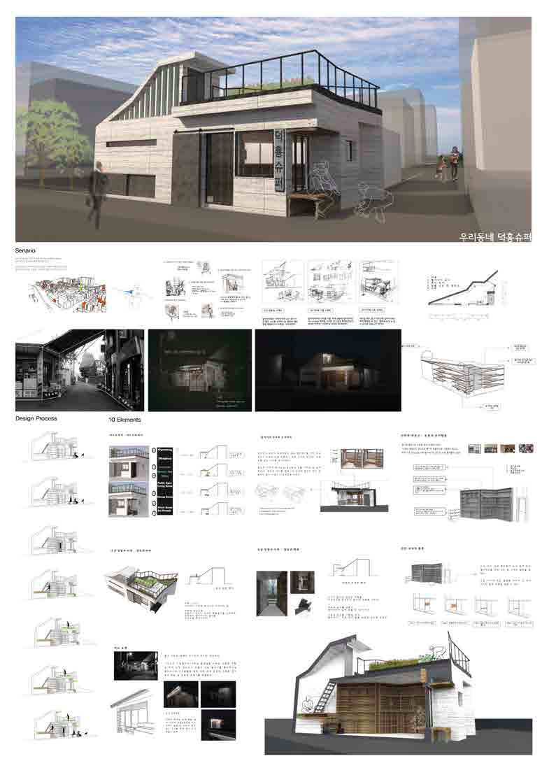 세상은 꾸준히 변한다. 기술의 변화, 유행의 변화 등 계속해서 변화하며 새로운 것들이 나타난다. 하지만 그것들 사이에서도 변하지 않는 것은 사람들과의 소통인 것 같다. 할아버지는 오래도록 덕흥 슈퍼에서 동네 사람들과 소통하며 살아 오셨다. 그런 할아버지를 위해 가게 안에서의 취미생활도 즐기실 수 있도록, 친구 분들과도 편하게 이야기 나누시며 술 한잔 하실 수 있도록 슈퍼를 재구성해보았다. 하나하나의 요소들이 각자의 역할을 하며 할아버지의 생활을 좀 더 윤택하게 만들어 드릴 것이다. 그리고 덕흥 슈퍼는 변화해가는 사회 속에서 사라지지 않고 꾸준히 소통할 수 있는 장소로 남아있을 것이다.