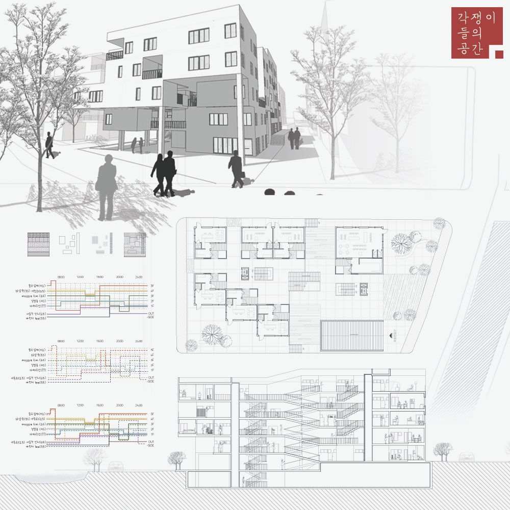 본래 각은 모서리를 뜻하는 것으로, 서로 다른 두 개 이상의 면이 만나는 접점으로 접근성이 높다. 이러한 모서리의 장점을 살리고 채광이나 환기와 같은 환경적인 불리함을 극복하기 위한 ‘각’ 공간을 만들어 공유와 교류의 공간으로 전환하고자 했다.