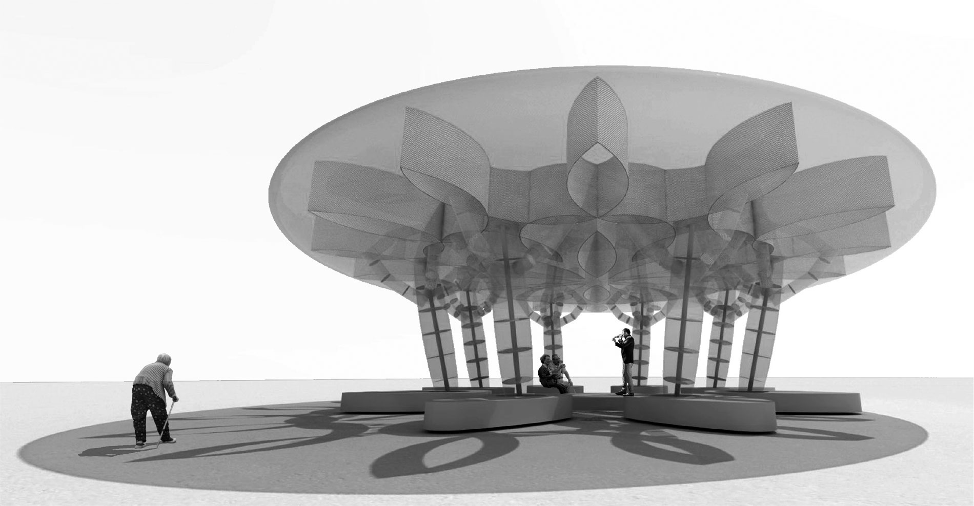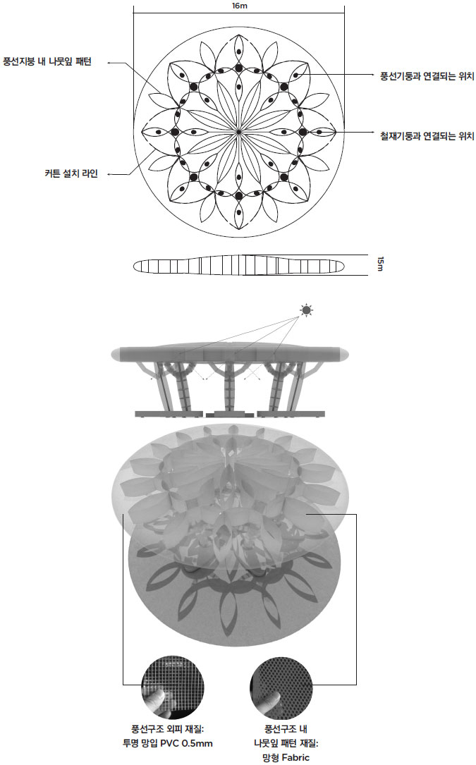 하루 동안의 지역 커뮤니티 행사를 위해 반나절 만에 파빌리온을 설치하고, 행사 후 이를 바로 철수할 수 있어야 한다는 조건이 있었다. 본 계획안은 이를 수월하게 하기 위하여, 풍선구조로 계획했다. 시골 마을 어귀에서 볼 수 있는 정자나무가 모티브가 되었는데, 풍선구조의 특성상 일정한 형상을 이루기 위하여, 팽창을 잡아주는 풍선 내부의 직물(fabric) 부재를 투과성이 있는 녹색 망사로 채용했고 나뭇잎의 패턴으로 직조했다. 이 망사는 직사광선을 확산시키는 루버(louver) 역할도 한다. 그리고 나무 형상을 한 각각의 기둥은 가변성이 있는 8개의 타원형 평상에 고정되는데, 이는 풍선구조의 취약점인 외풍에 대하여 무게추 역할을 하기도 한다. 평상의 배치 패턴에 따라 7가지의 행사 모드를 수용할 수 있게 계획했다.