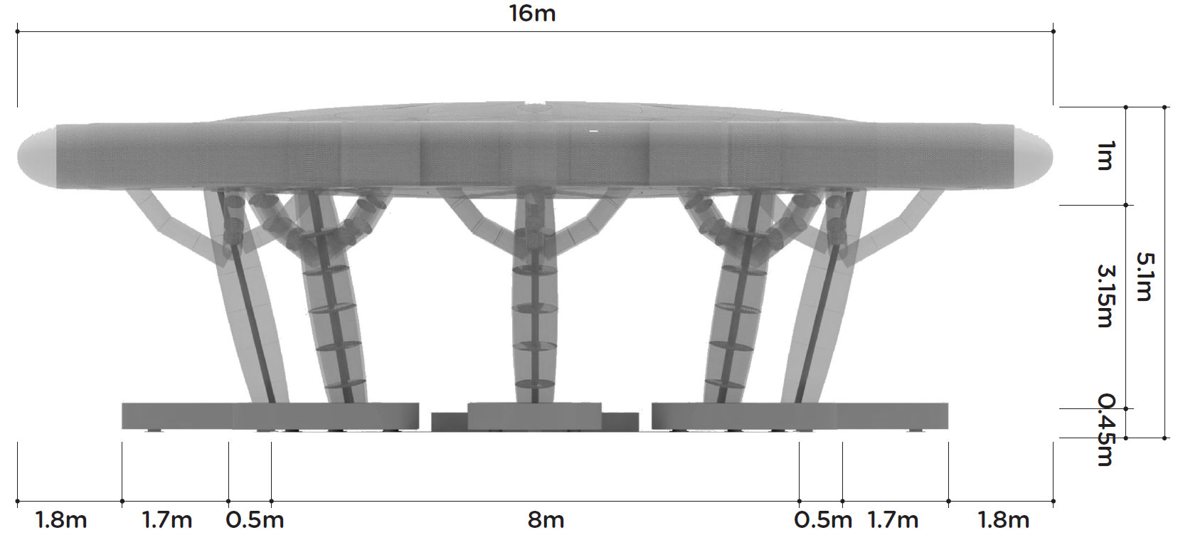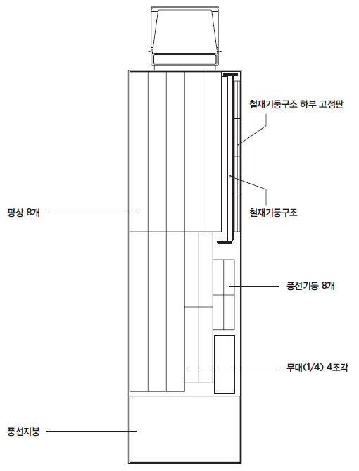 김광수 이 풍선구조 자체의 무게는 약 150kg으로 추산되며, 압축된 풍선의 볼륨은 1 m3 정도로서 송풍기를 통해 공기를 주입하여 최종 형상이 이루어지는 데 단 10여 분의 시간이 걸리고, 공기를 빼는 데는 30분 정도의 시간이 소요됩니다. 30~40명의 관객을 수용하는 행사 시설로는 대단히 용이한 이동성과 설치 시간을 확보할 수 있습니다. 8개의 평상은 일단 조립식이고, 분절되어 이동되고 현장에서 조립되는 형식입니다. 평상의 무게는 가볍게 만들 수도 있지만, 평상 하나에 120kg정도를 생각했습니다. 왜냐하면 풍선구조의 취약점은 바람에 많이 흔들릴 수 있고 심하면 날아갈 수도 있기 때문입니다. 바닥에 앵커를 박을 수도 있지만 일단 하루만 설치하는 임시 구조물이고 어디에 설치가 될지 모르기 때문에 그 점은 조심스러웠습니다. 그 대신 파빌리온에 놓일 8개의 평상이 무게중심이 되면 좋을 것 같았고 풍선 제작 업체에서도 120kg에 상당하는 8개의 물체라면 충분히 풍하중에 대한 지탱이 가능하다고 해서 평상의 무게를 그렇게 설정했습니다.