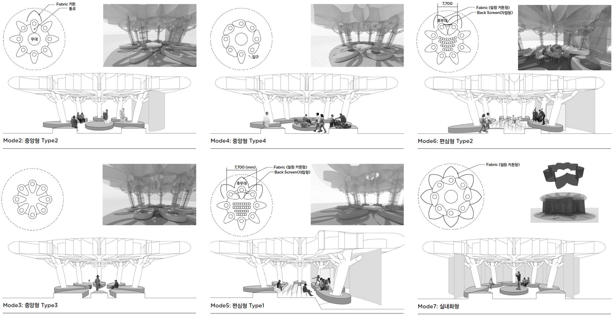 가변성이 있는 8개 평상의 배치와 무대의 위치에 따라 그리고 실내화 여부에 따라 결정되는 7개의 사용모드는, 크게 중앙형 무대와 편심형 무대를 기본으로 한다. 편심형 무대는 커튼 구조의 설치에 의한 후무대를 준비실로 사용할 수 있게 했다. 또한 각 평상은 좀 더 자유로운 관람석의 역할을 할 수 있으며, 평상의 배치 방식에 따라 진입 지점을 컨트롤 할 수 있다. 평상은 공연 행사뿐만 아니라 기타 교류나 전시대 혹은 판매물의 가판대와 같은 역할을 하기도 하는 다목적의 용도이다.