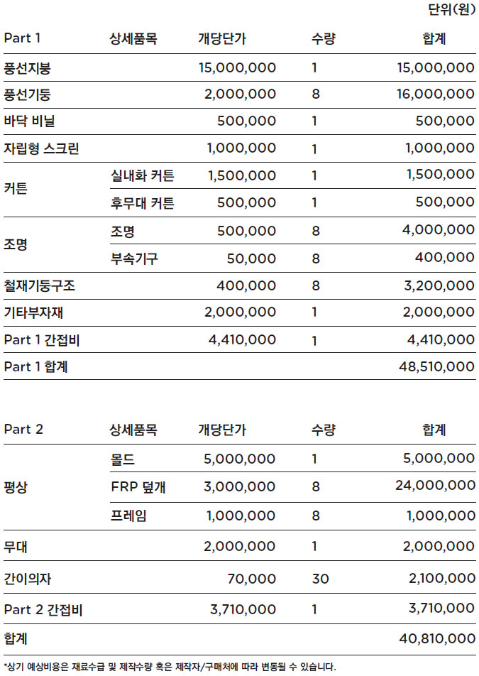 김광수 가장 힘든 부분은 시간적 촉박함이었습니다. 하루 안에 장소에 가서 설치를 하고 행사를 하고 다시 철수 해야 한다는 점이었습니다. 이는 만드는 사람으로서는 가장 도전적인 부분이면서 동시에 흥미로운 부분이었습니다. 다른 어떤 조건보다 가장 먼저 해결해야 할 부분이었기에 이 부분부터 어떤 구조적인 방식, 재료와 설치의 방식이 있는지와 그 외의 기타 등등의 생각이 굴비 엮듯이 나오게 된 것 같습니다. 이것을 어떻게 기술적으로 풀 것인가, 어떻게 재료적인 선택들을 해가며 풀 것인가, 그리고 이것을 어떻게 행사라는 보이지 않는 것과 잘 엮어나갈 것인지에 대한 답이 가장 어려웠던 부분인 ‘시간적 촉박함’에 대한 도전에서부터 나온 것 같습니다.