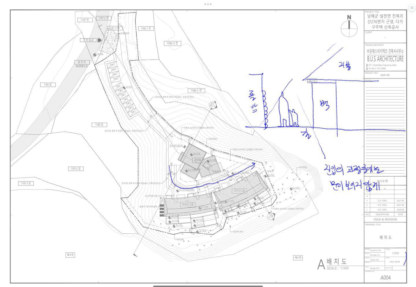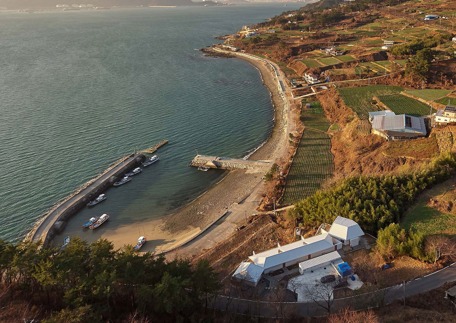 저희는 남해 여여담의 손님이 땅의 초입에 멀찍이 주차를 하고 걸어 들어오면서 소나무, 바다, 집의 풍경을 충분히 보고 들어오면 좋겠다고 생각했습니다. 각각의 집에 진입할 때도 소나무가 얼핏 보였으면 좋겠고, 바다에서 봤을 때도 기존의 풍경이 너무 흐트러지지 않기를 바랐어요.