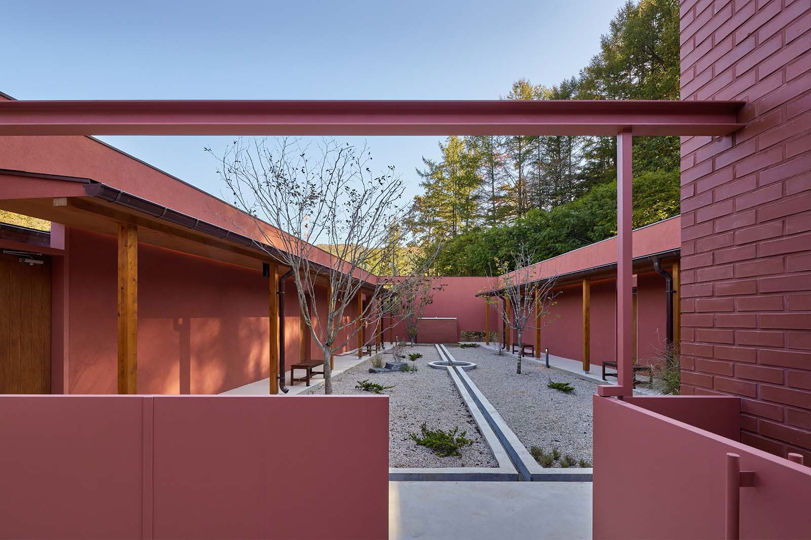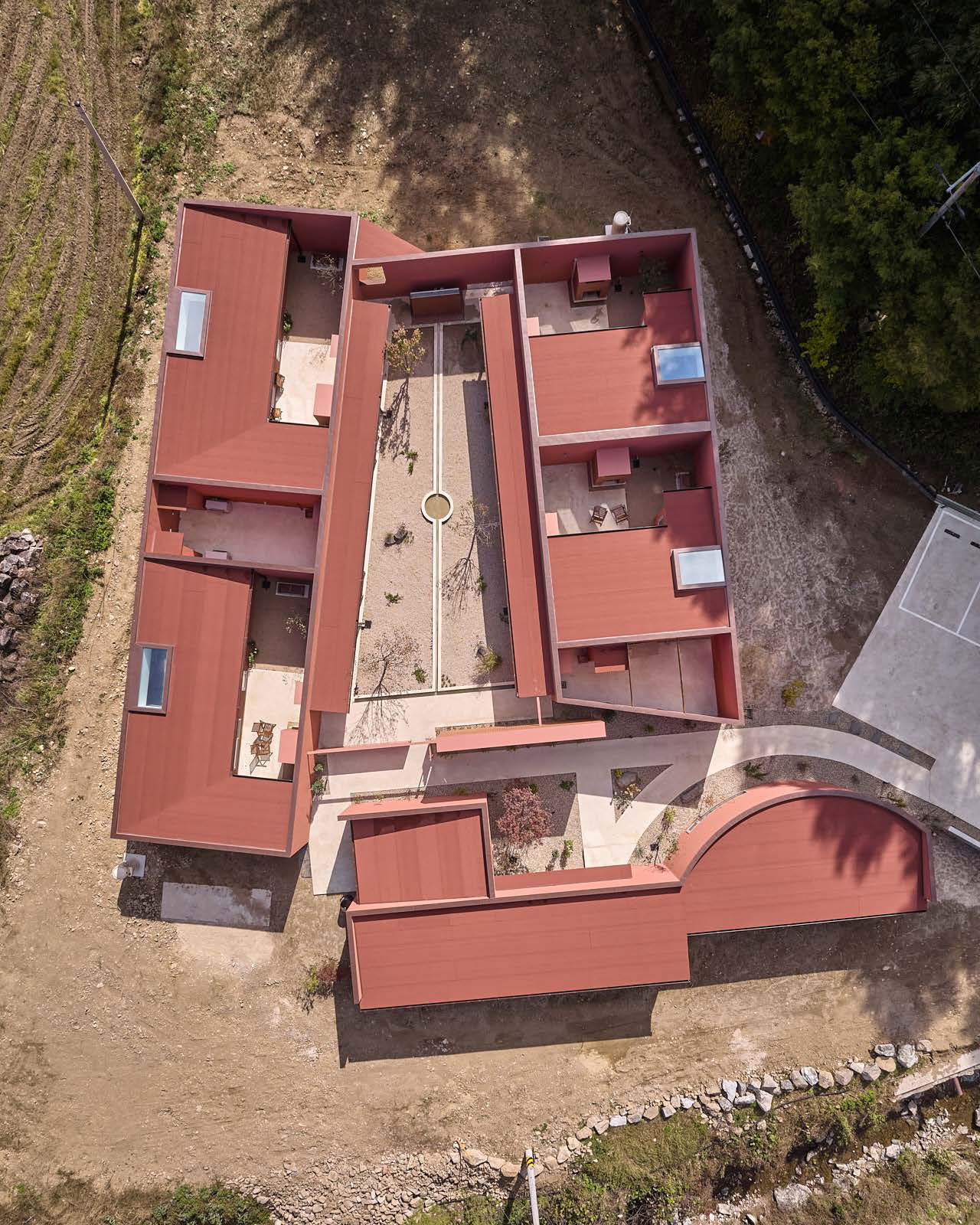 이걸 설계할 때는 스테이라고 생각하지 않았고, 척박한 땅을 개간하고 일구는 선사시대 원주민의 마을을 떠올렸어요. 저희는 이 마을 사람들을 보호하는 공간을 만드는 프로젝트라고 생각했던 것 같아요. 이런 이야기를 건축주에게 굳이 설명하지는 않았고 저희 마음속 한편에 두고 진행했죠. 그러다 보니 중정에서 많은 (마을) 행사가 열릴 수 있을 거라고 상상했어요. 그래서 외부에서 봤을 때는 내향적인 마을 분위기가 되기를 바라며 외부에는 창문이나 개구부가 없도록 계획을 했고요. 지금은 스테이로 쓰이지만, 나중에 이게 다가구 주택이 되면 이상적이겠다는 생각을 했어요. 특히 이 프로젝트 클라이언트는 숙박시설 운영 경험이 있어서 관리에 대한 스트레스가 굉장히 많았어요. 그래서 사용자 경험도 중요하나, 관리자의 관리 동선도 중요하다고 여겨서 처마 공간을 마련하는 등 설계에 반영했습니다.
