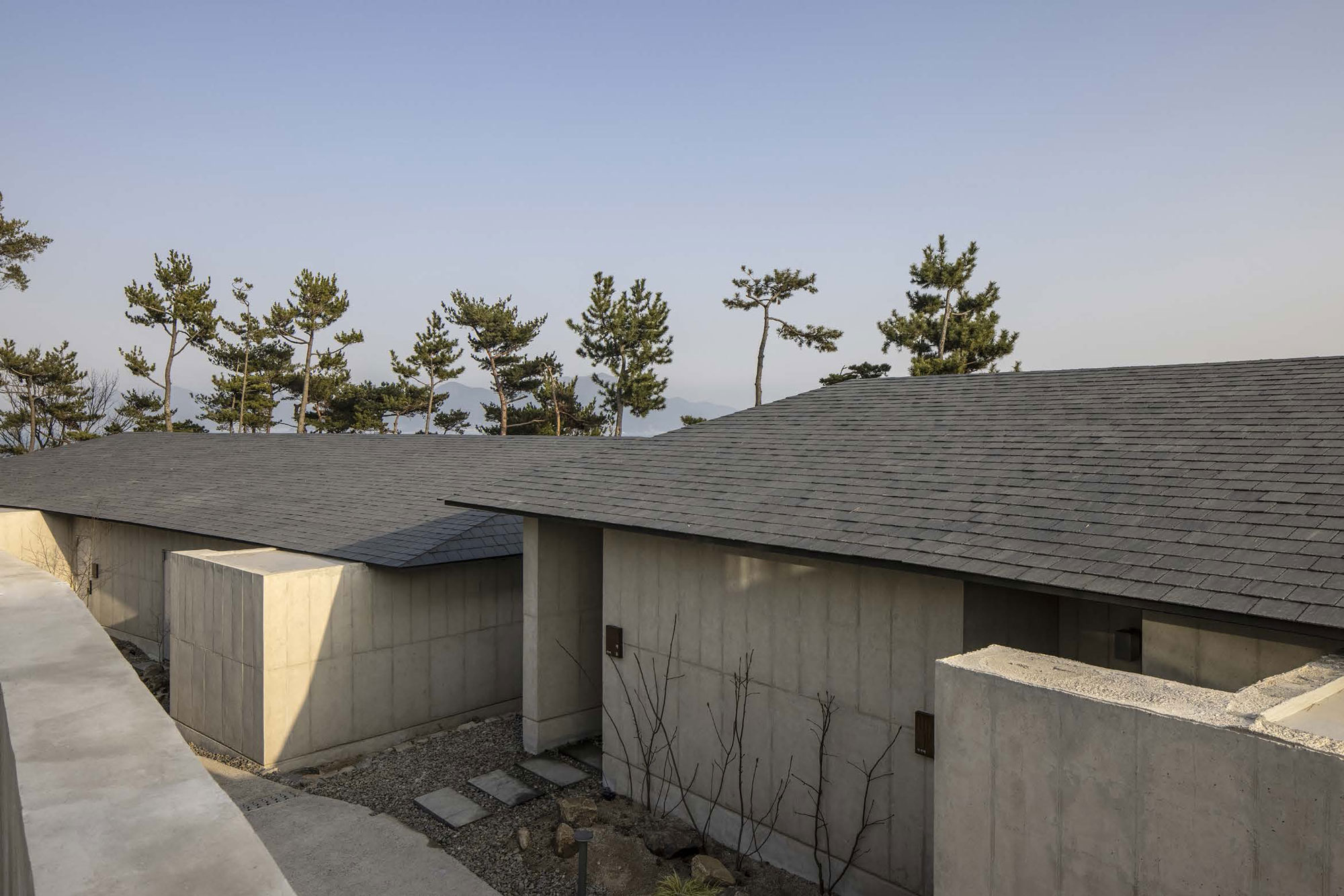 처음에 들어오면 기존에 있는 소나무와 클라이언트의 집이 보입니다. 여기가 지대가 높고 아래쪽에 스테이가 있기 때문에 스테이 지붕의 디테일이 중요했고요. 어떻게 하면 지붕선이 깔끔하게 보일 수 있을지를 고민했던 기억이 납니다. 스테이로 진입하면서 압도적인 자연 풍경을 마주할 때 갑자기 출입문이 등장해서 그 몰입감을 방해하지 않았으면 좋겠다는 생각으로 진입하는 동선에서는 문을 만들지 않으려고 했어요. 그리고 왼편의 거대한 옹벽 스케일을 어떻게 하면 휴먼 스케일로 줄일 수 있을까를 조경가와 함께 많이 논의했습니다. 이상으로 마치겠습니다.