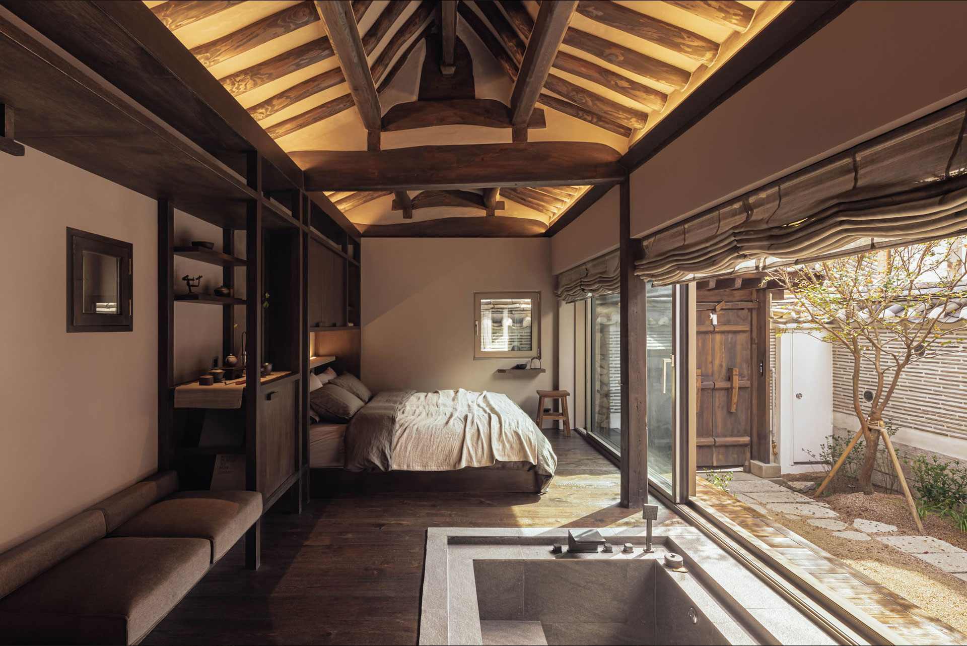 환대의 시퀀스를 맞이하고, 대접하고, 휴식하고, 배웅하는 총 4가지 과정으로 디자인했어요. 대문을 한옥식으로 다시 살려냈습니다. 겉보기에는 작은 한옥이지만 안에 들어가면 넓고 큰 창과 손님을 맞아주는 마당과 라운지가 있고요. 환대의 시퀀스 중에 휴식에 집중할 수 있도록 정말 넓은 침대와 탕을 경험할 수 있는 공간을 만들었고, 다양한 다기, 조명, 그리고 약간의 화분으로 공간을 구성해서 디자인을 했습니다. 저희가 만드는 공간은 대부분 탕이 침대 옆에 있어요. 침대 옆에 목욕탕이 있다는 것 자체가 비일상적이고, 작은 한옥에서 다양한 경험을 풀어내는 장치 중에 하나라고 생각하고 있습니다. 그리고 저희가 중요하게 생각하는 것 중 하나가 방명록입니다. 저희는 꼭 방명록을 만듭니다. 그러면 생각보다 많은 사람들이 방명록을 적어놓고 가요. 거기에는 스테이가 좋았다는 얘기도 있지만, 개인적인 이야기가 많이 담깁니다. 특히 이 공간의 이름이 한옥에세이이다 보니까 이 에세이들이 모여서 하나의 책을 만들어 간다고 생각하기도 했습니다. 1박 2일의 경험을 마치고 배웅의 공간인 마당을 지나 문을 열고 나가면 서촌이 맞아주는 모든 과정을 디자인해서 마무리했습니다.